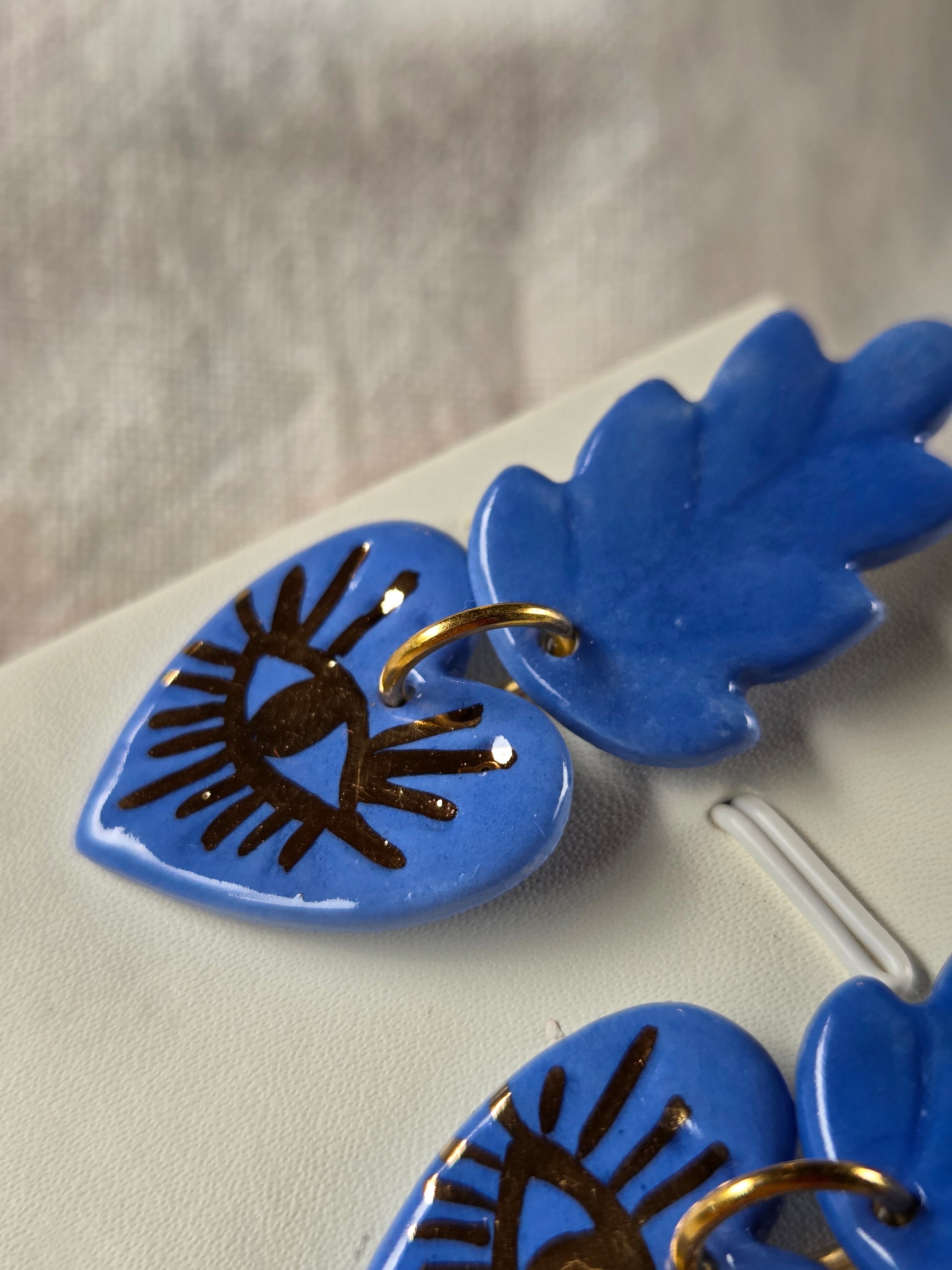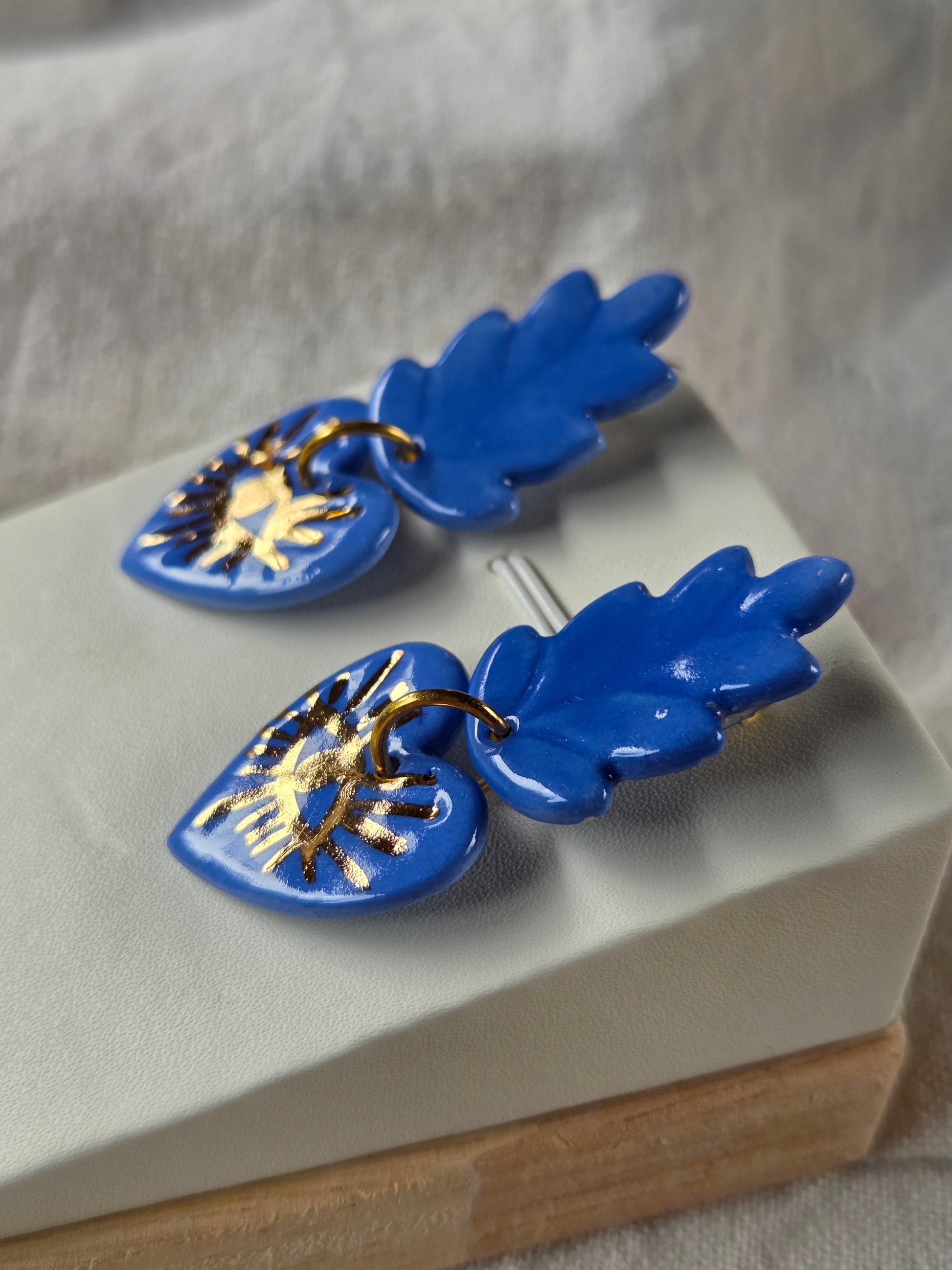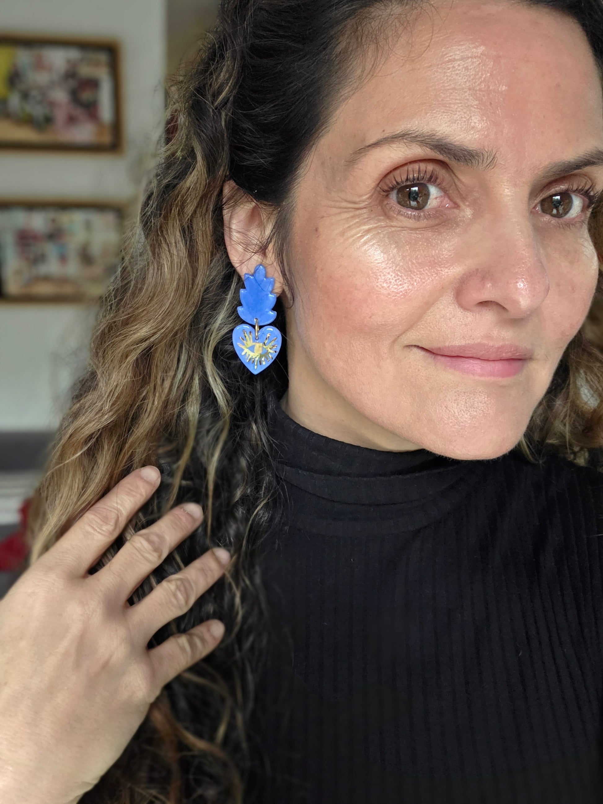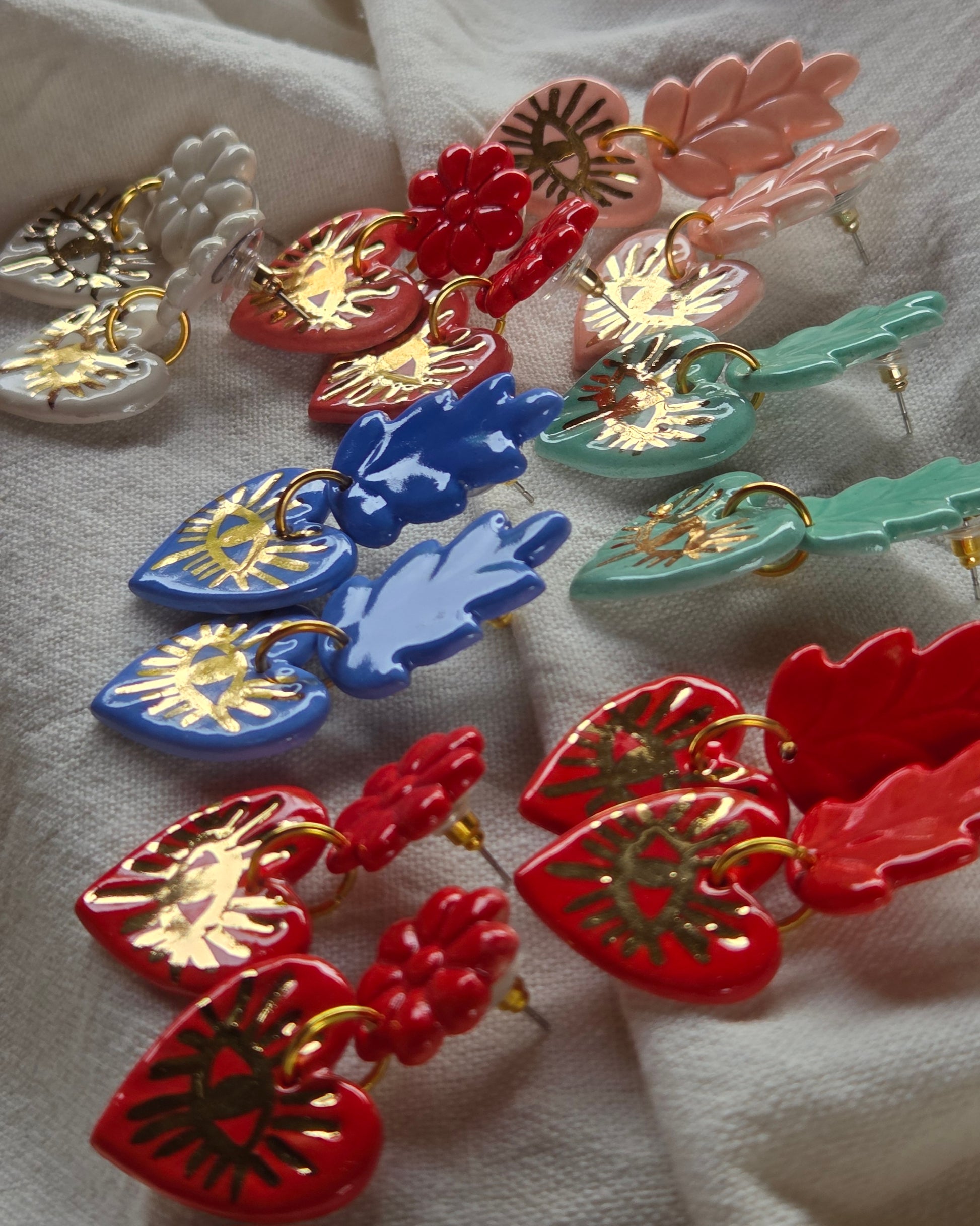 Delicados aros hechos a mano en cerámica esmaltada y lustre de oro, argollas con baño de oro y palito de acero quirúrgico.