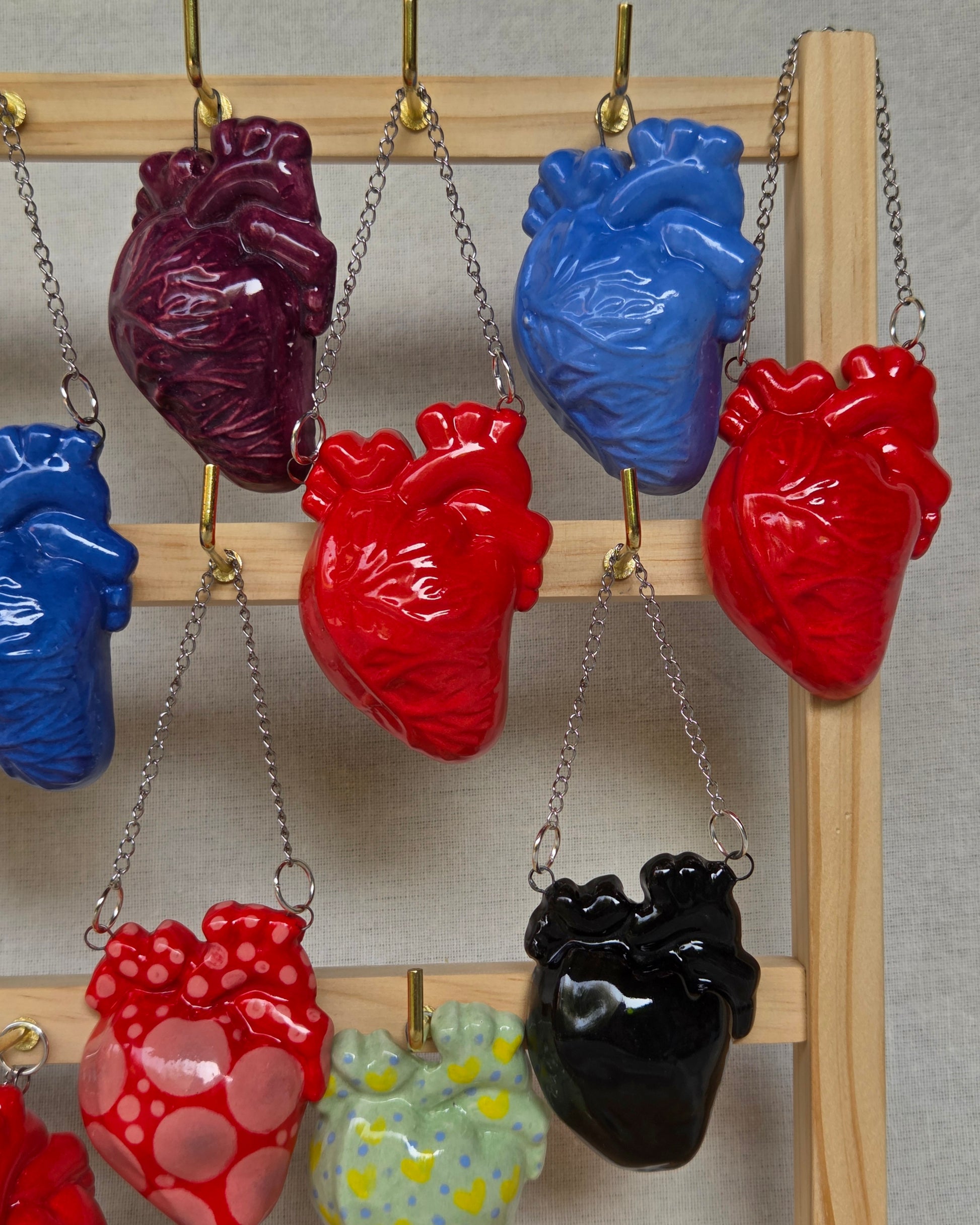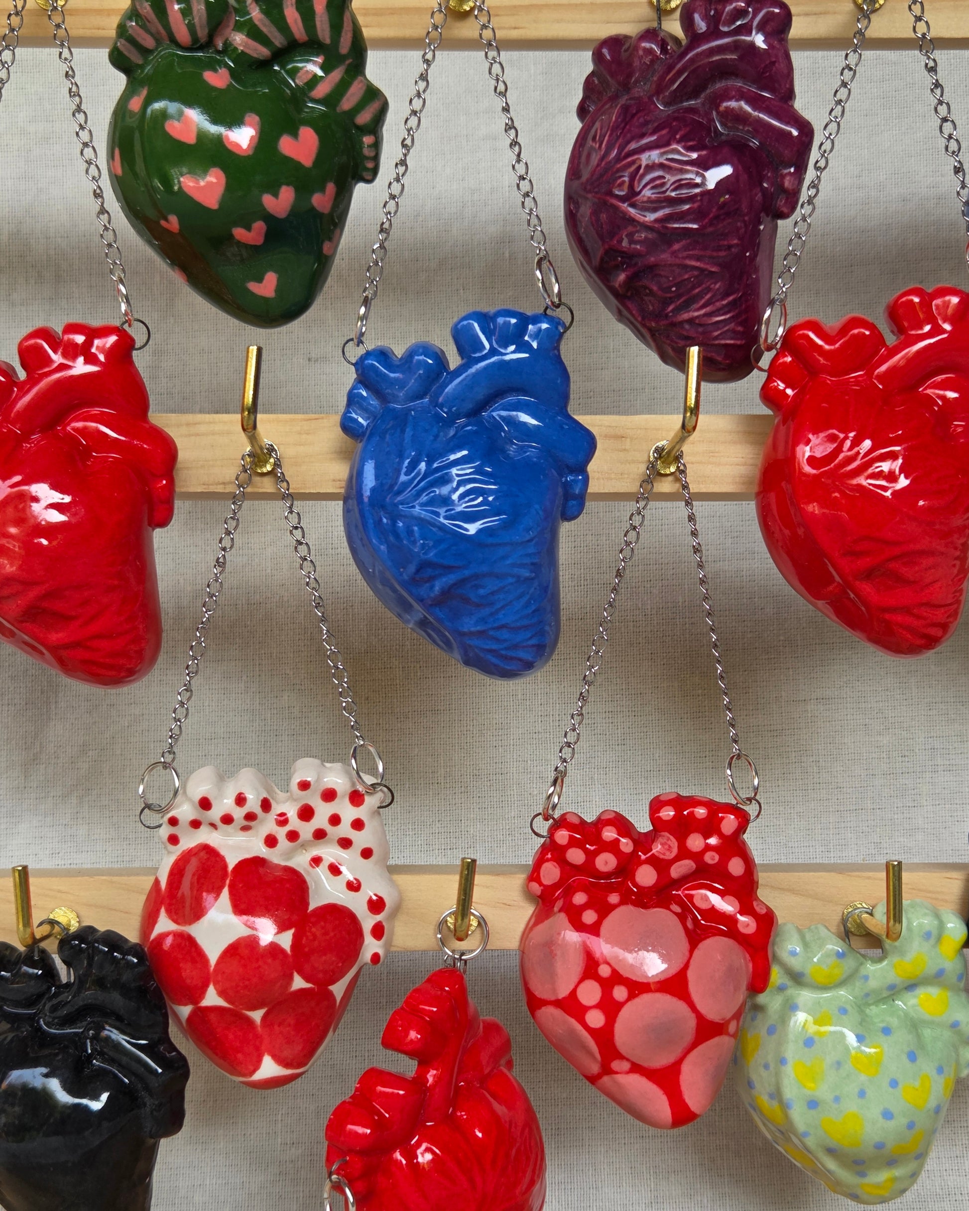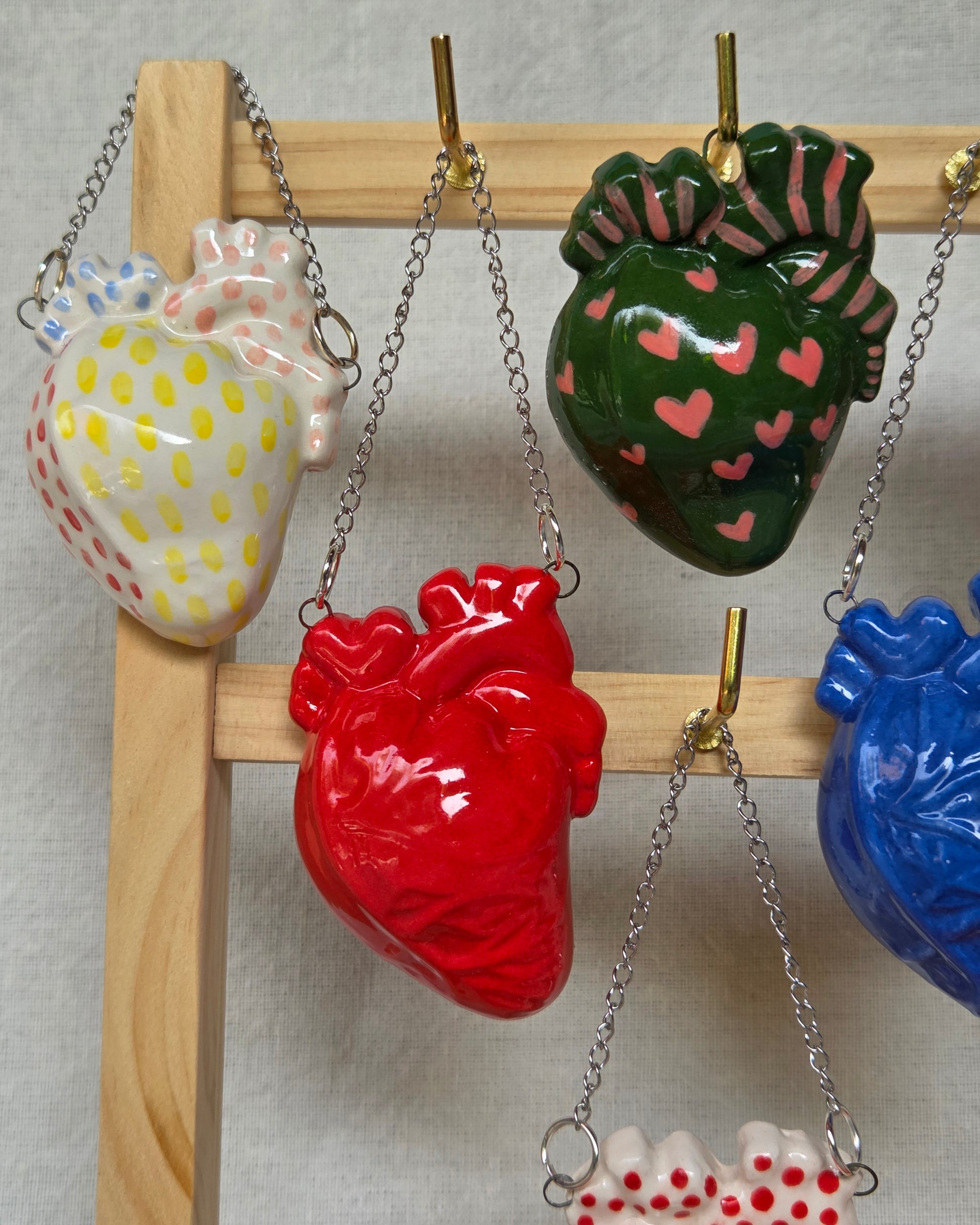 Corazón protector de cerámica pintada y esmaltada hechos en molde casero, con sistema de colada, viene con ganchito o cadenita para colgar.