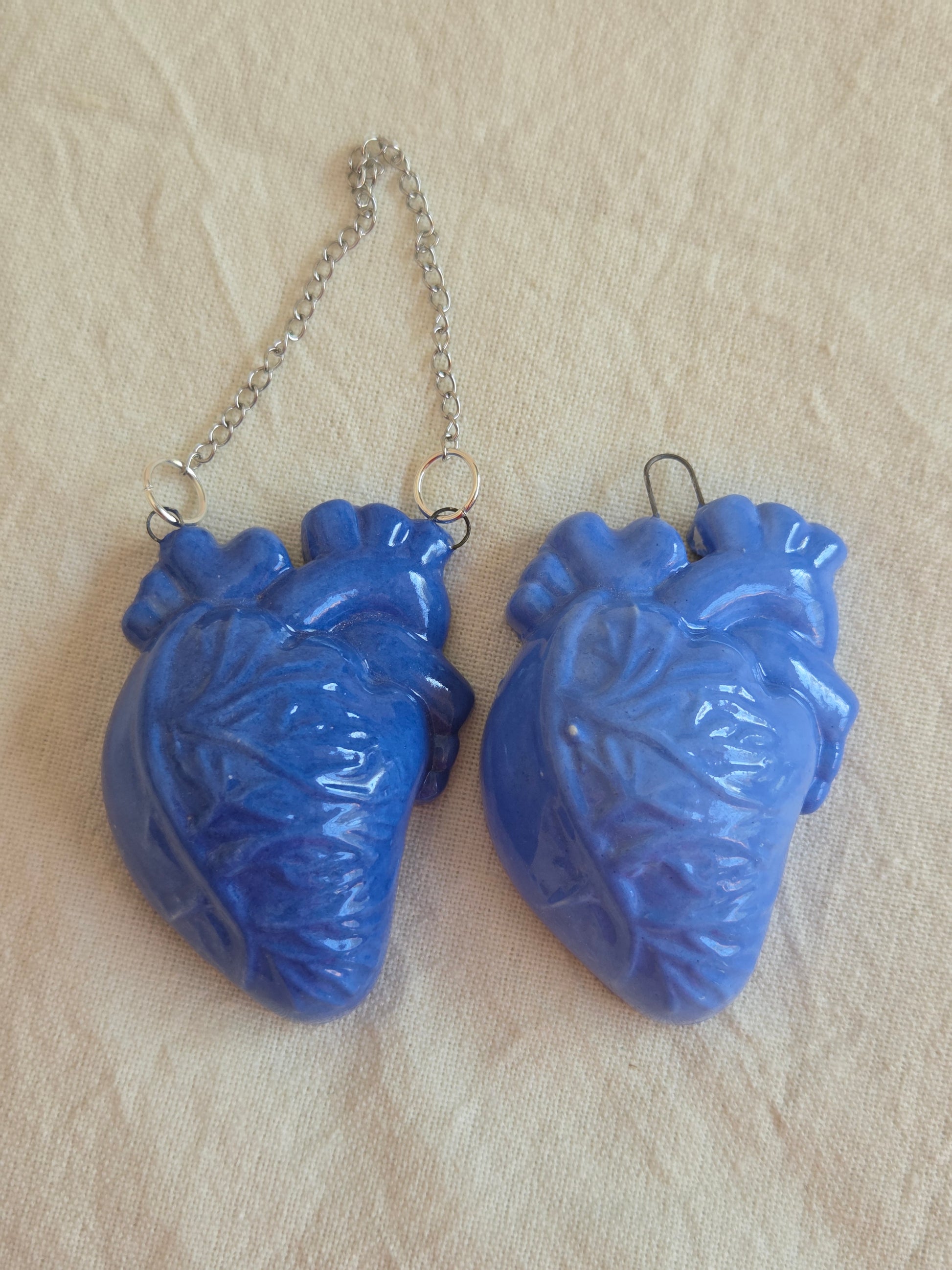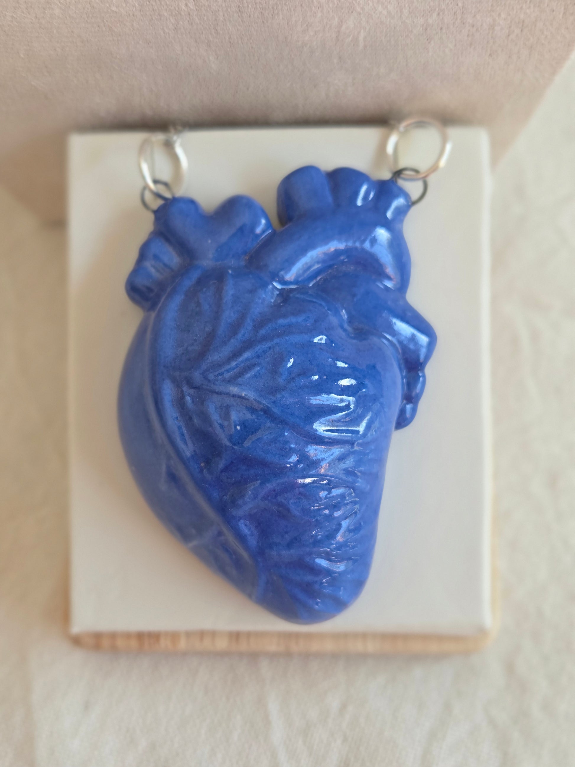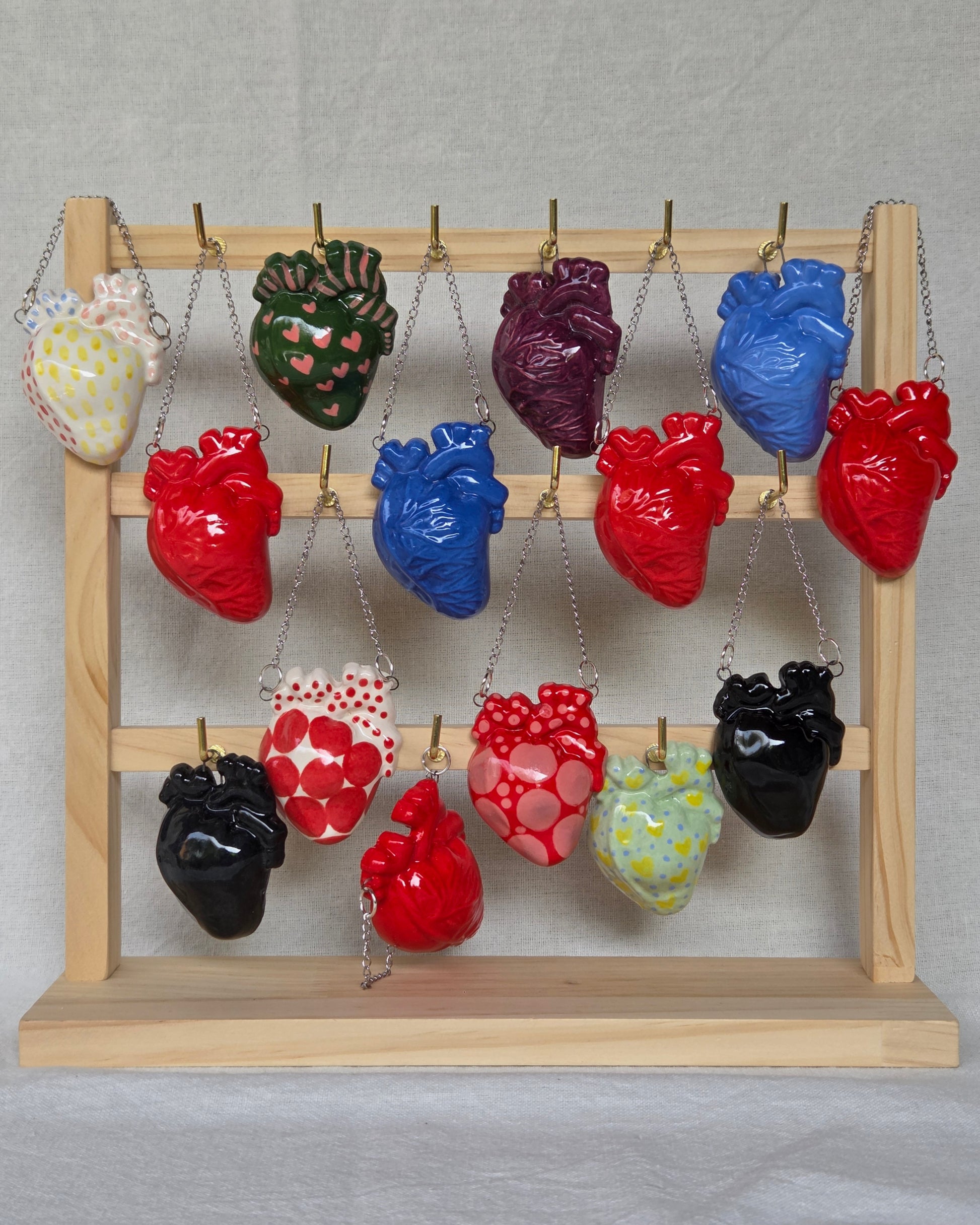 Corazón protector de cerámica pintada y esmaltada hechos en molde casero, con sistema de colada, viene con ganchito o cadenita para colgar.