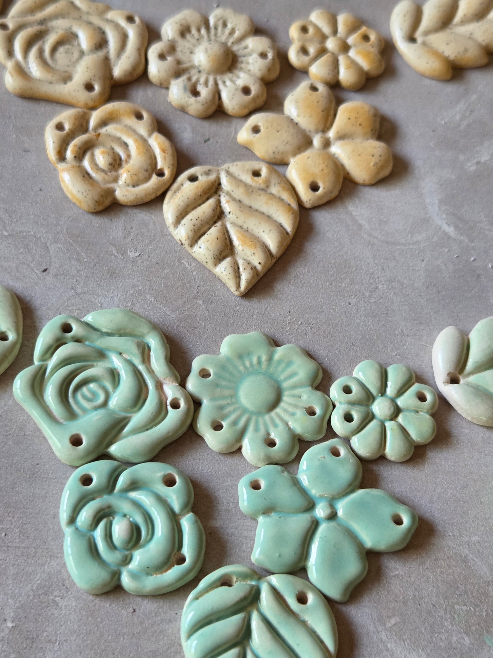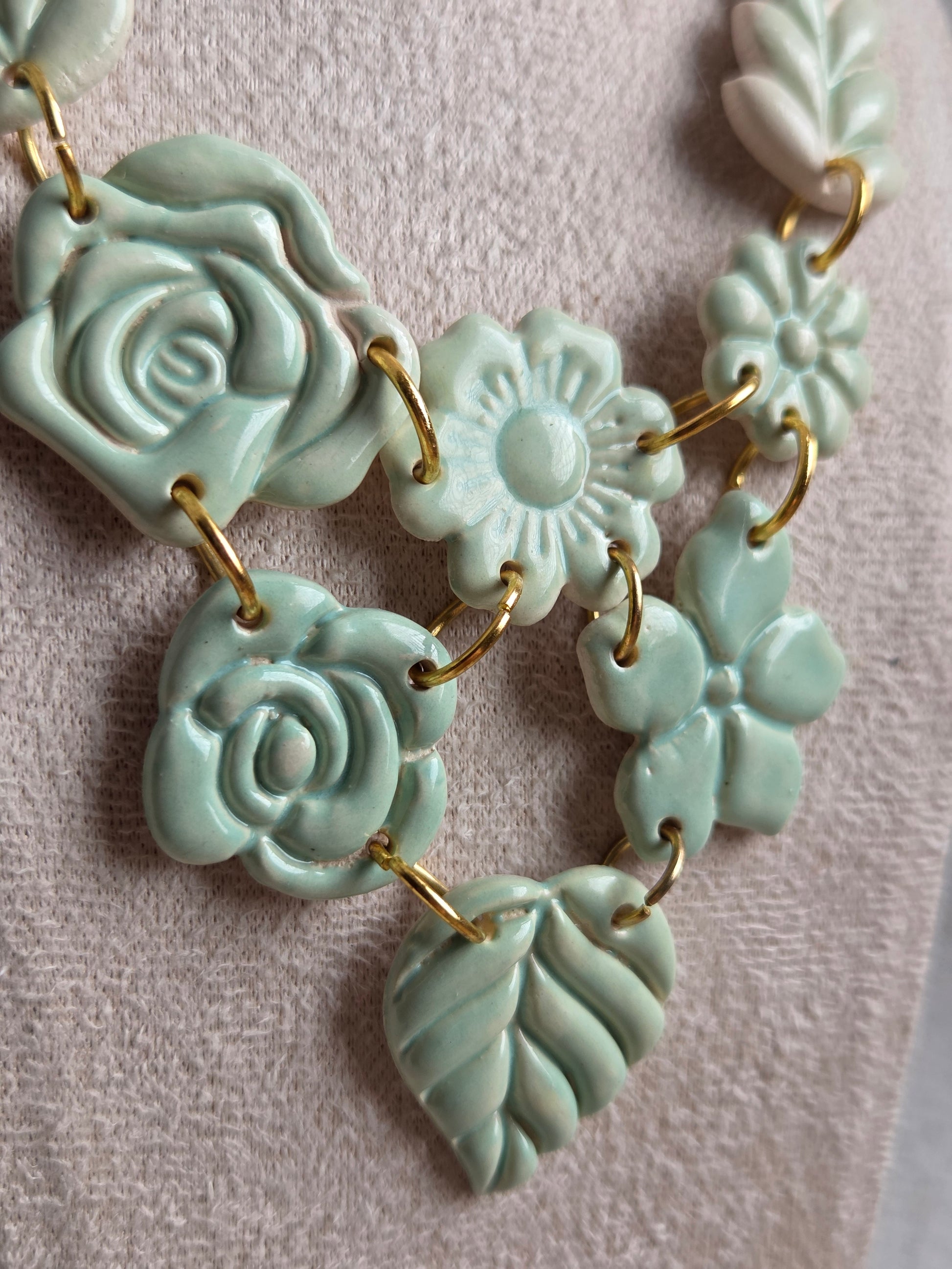 Delicado y hermoso collar de 10 piezas hechos a mano en cerámica esmaltada, argollas con baño de oro y palito de acero quirúrgico.