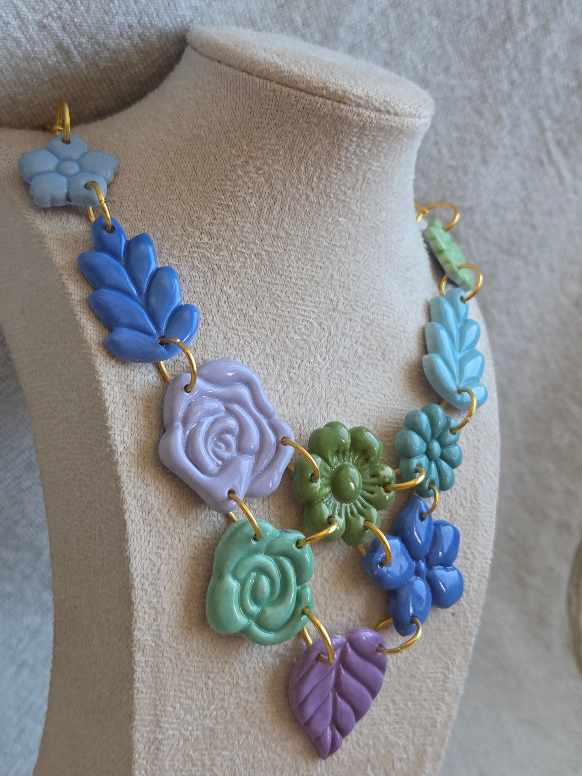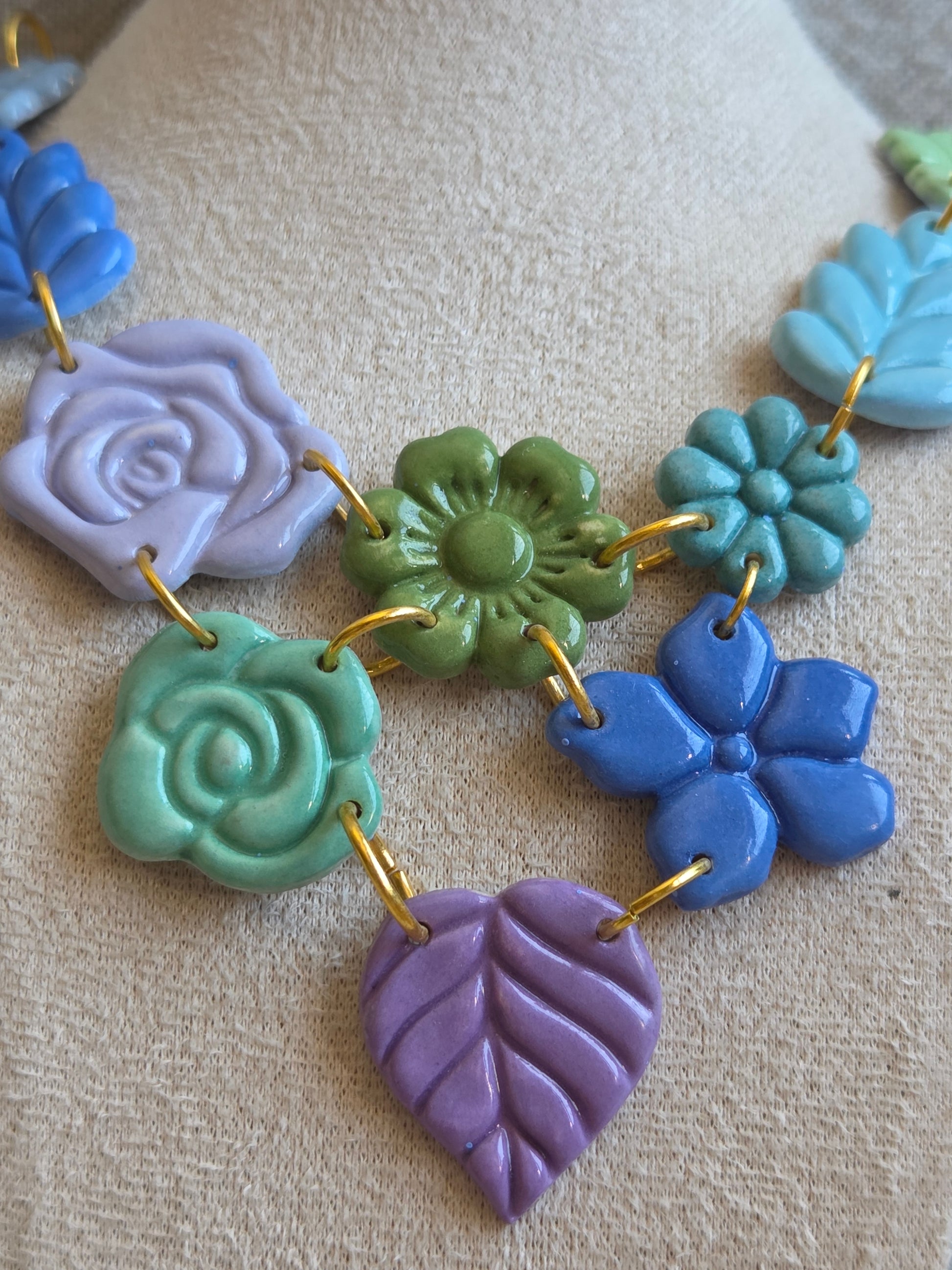 Delicado y hermoso collar de 10 piezas hechos a mano en cerámica esmaltada, argollas con baño de oro y palito de acero quirúrgico.