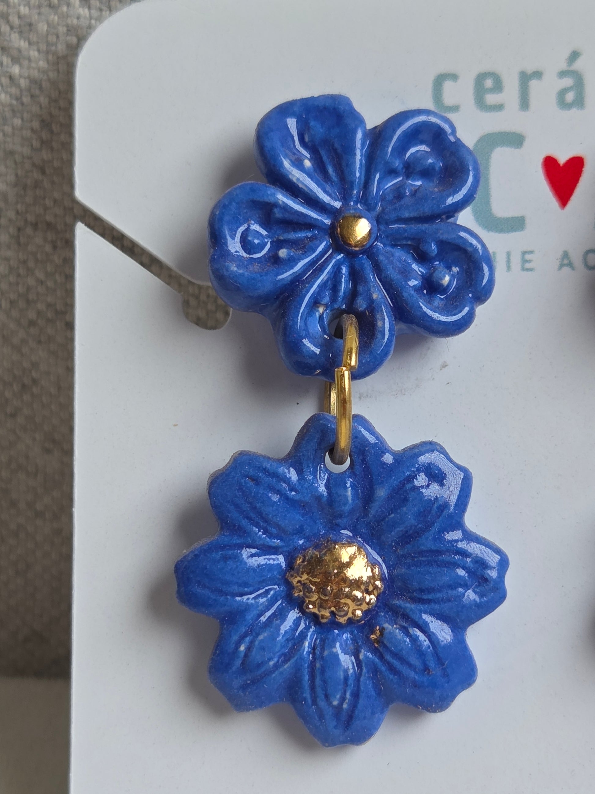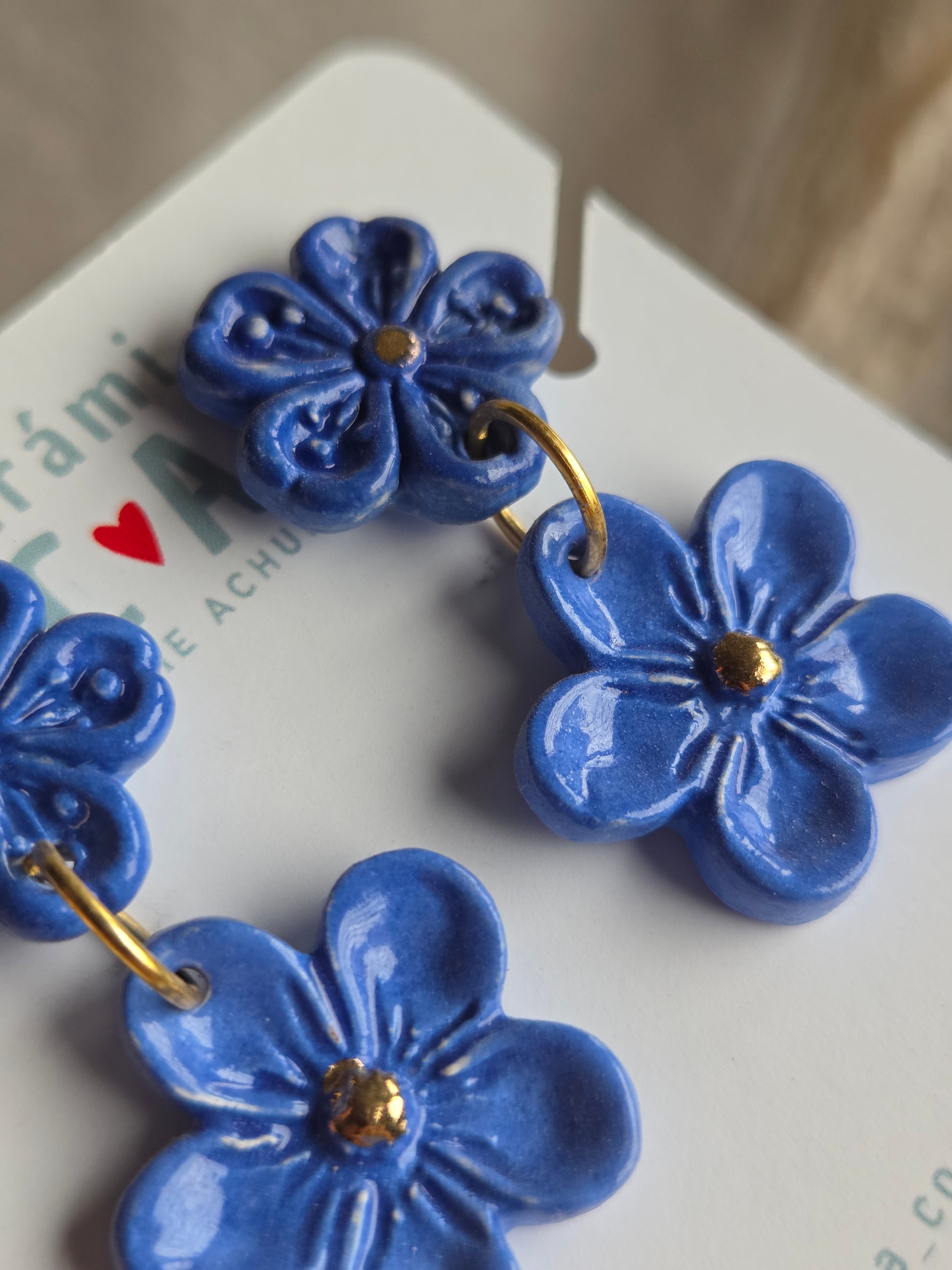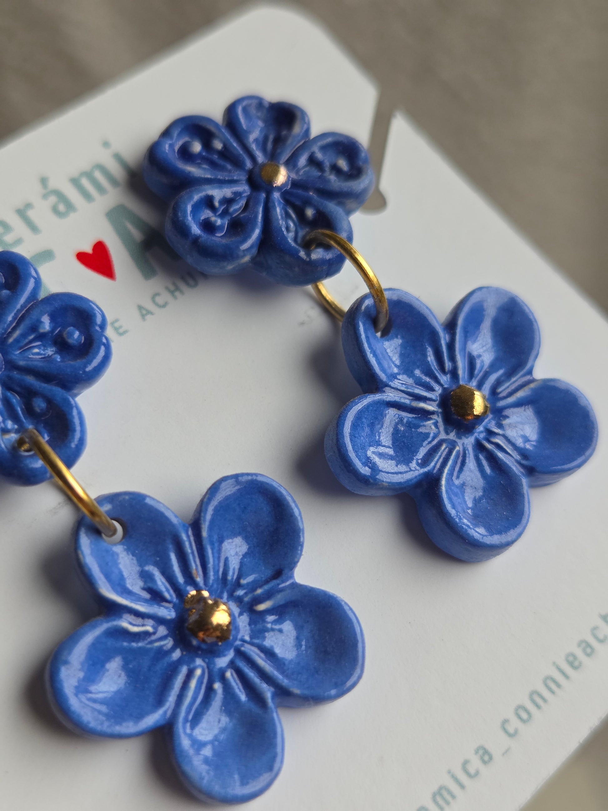 Delicados aros de 2 piezas hechos a mano en cerámica esmaltada y lustre de oro de 18 kilates en tercera quema, argollas con baño de oro y palito de acero quirúrgico.