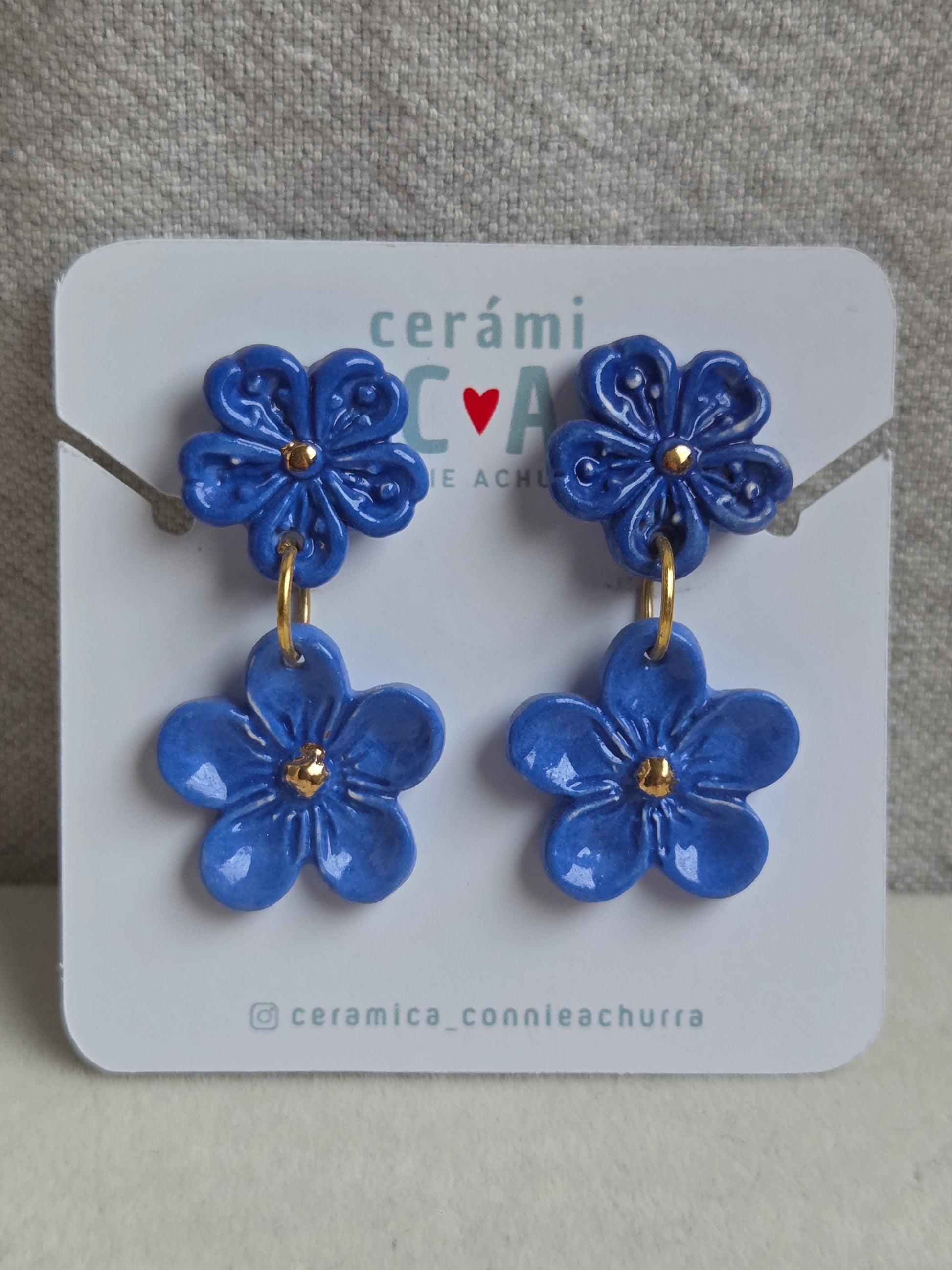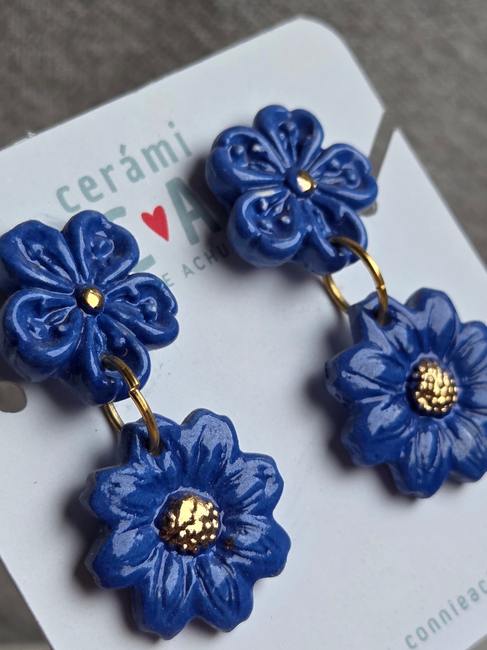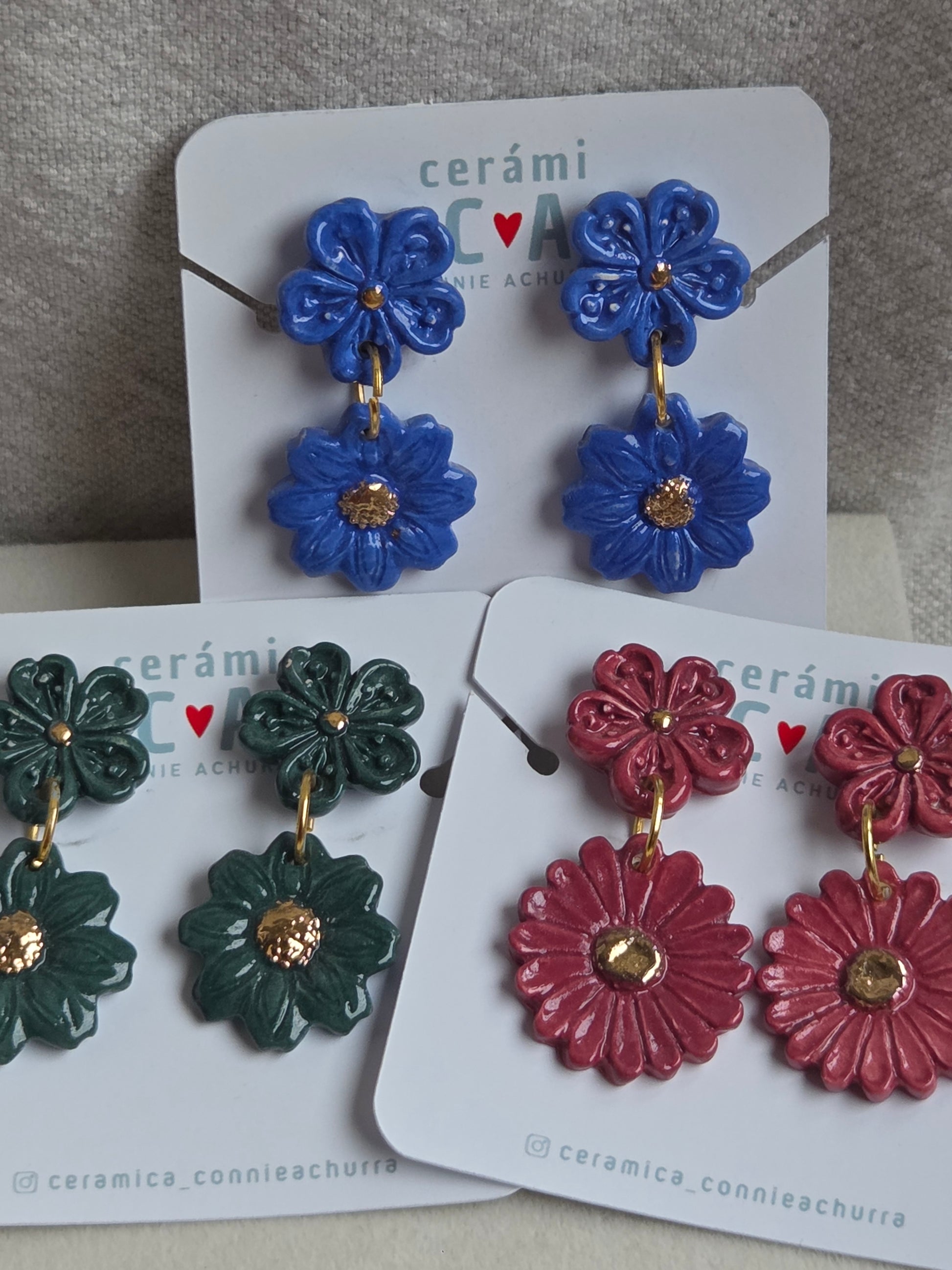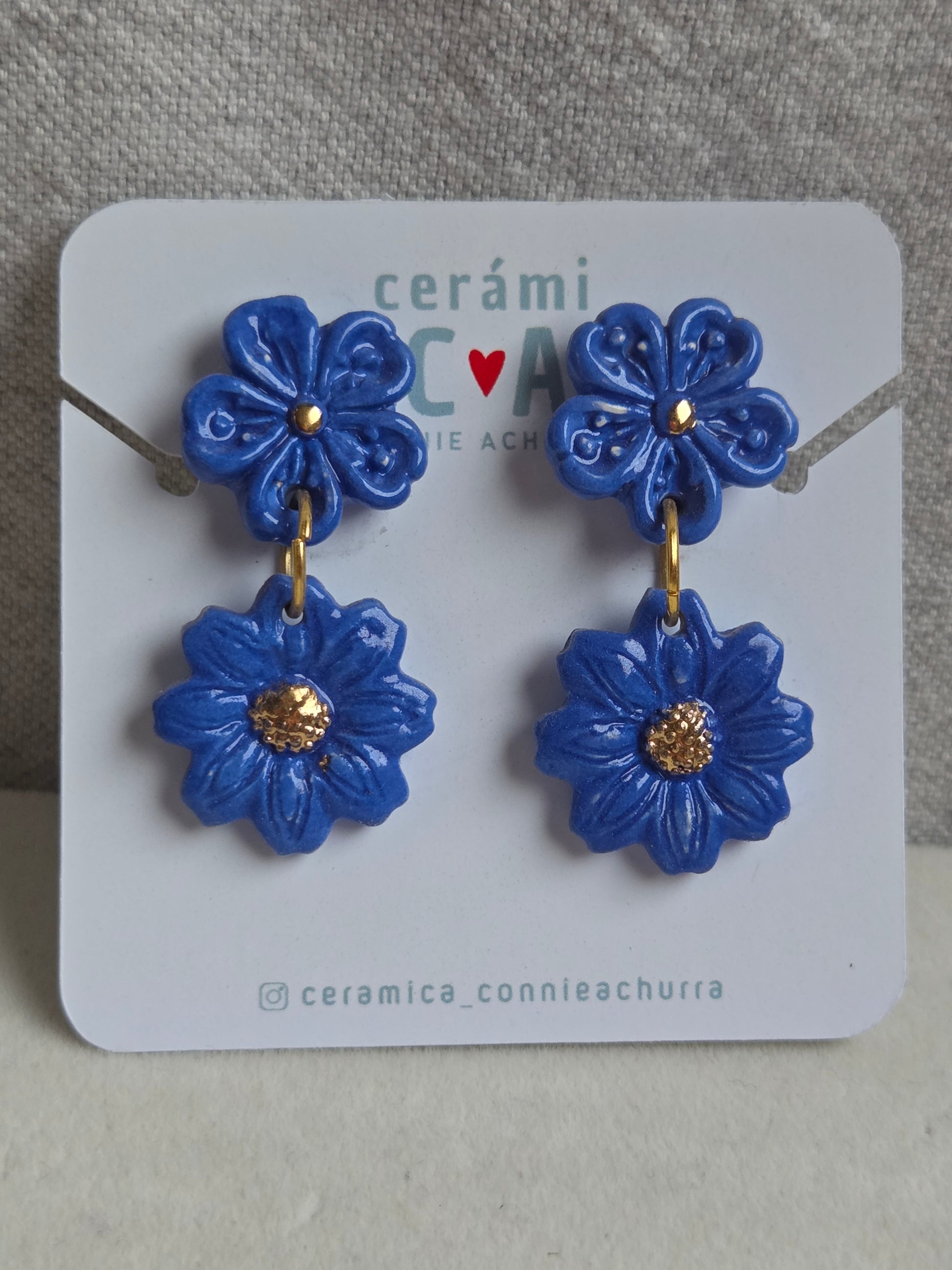 Delicados aros de 2 piezas hechos a mano en cerámica esmaltada y lustre de oro de 18 kilates en tercera quema, argollas con baño de oro y palito de acero quirúrgico.