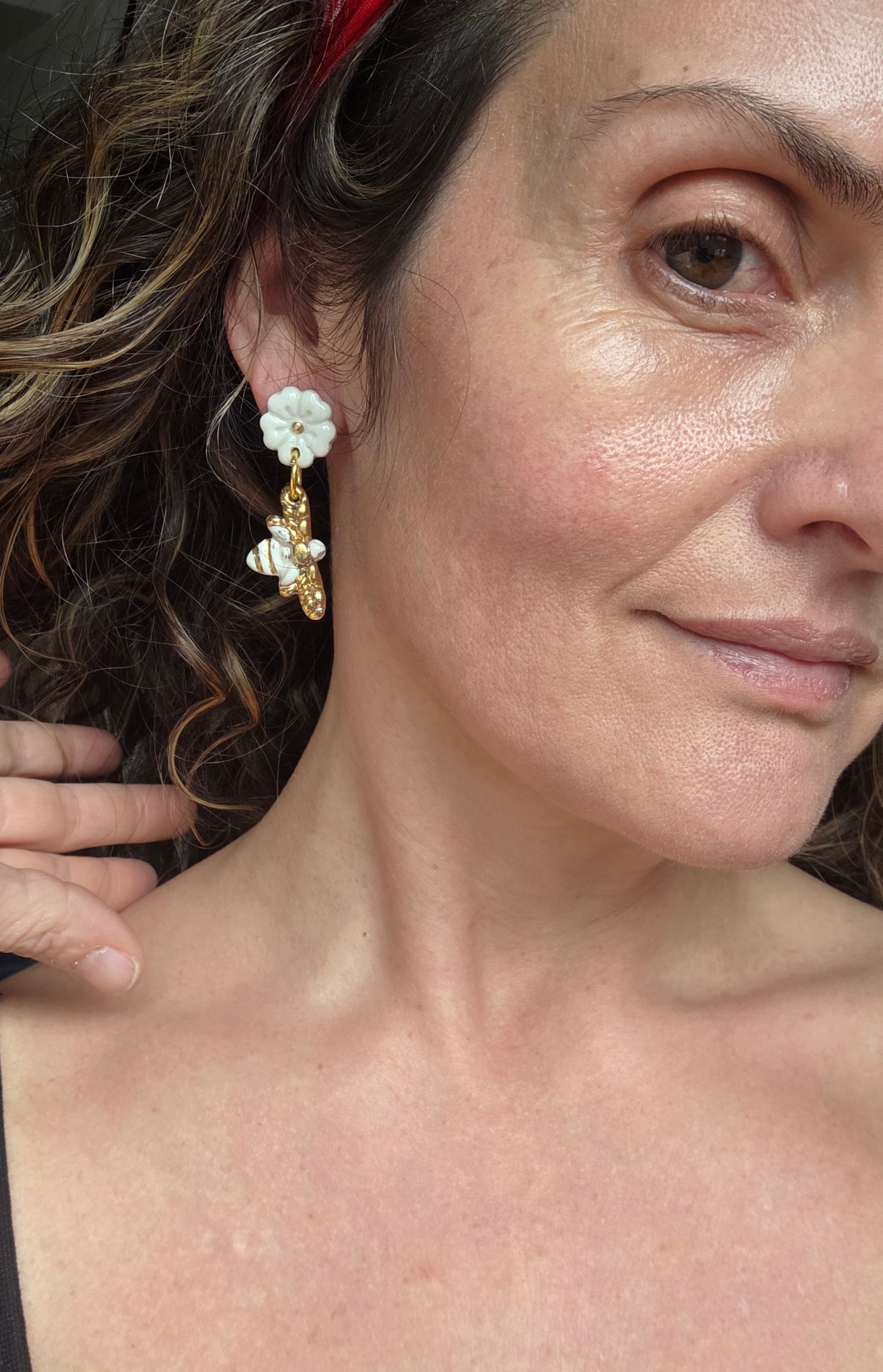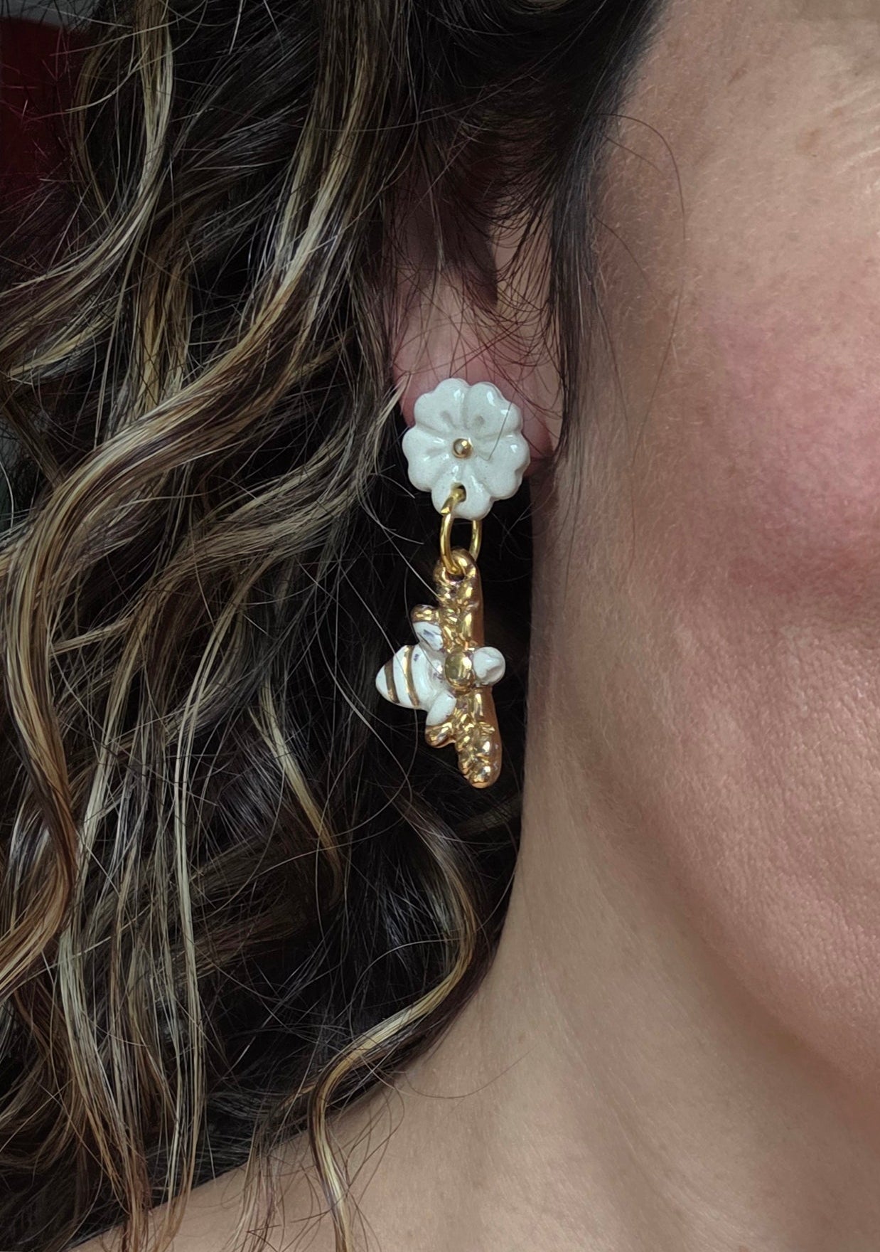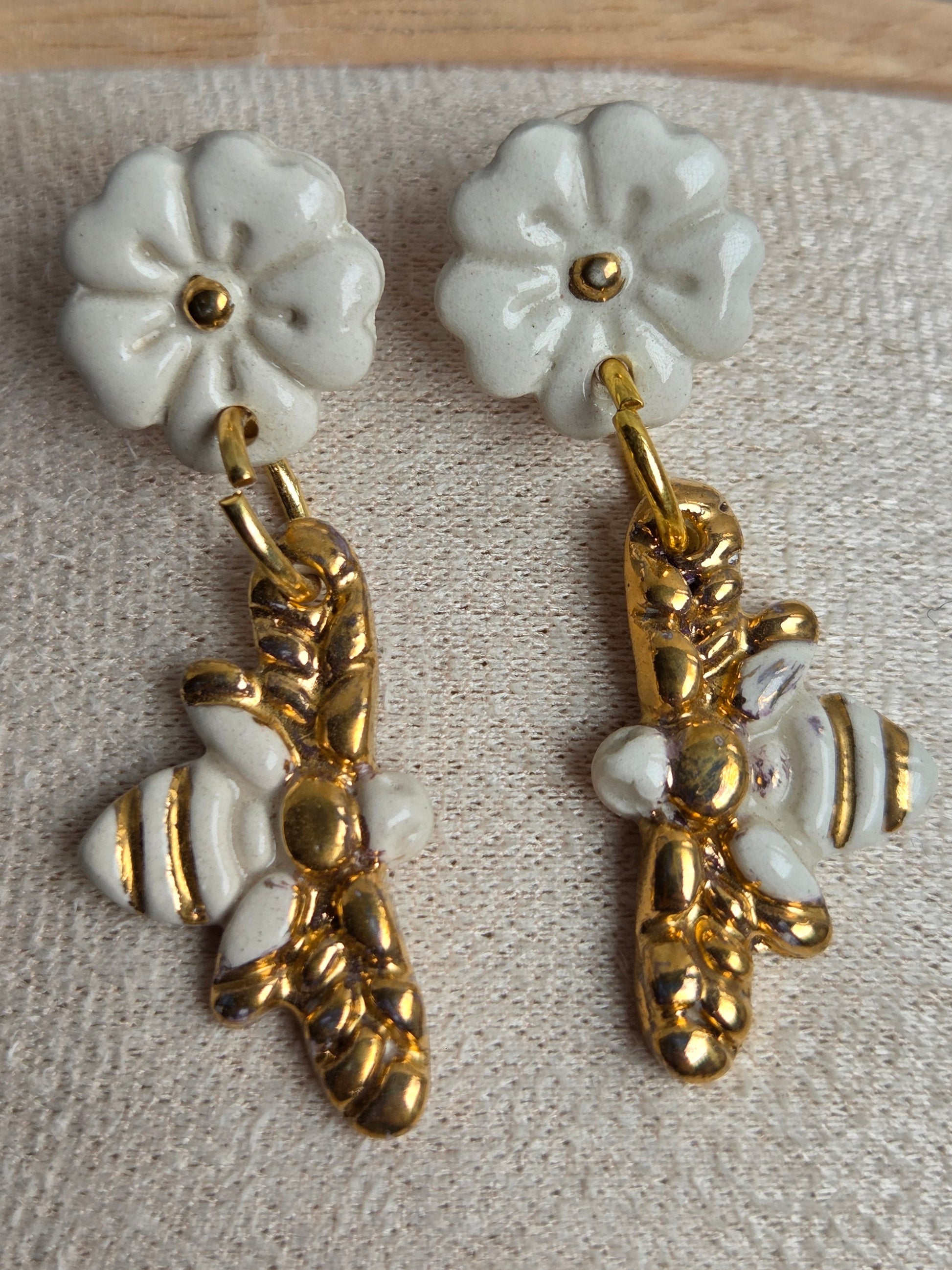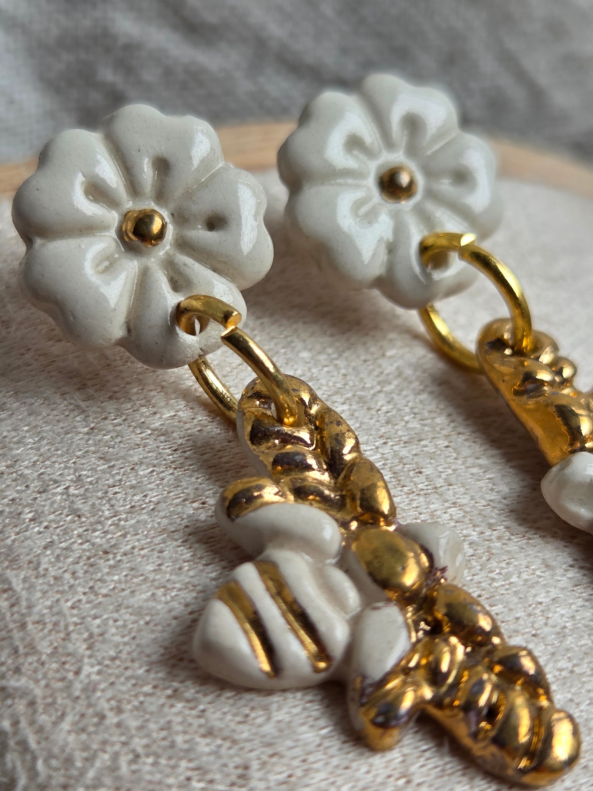 Delicados aros de 2 piezas hechos a mano en cerámica esmaltada y lustre de oro de 18 kilates en tercera quema, argollas con baño de oro y palito de acero quirúrgico.