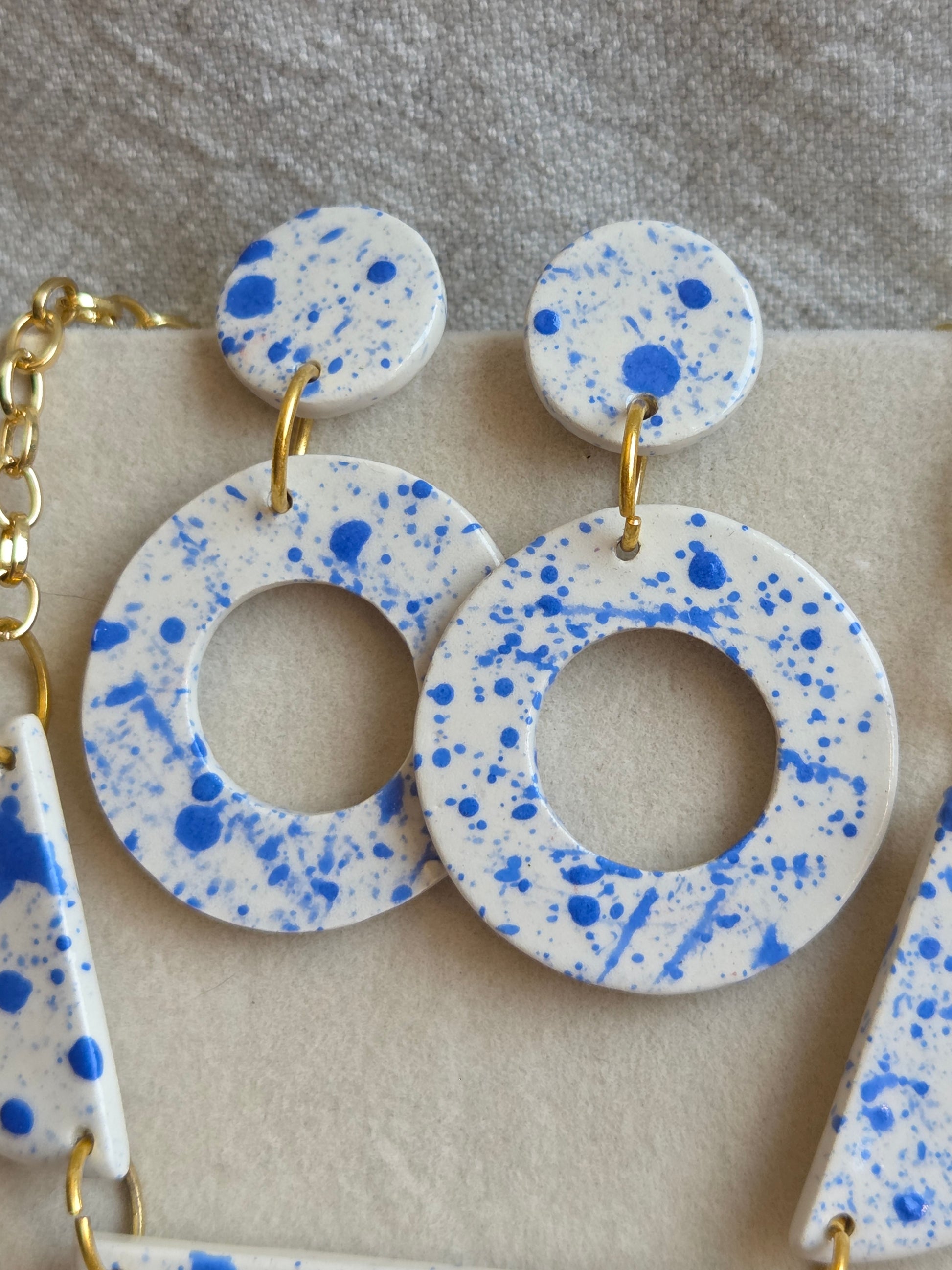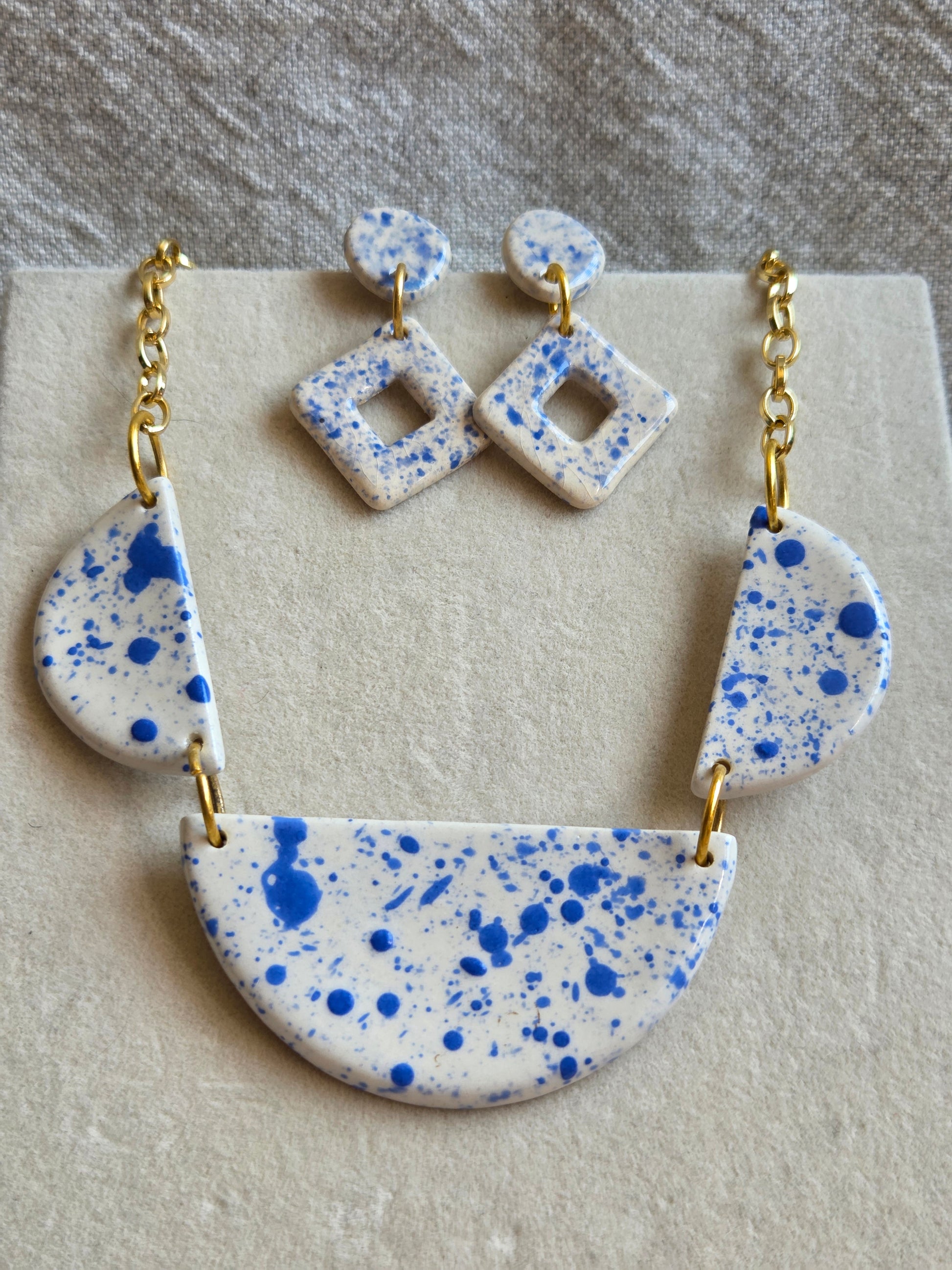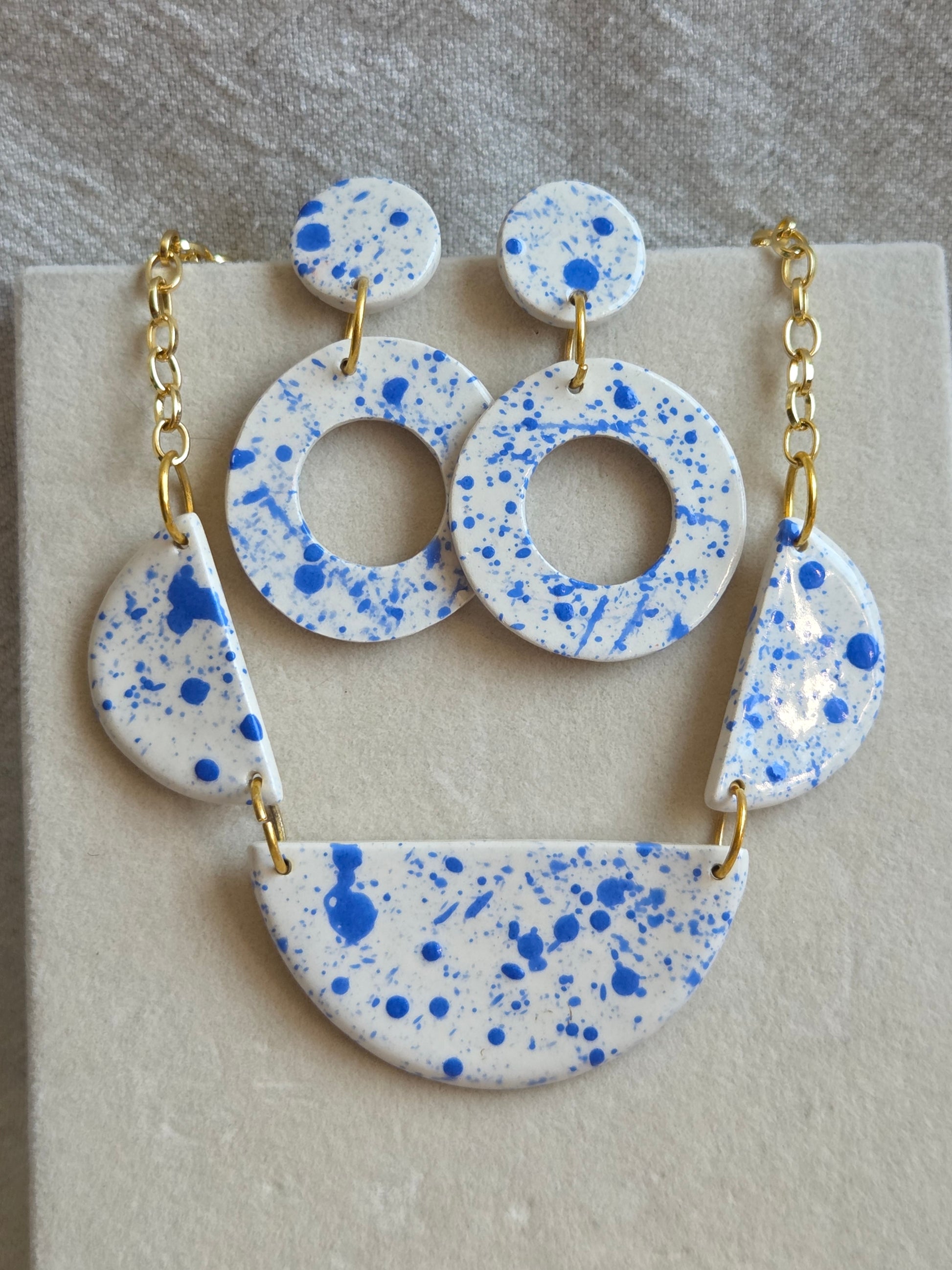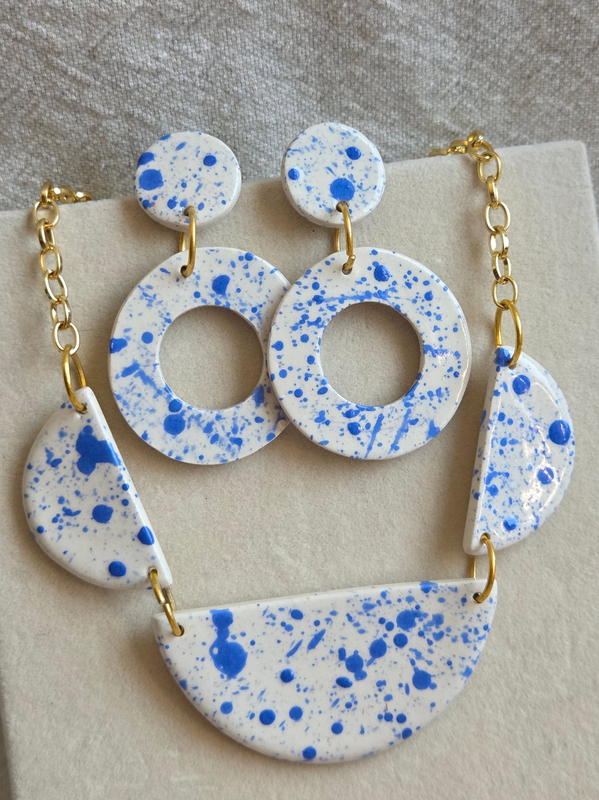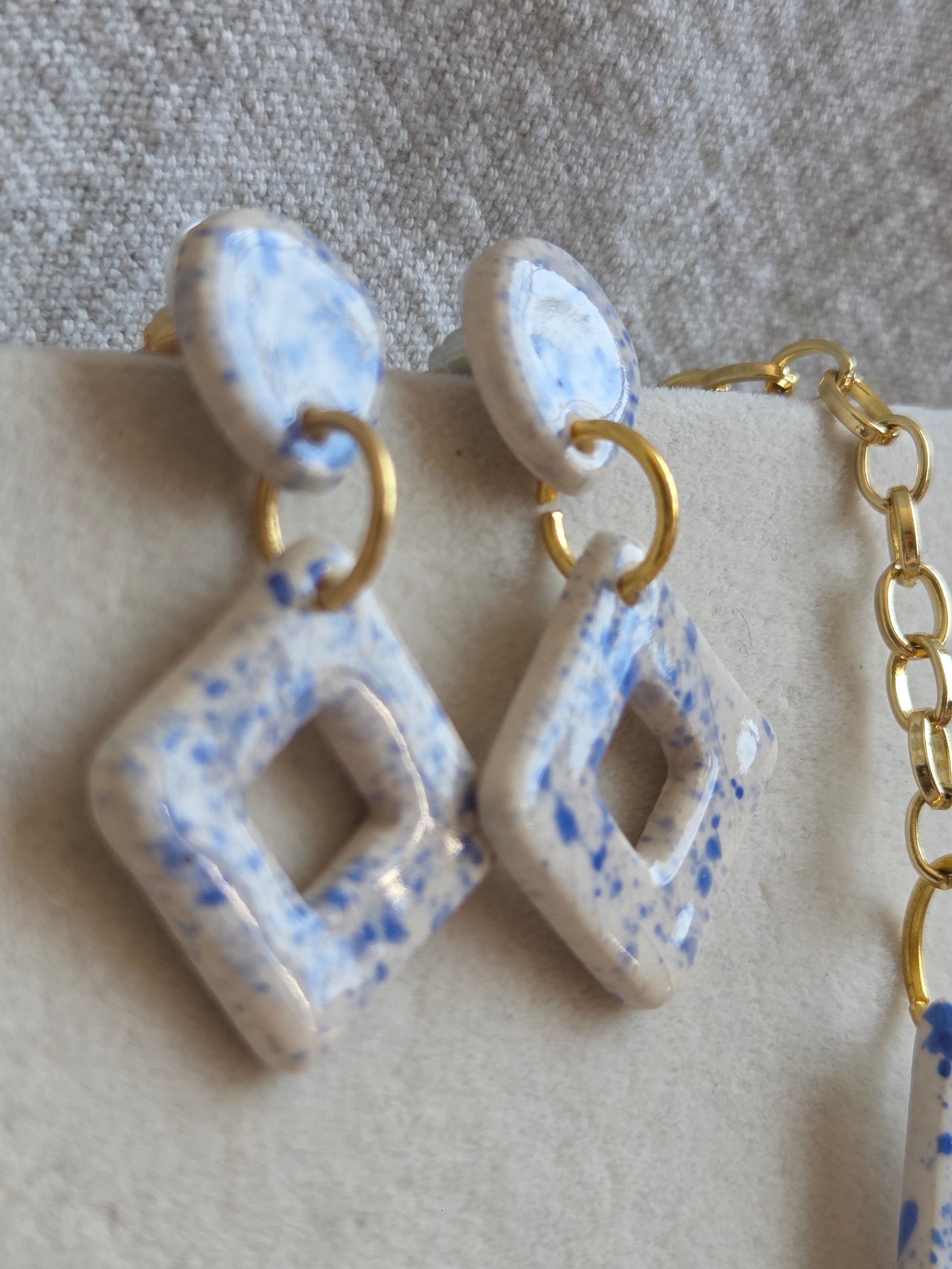 Aros/ Collar blanco con chispas azules con cadena de oro, juntos o separados.