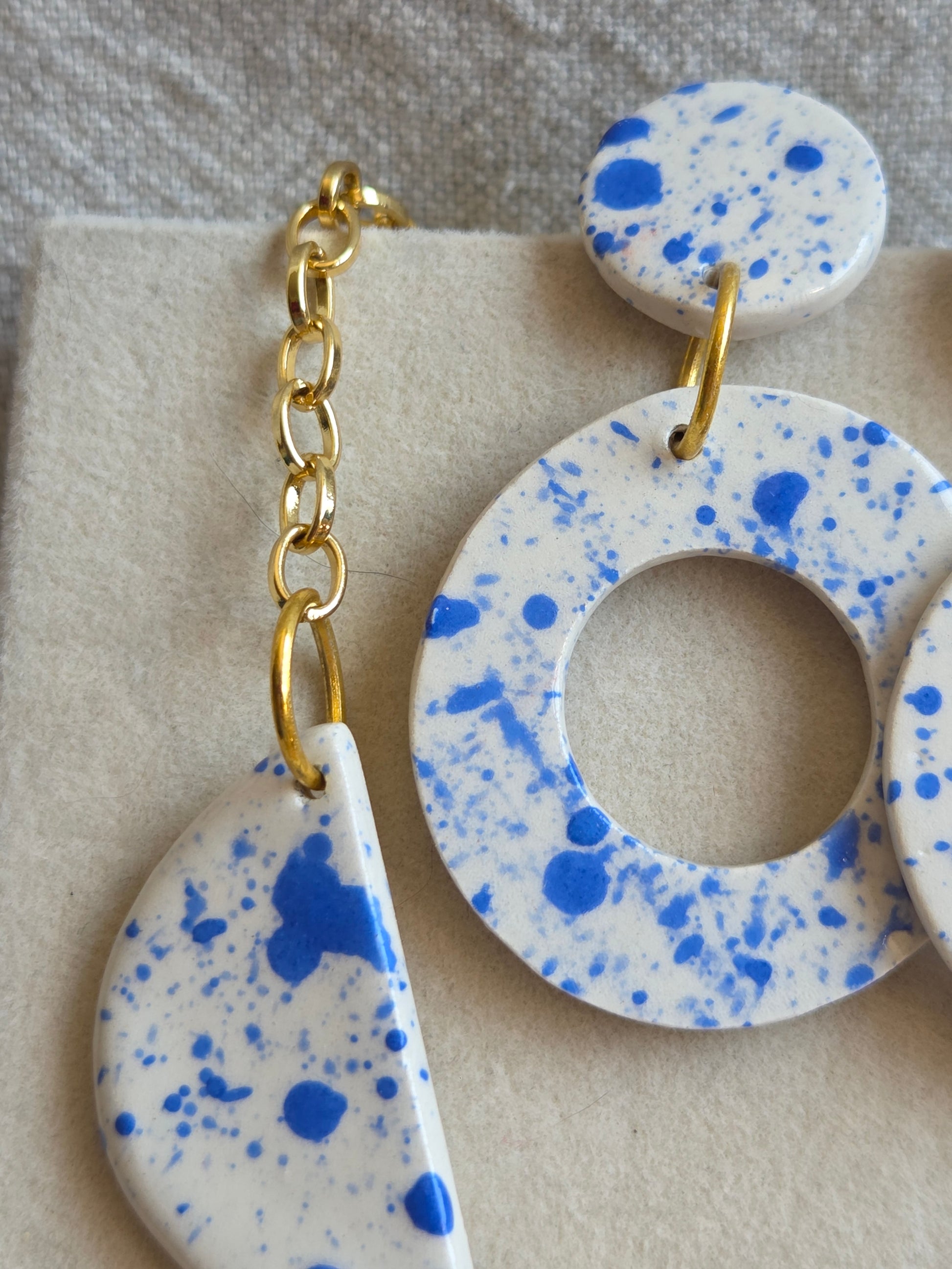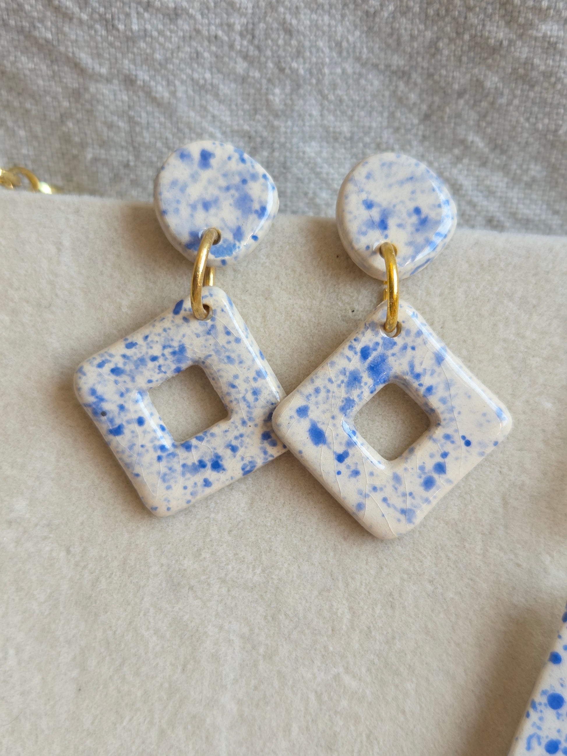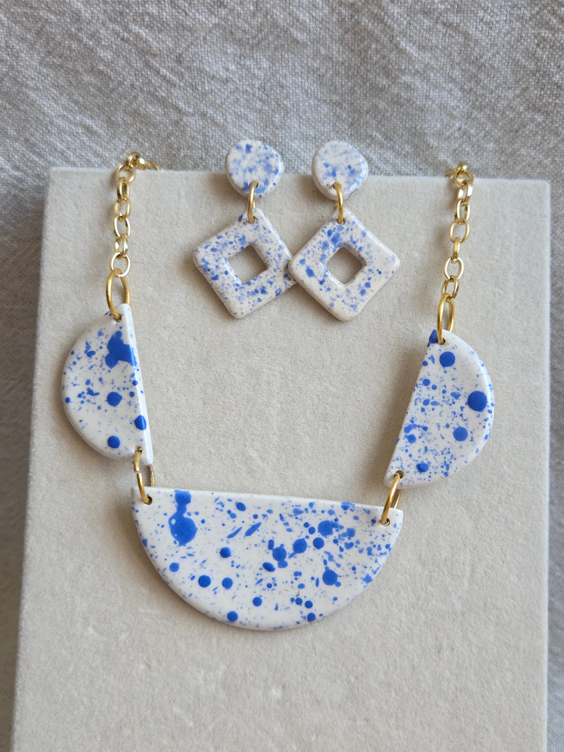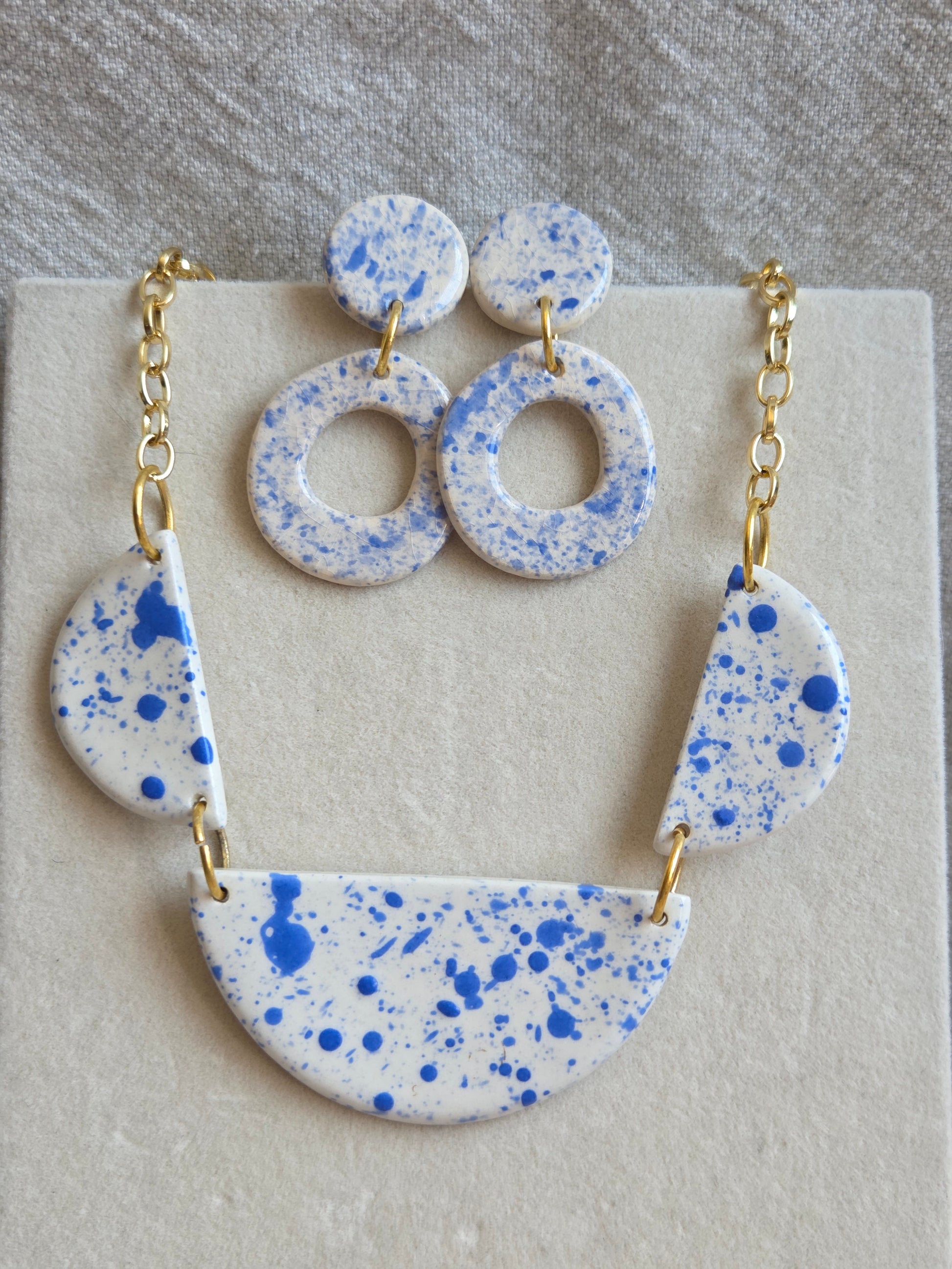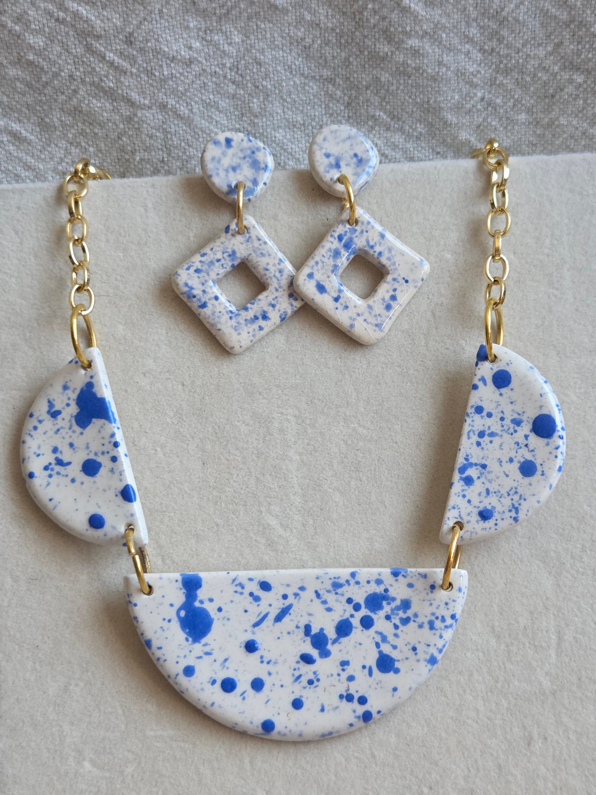 Aros/ Collar blanco con chispas azules con cadena de oro, juntos o separados.
