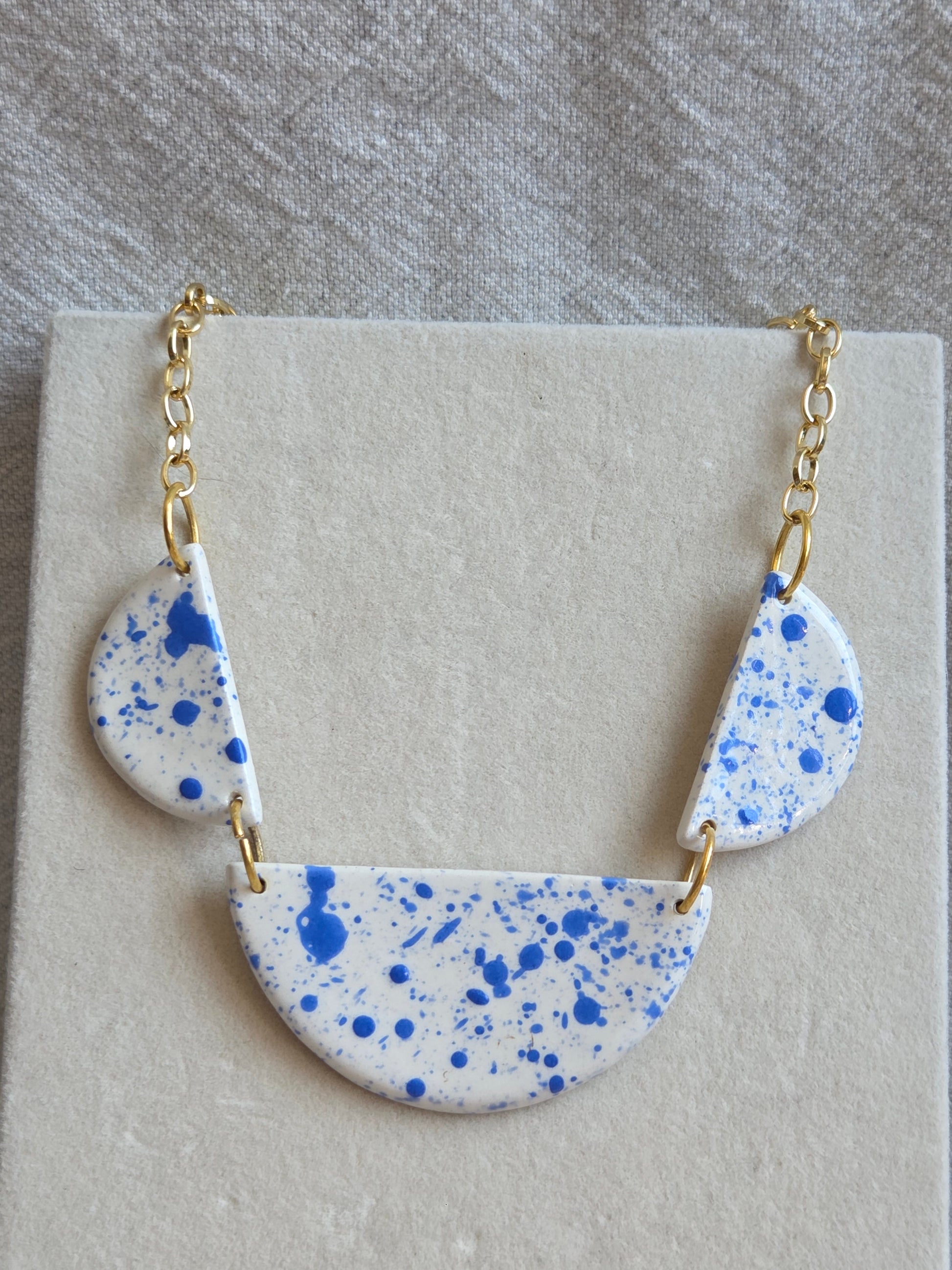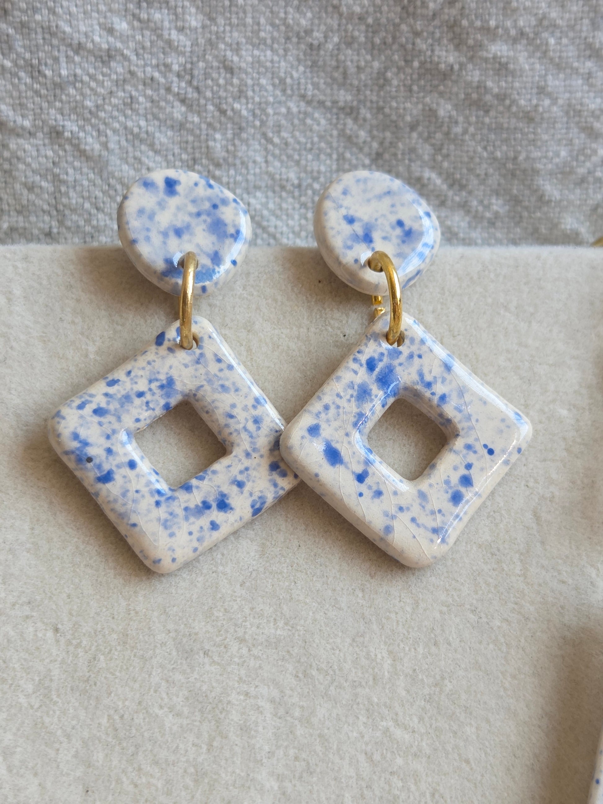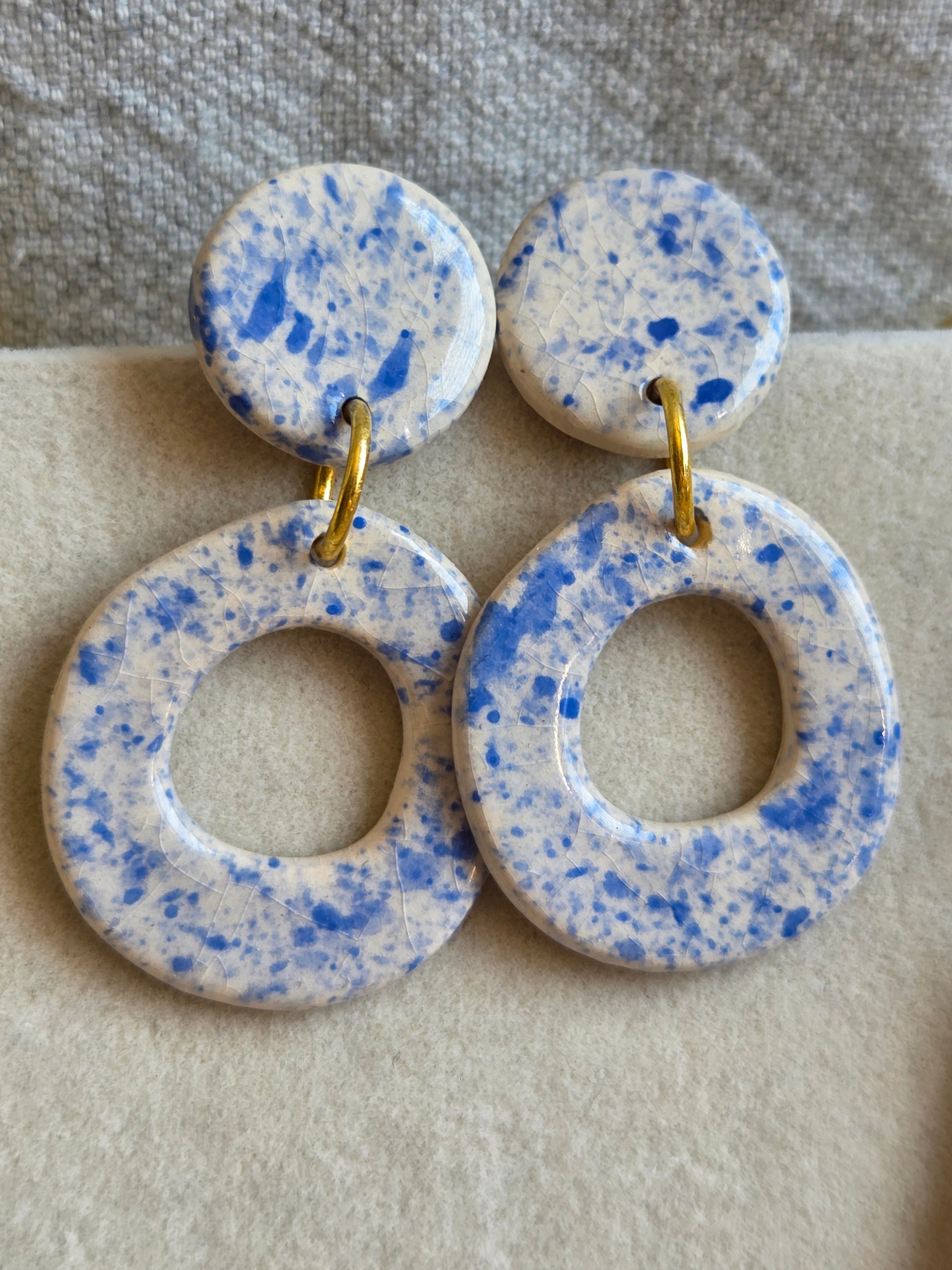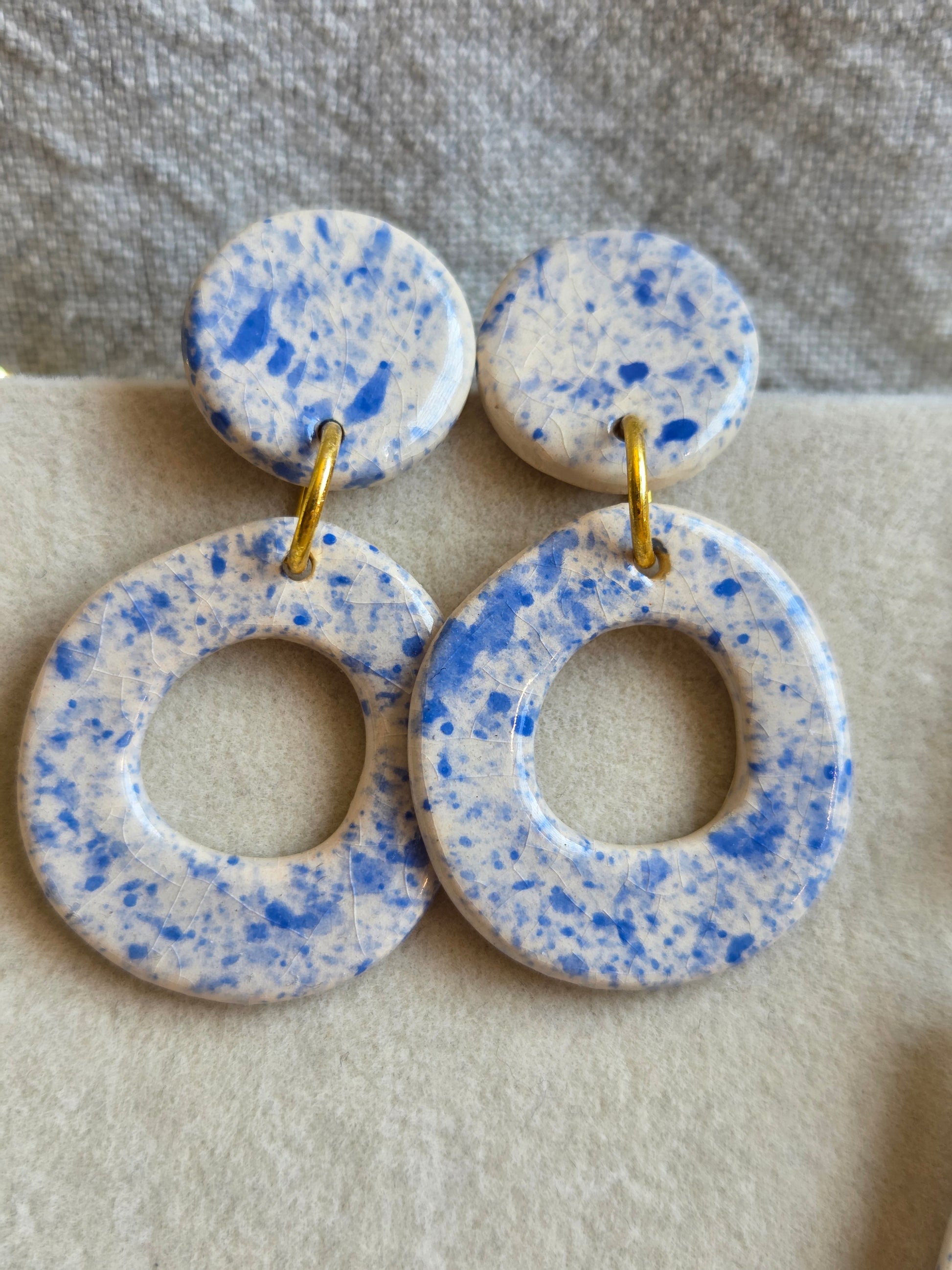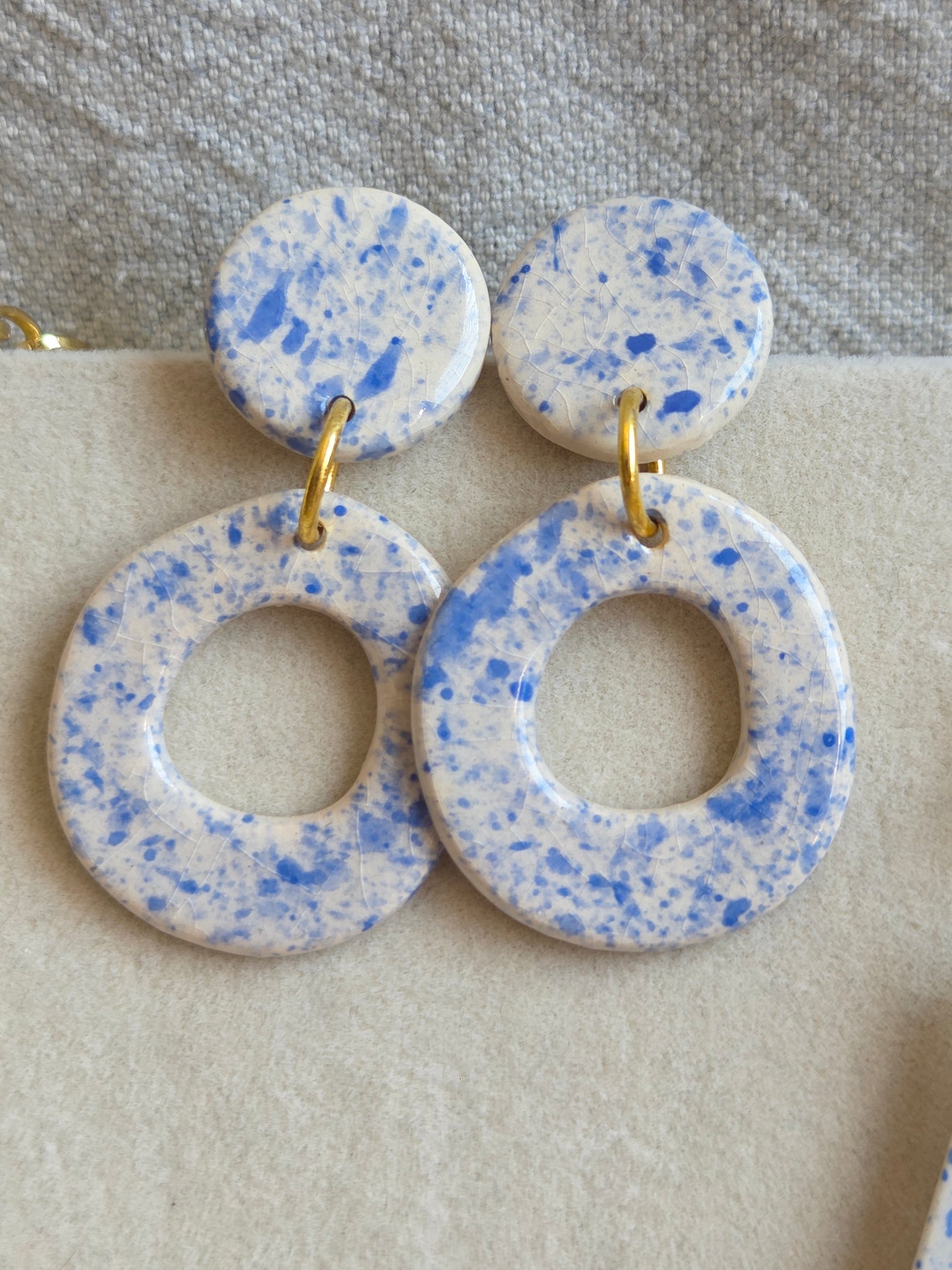 Aros/ Collar blanco con chispas azules con cadena de oro, juntos o separados.
