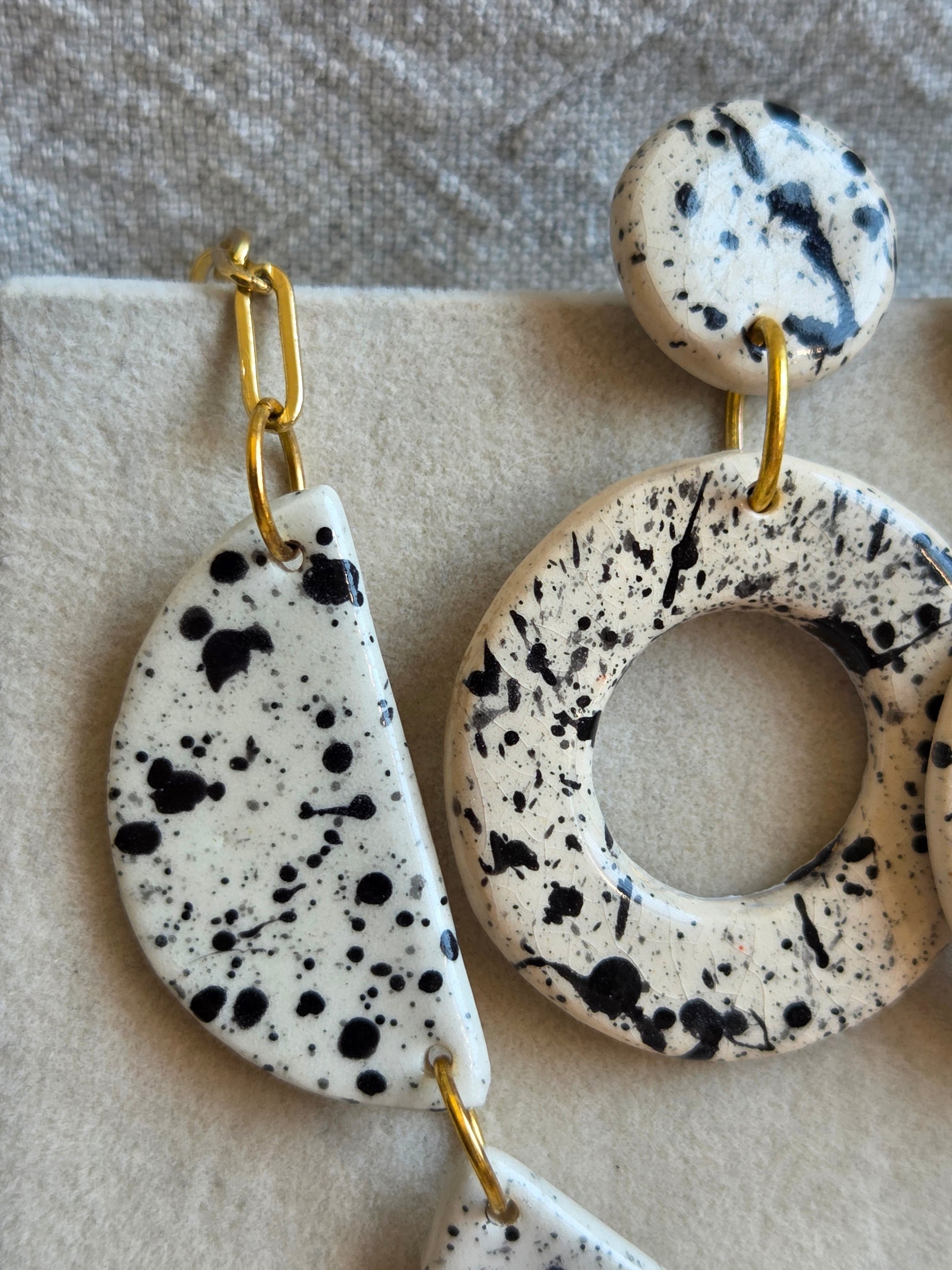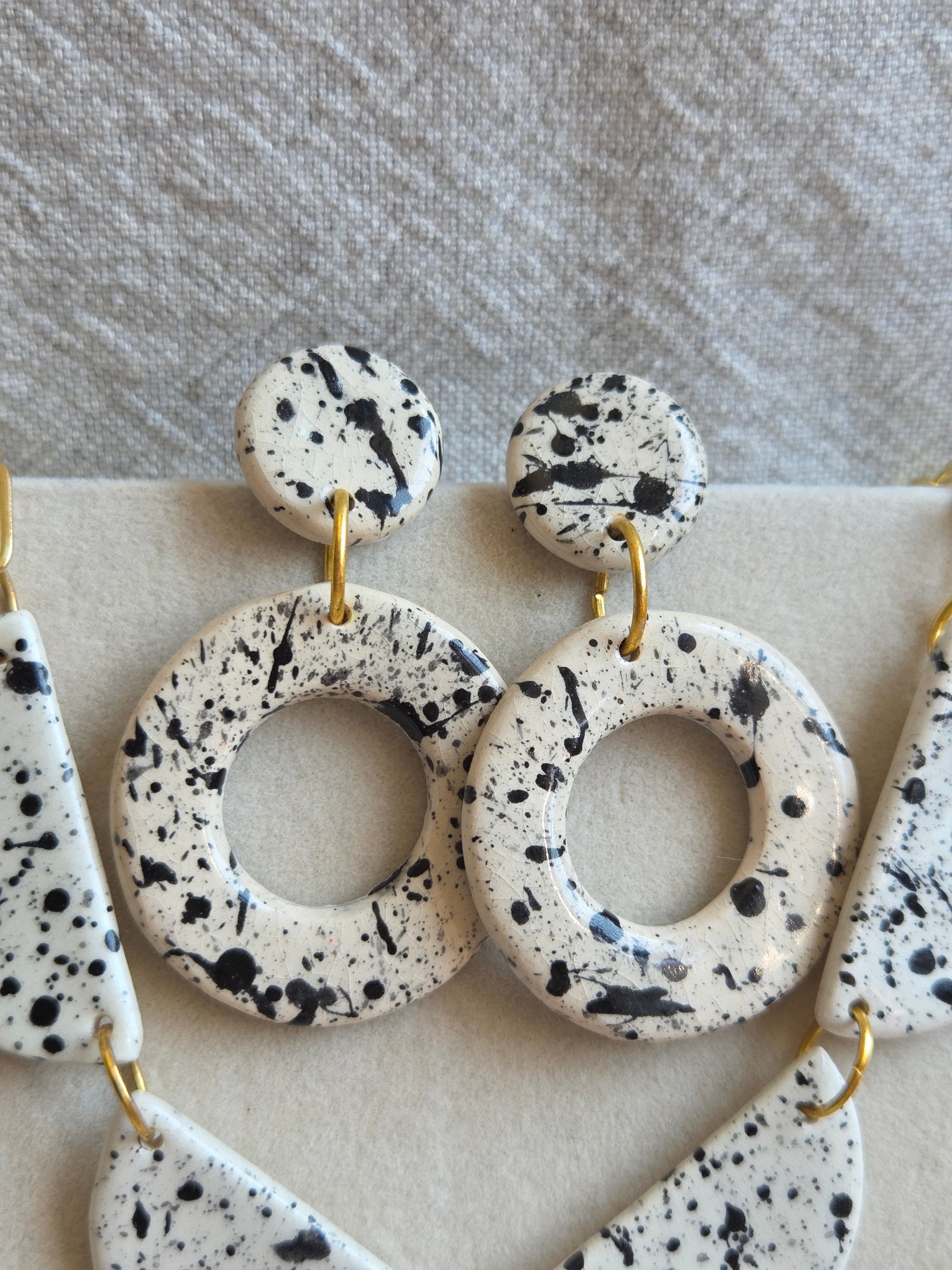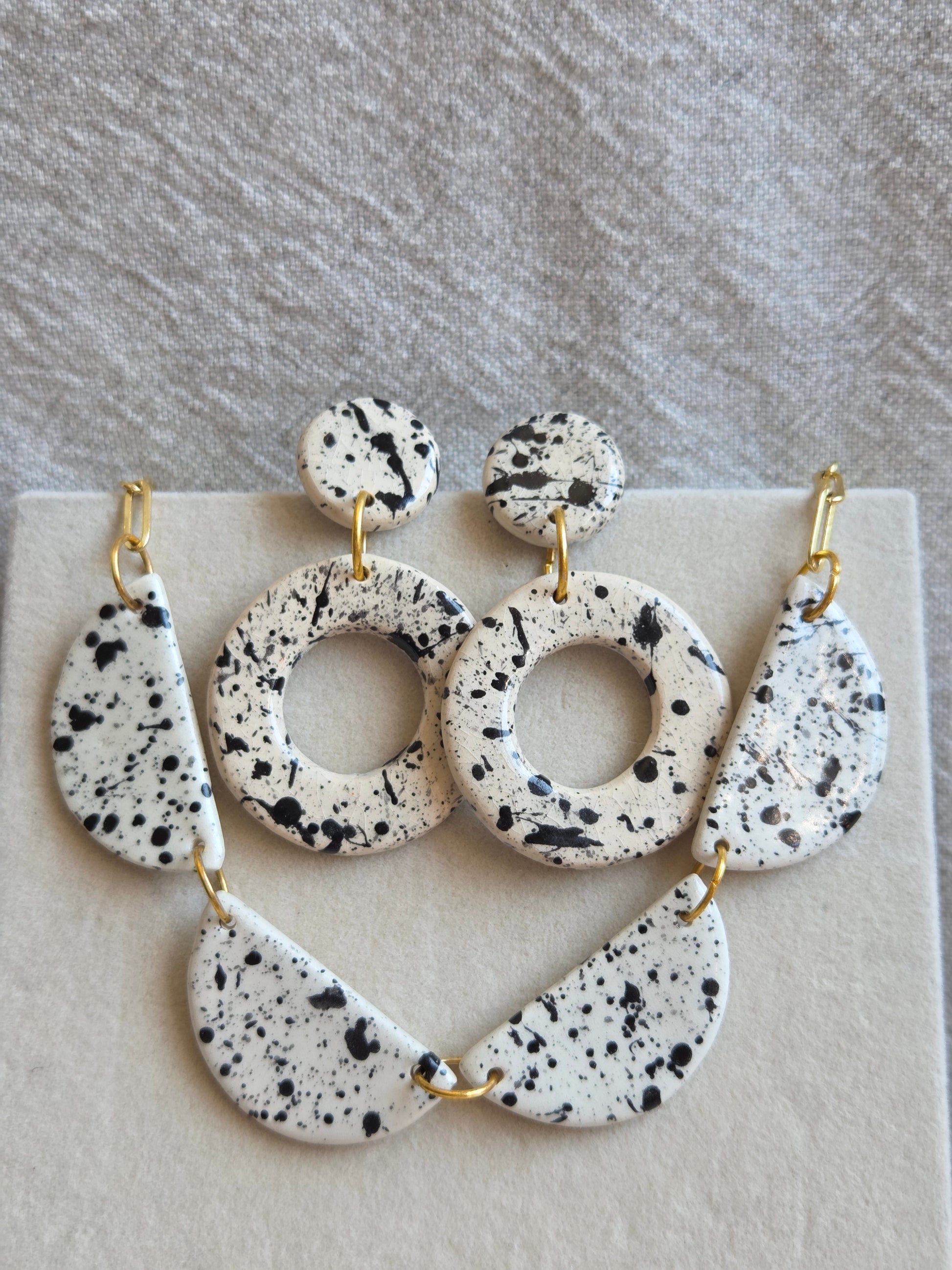 Aros/ Collar blanco con chispas negrad con cadena de oro, juntos o separados.