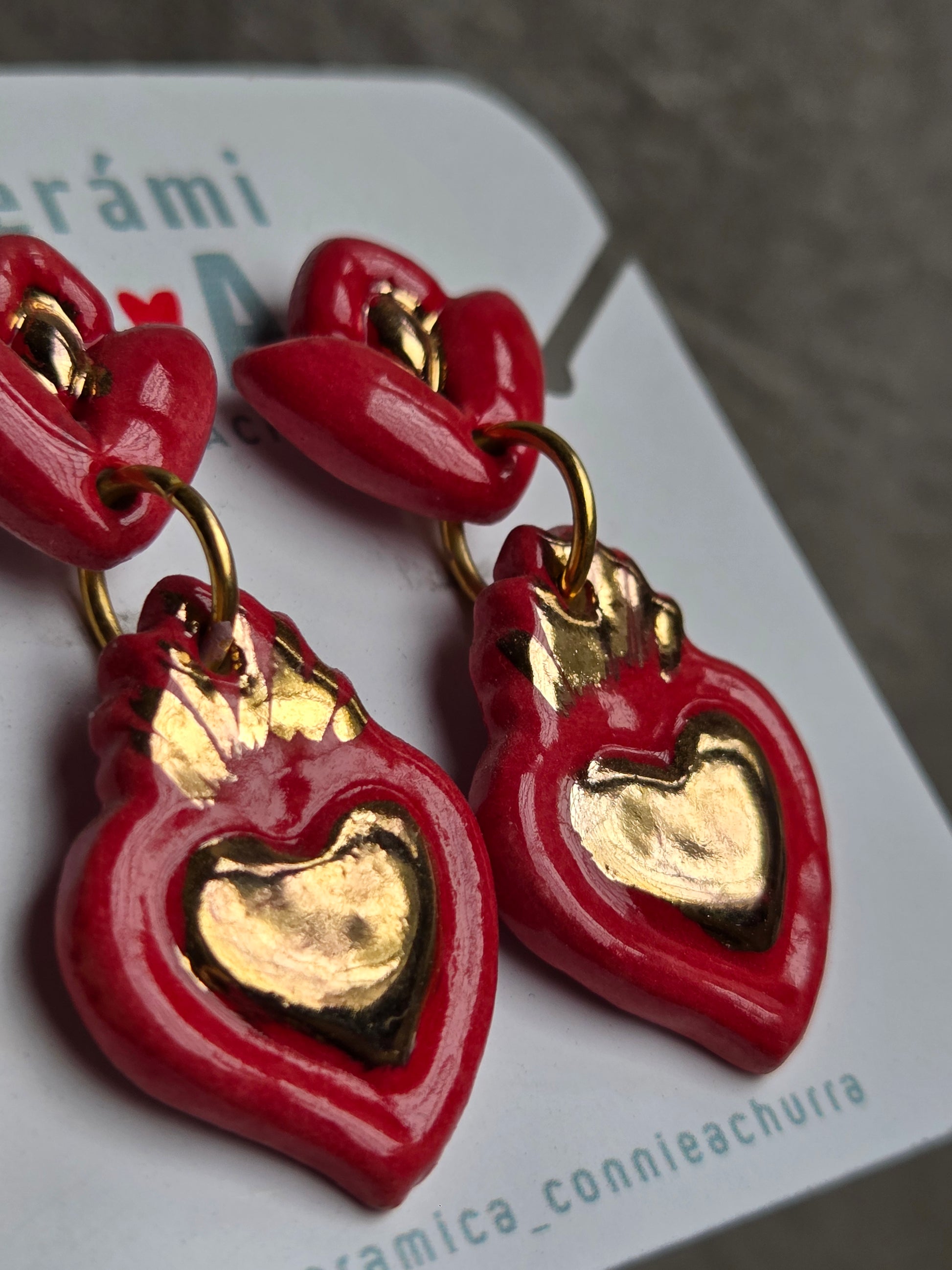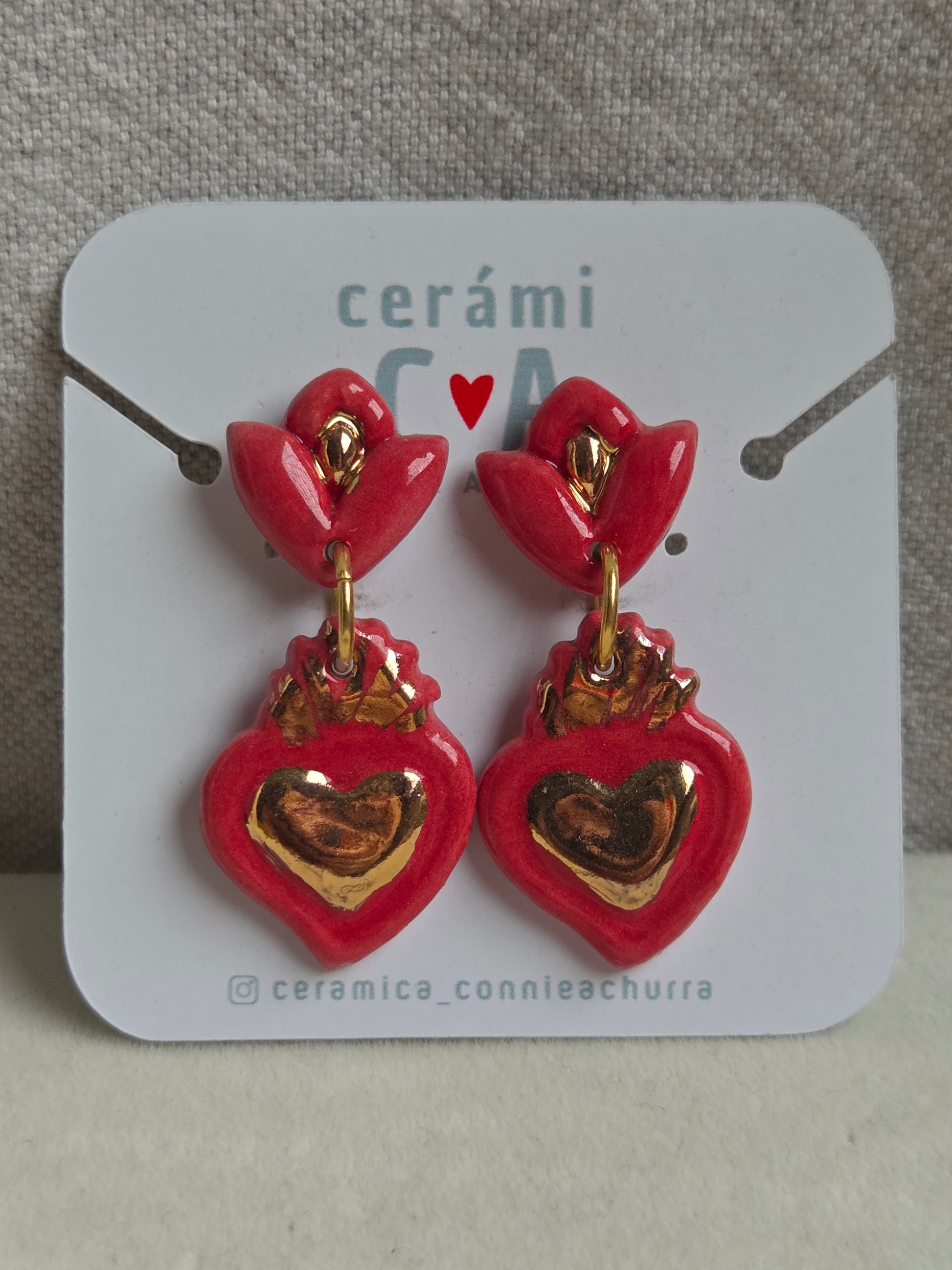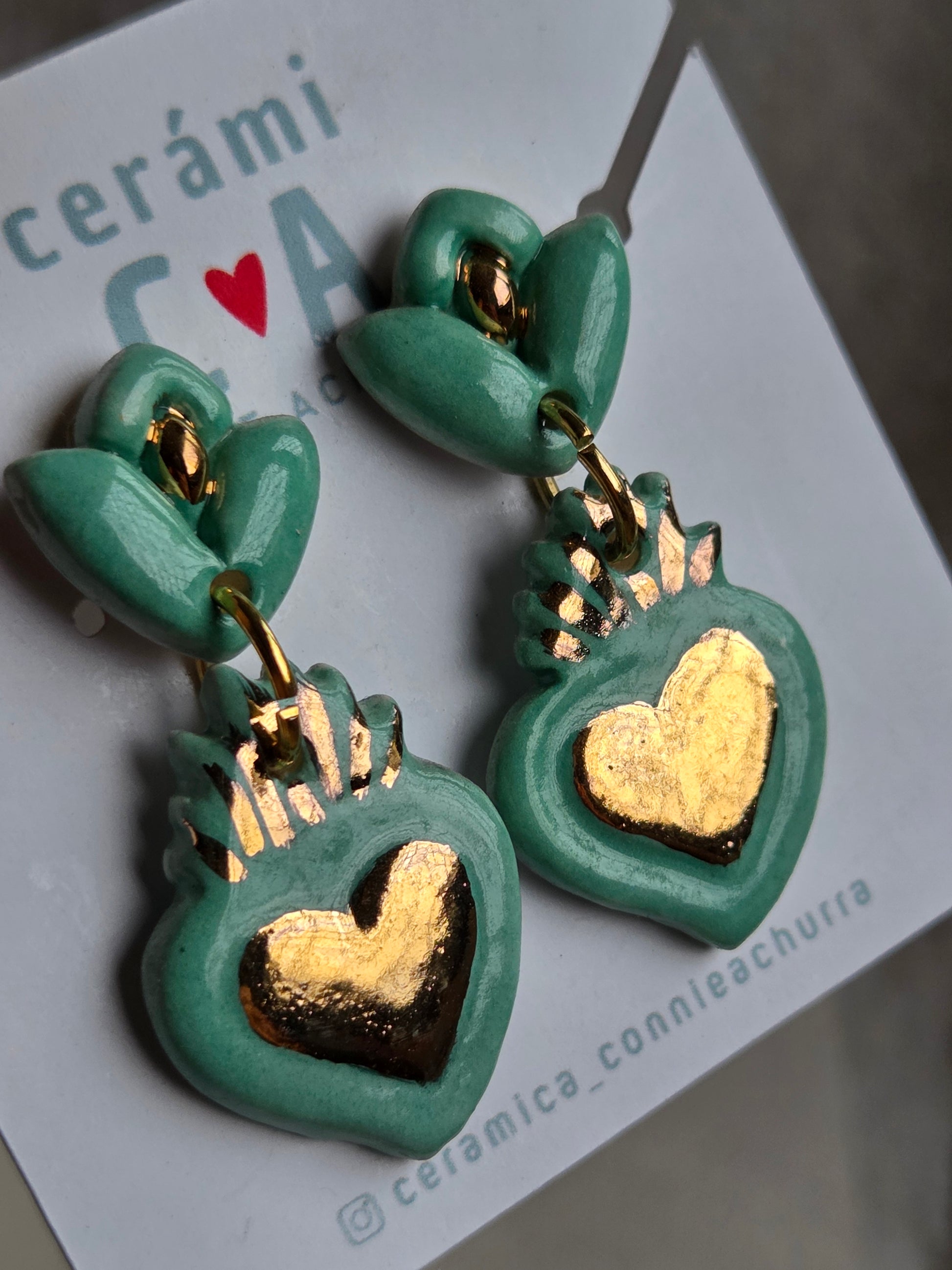 Delicados aros de 2 piezas hechos a mano en cerámica esmaltada y lustre de oro de 18 kilates en tercera quema, argollas con baño de oro y palito de acero quirúrgico.