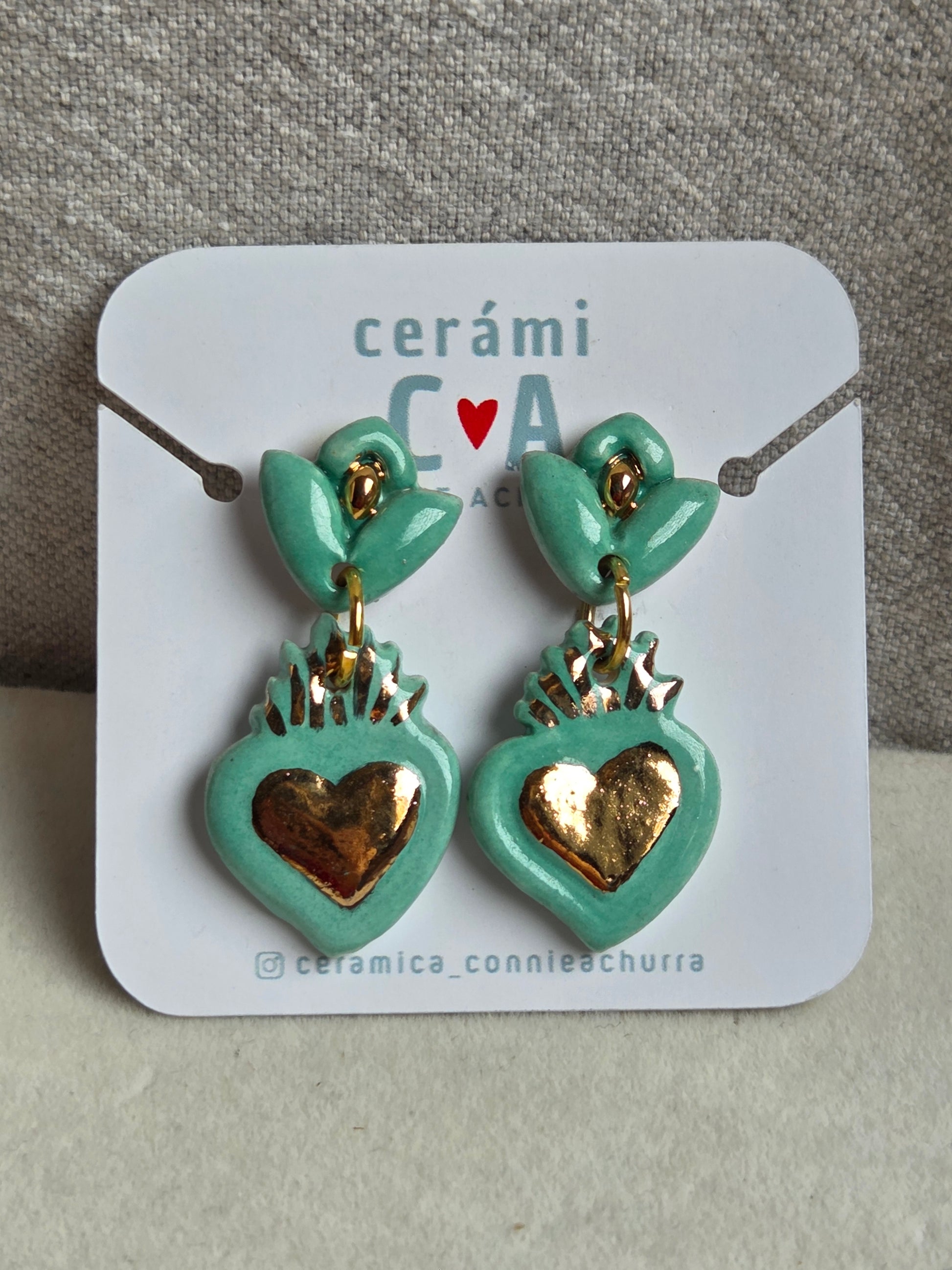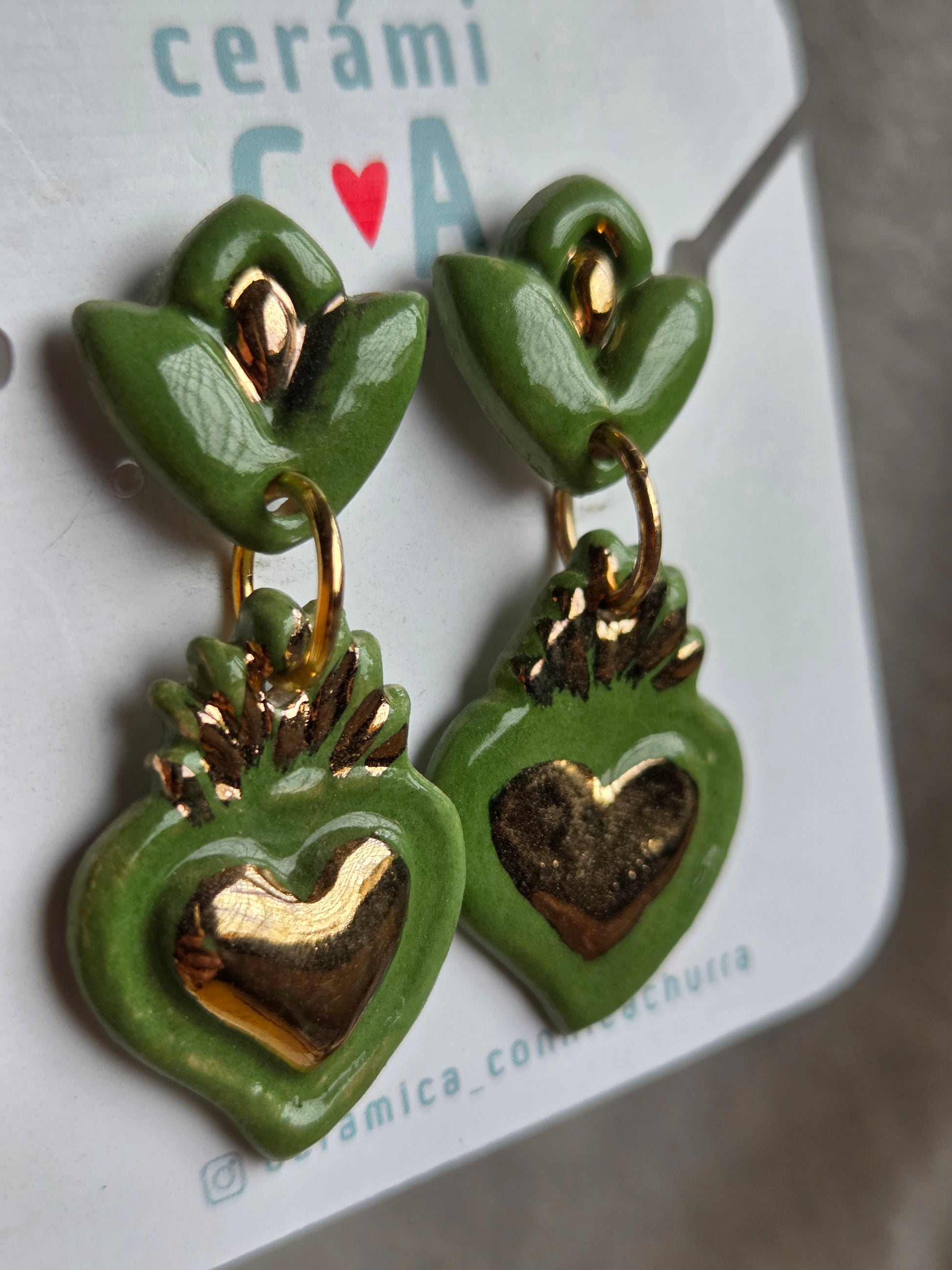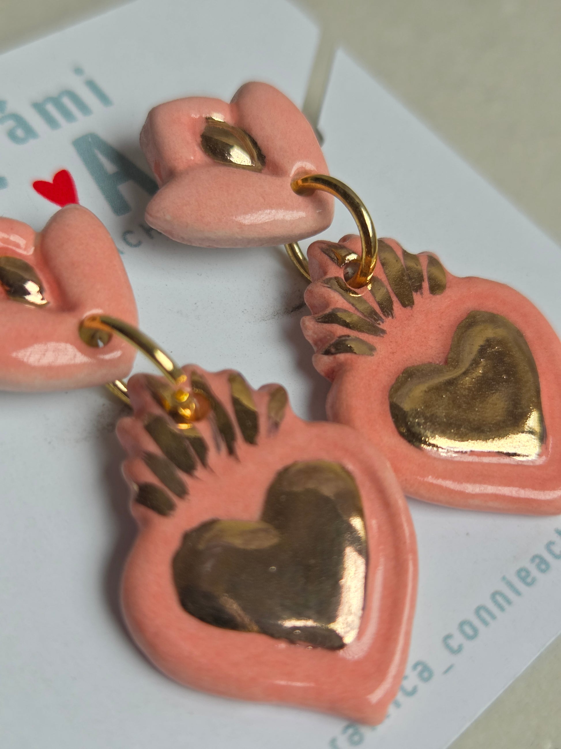 Delicados aros de 2 piezas hechos a mano en cerámica esmaltada y lustre de oro de 18 kilates en tercera quema, argollas con baño de oro y palito de acero quirúrgico.