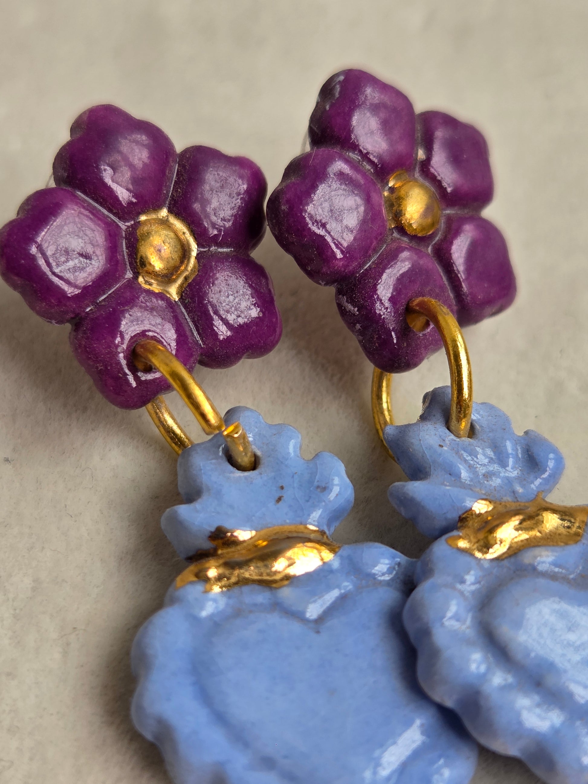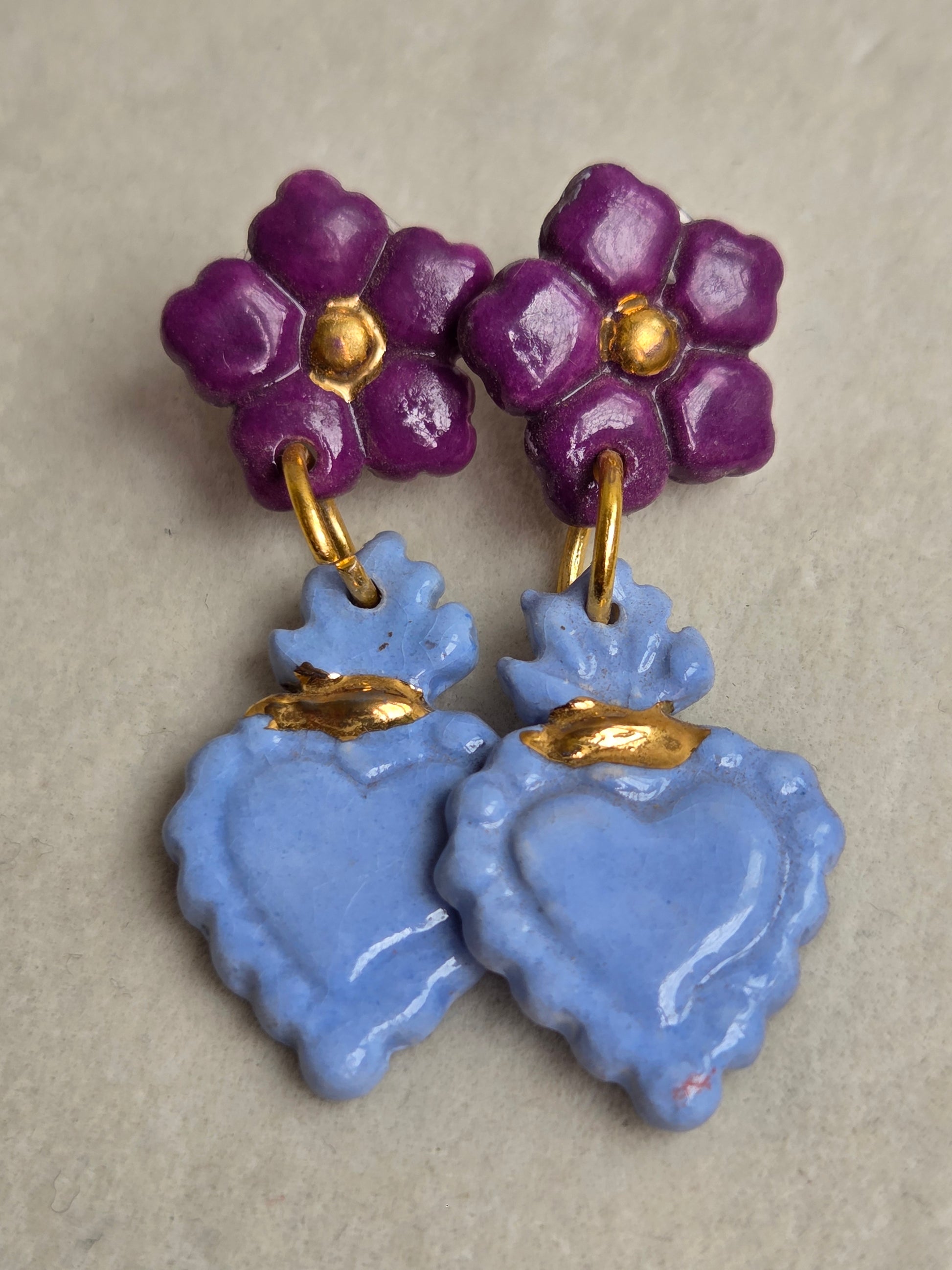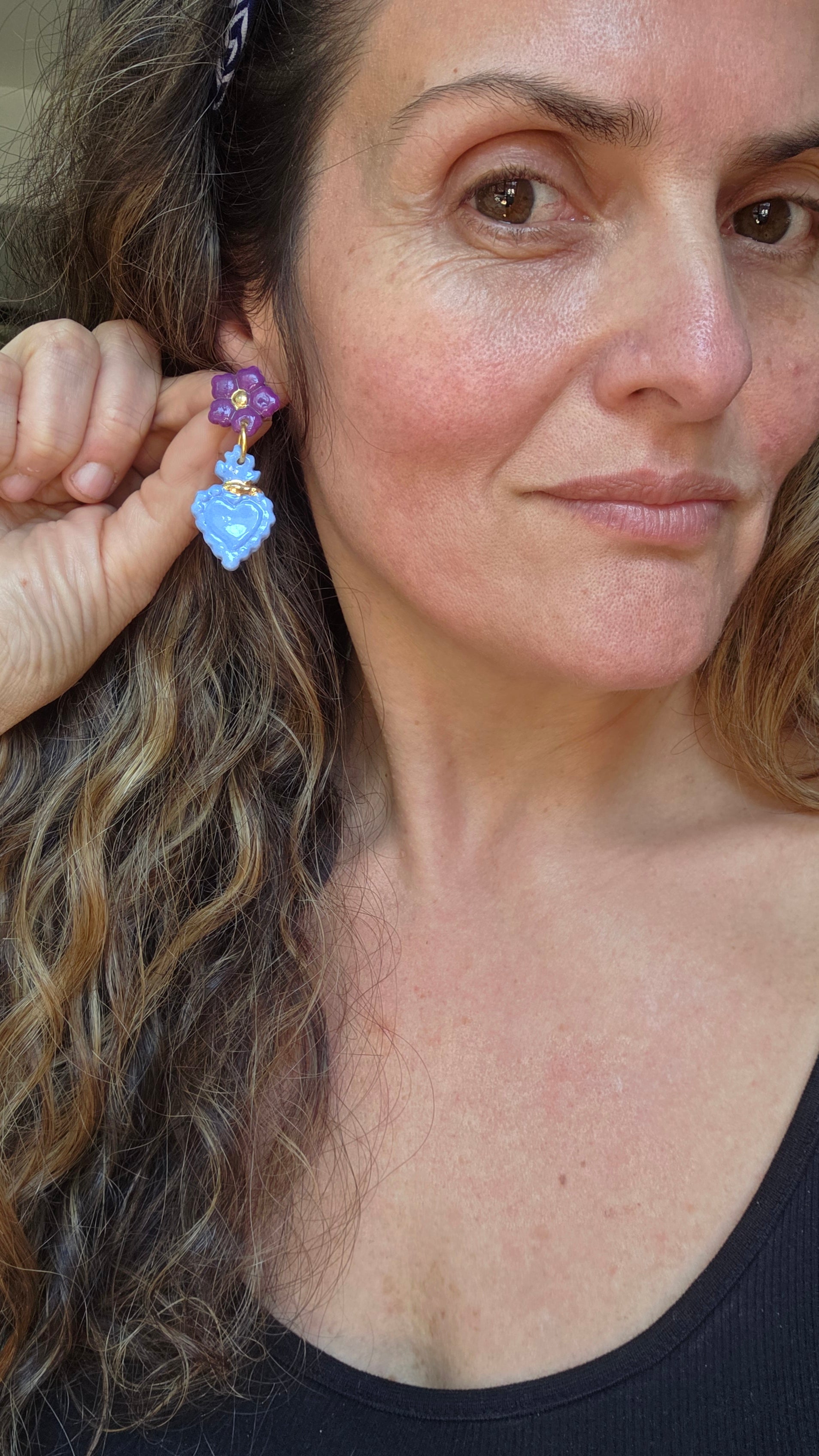 Delicados aros de 2 piezas hechos a mano en cerámica esmaltada y lustre de oro de 18 kilates en tercera quema, argollas con baño de oro y palito de acero quirúrgico.