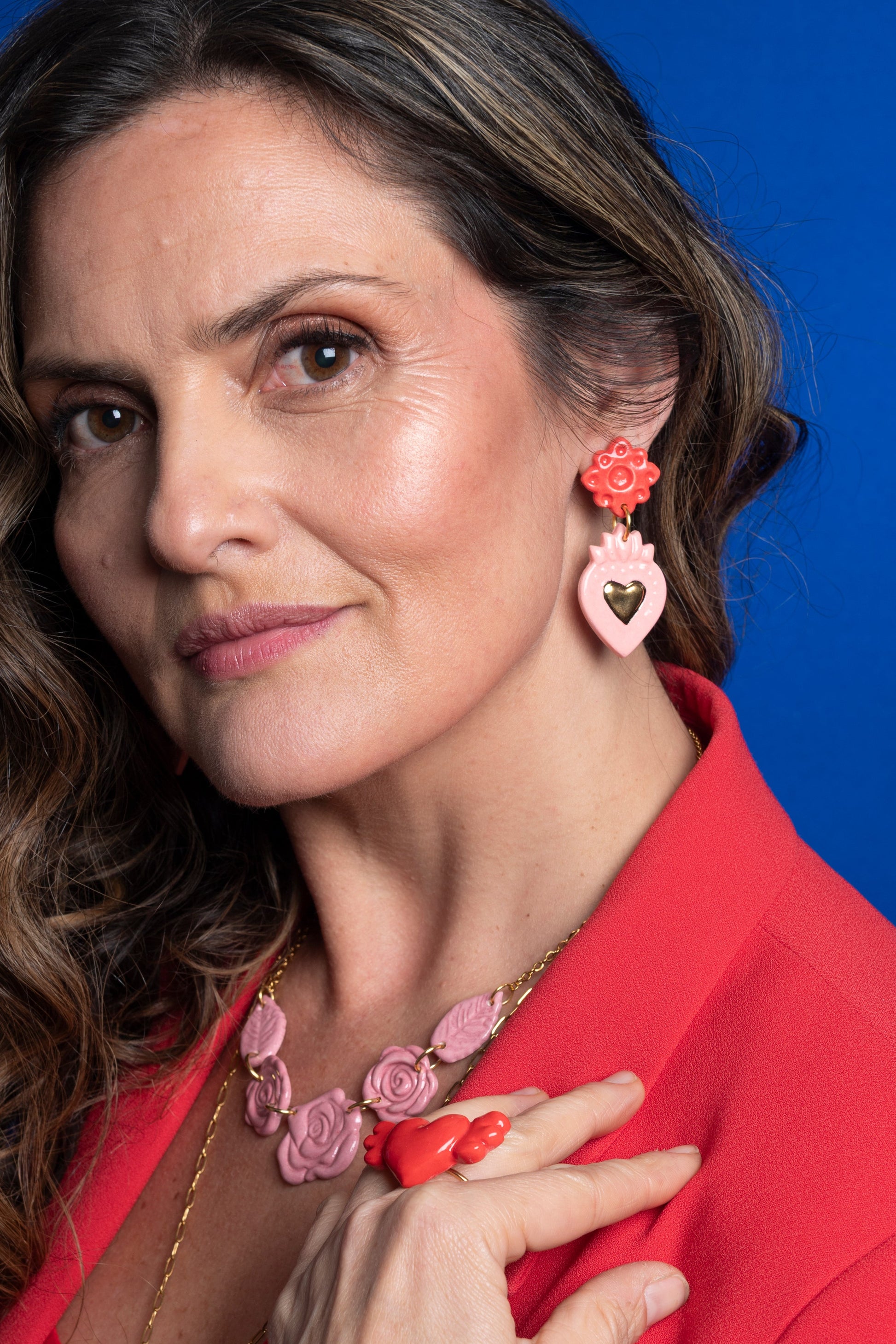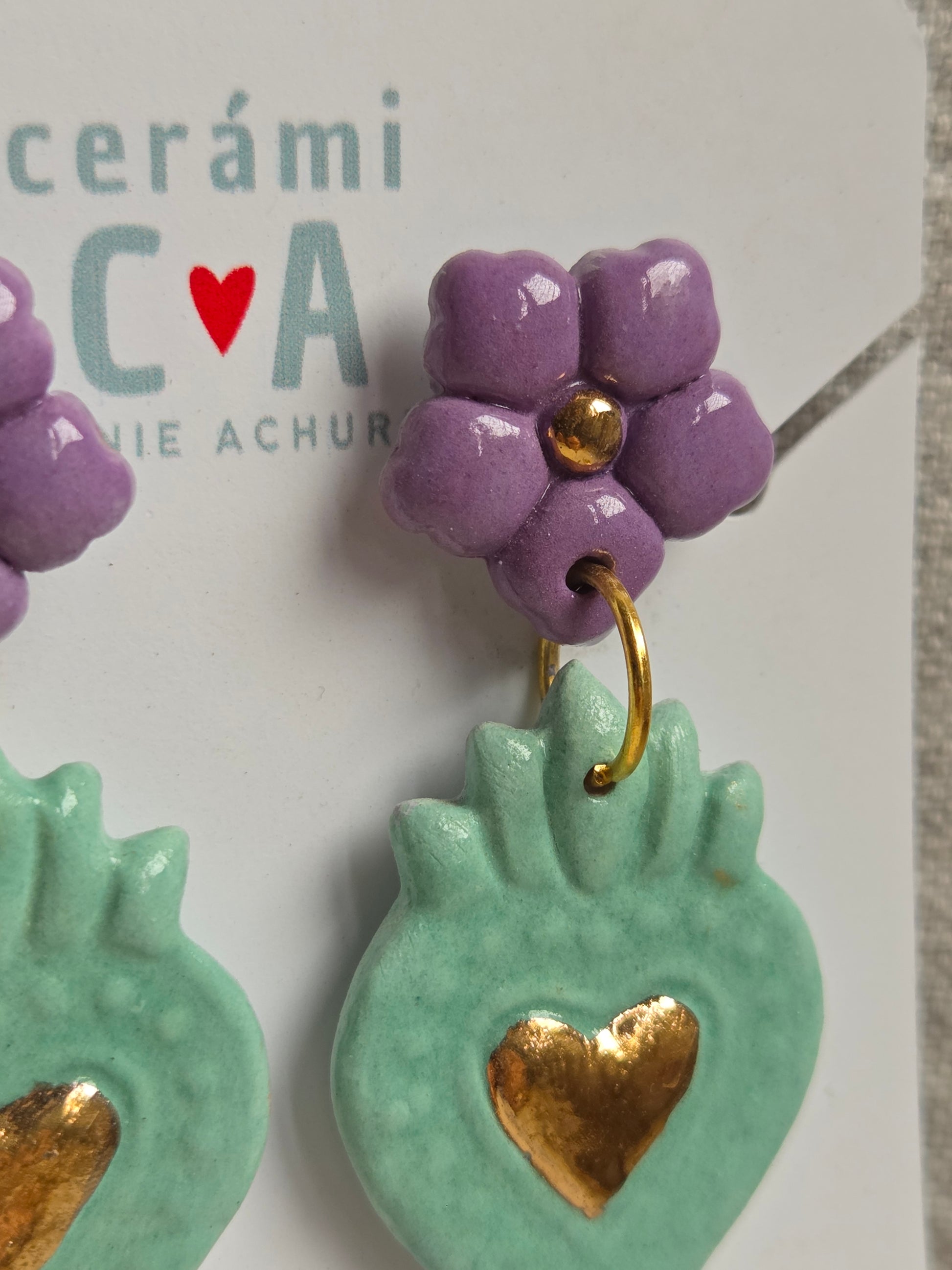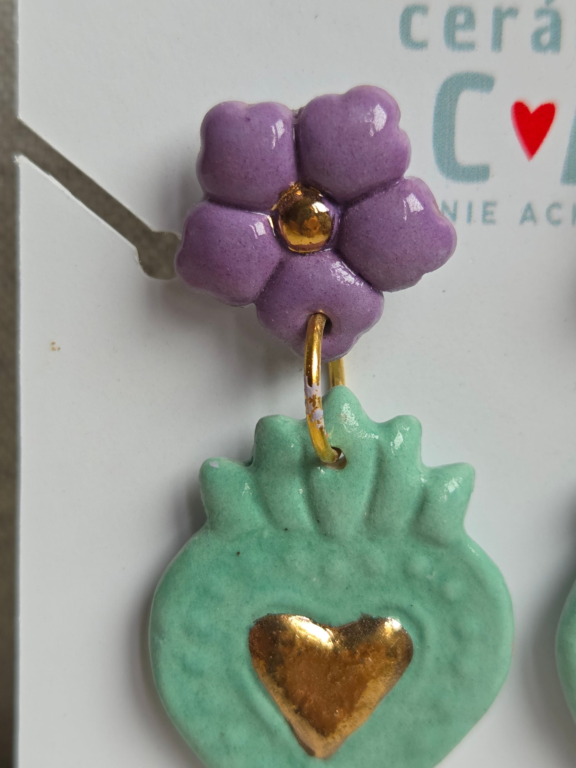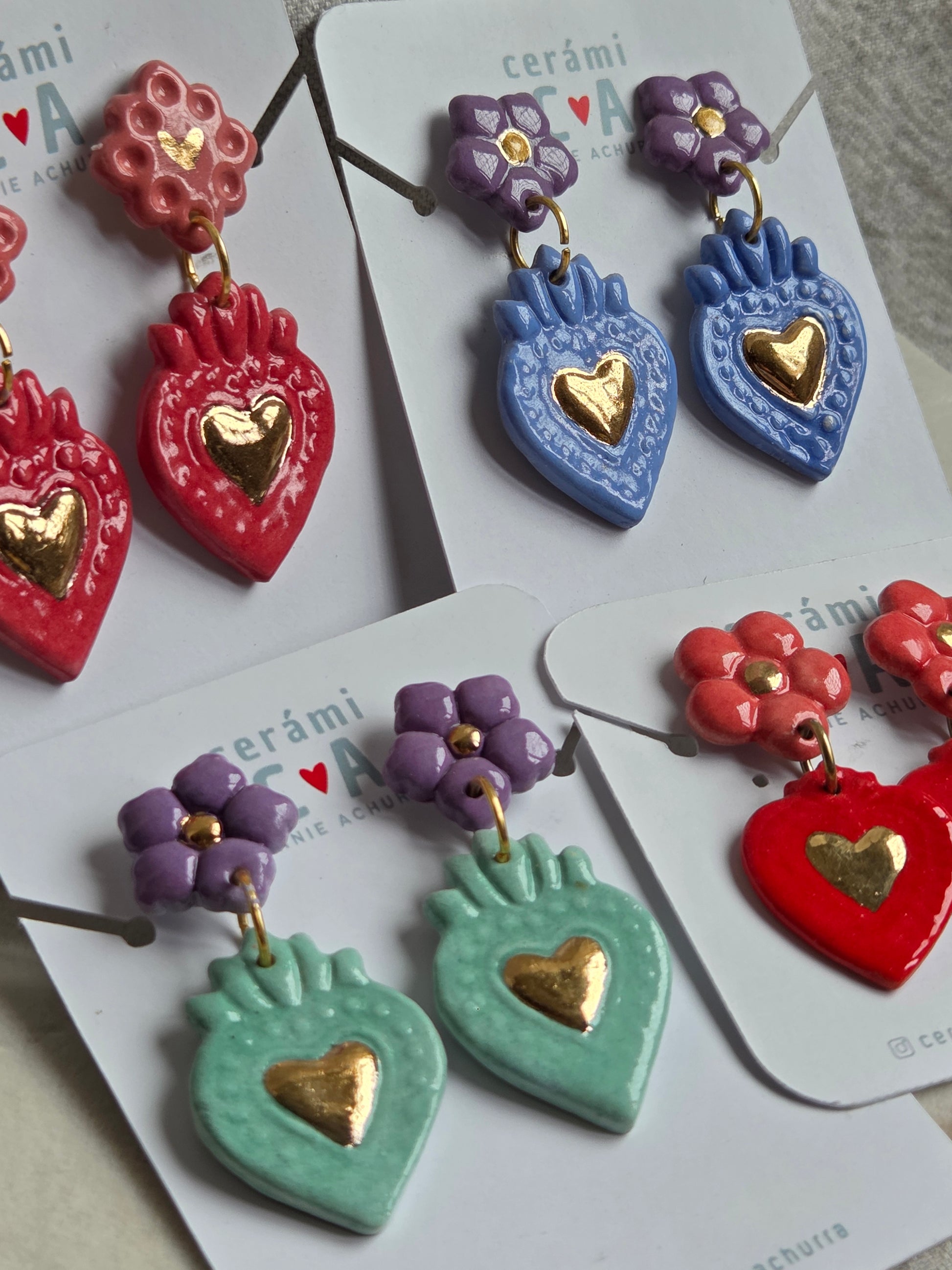 Delicados aros de 2 piezas hechos a mano en cerámica esmaltada y lustre de oro de 18 kilates en tercera quema, argollas con baño de oro y palito de acero quirúrgico.