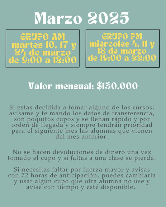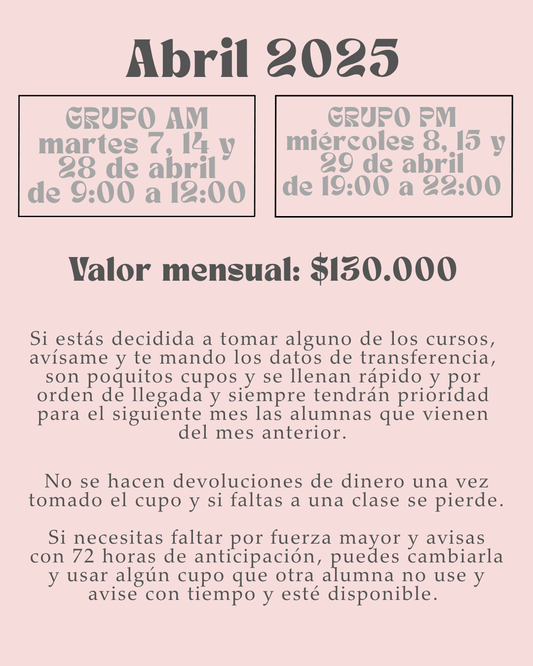 Si estás decidida a tomar alguno de los cursos, avísame y te mando los datos de transferencia, son poquitos cupos y se llenan rápido y por orden de llegada y siempre tendrán prioridad para el siguiente mes las alumnas que vienen del mes anterior.