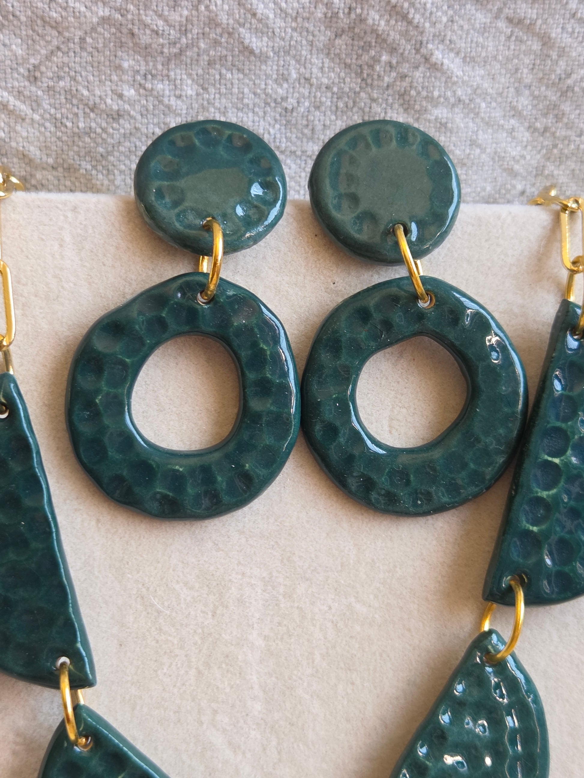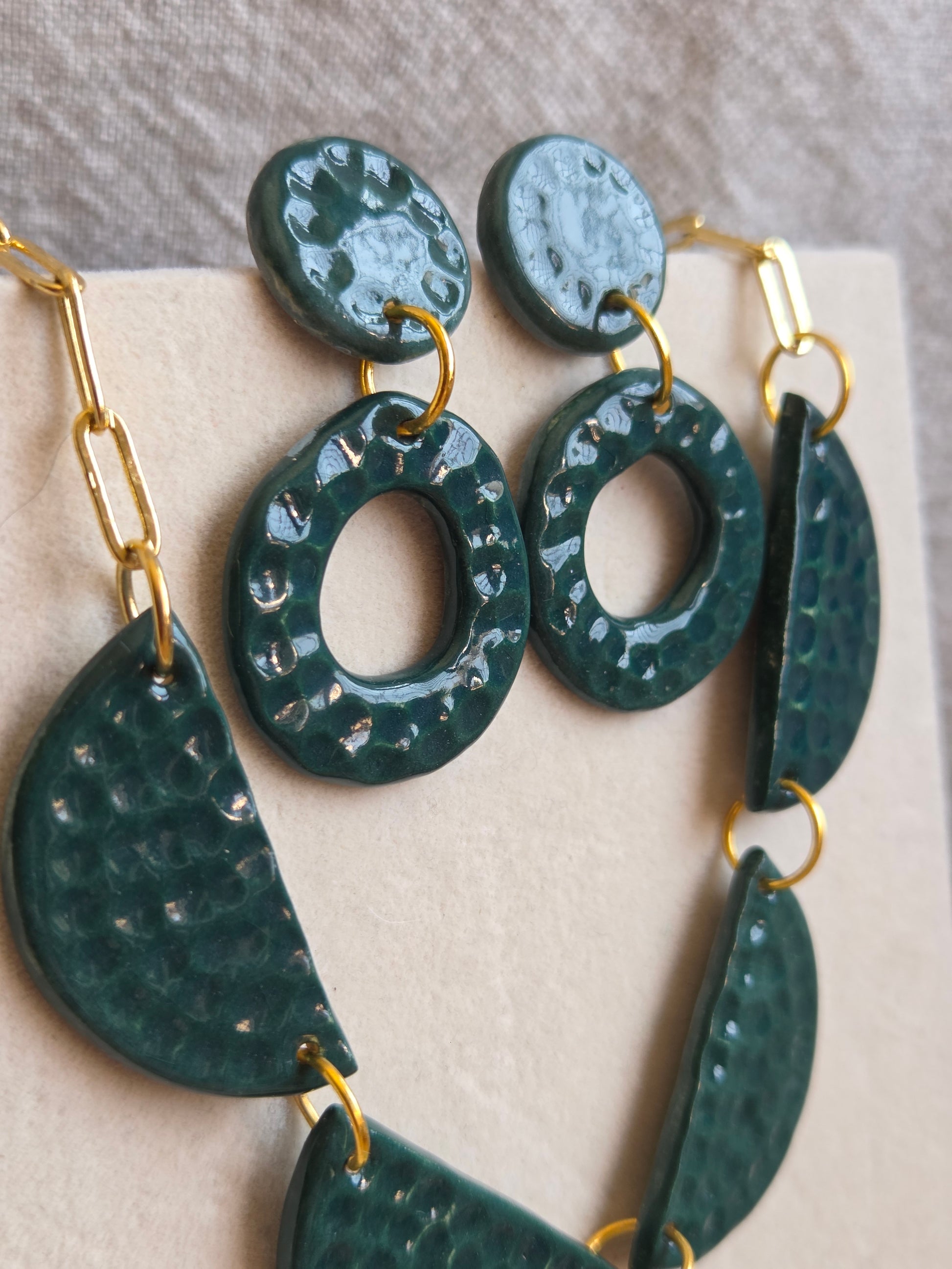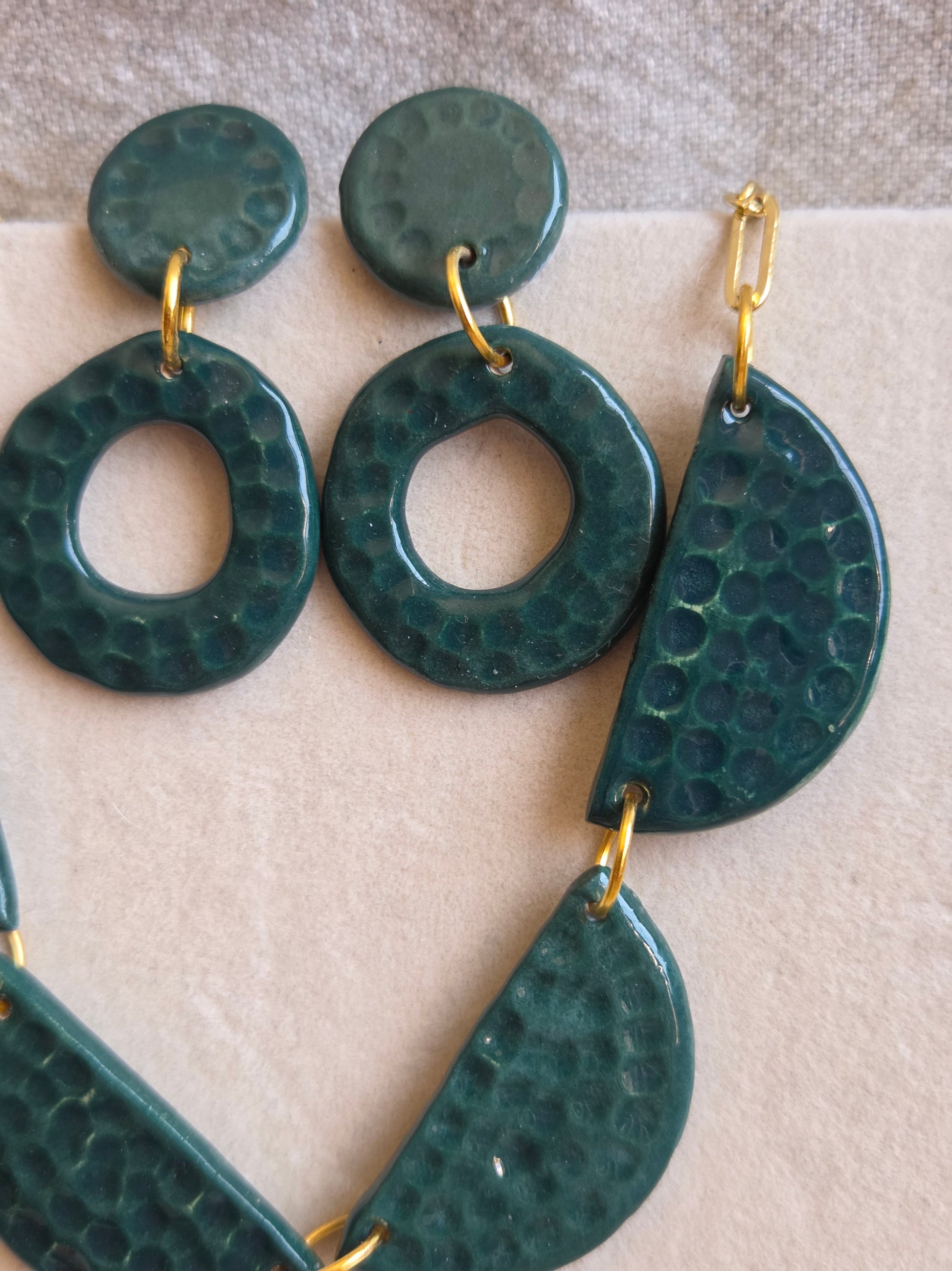 Aros/ Collar verde botella panal con cadena de oro, juntos o separados.