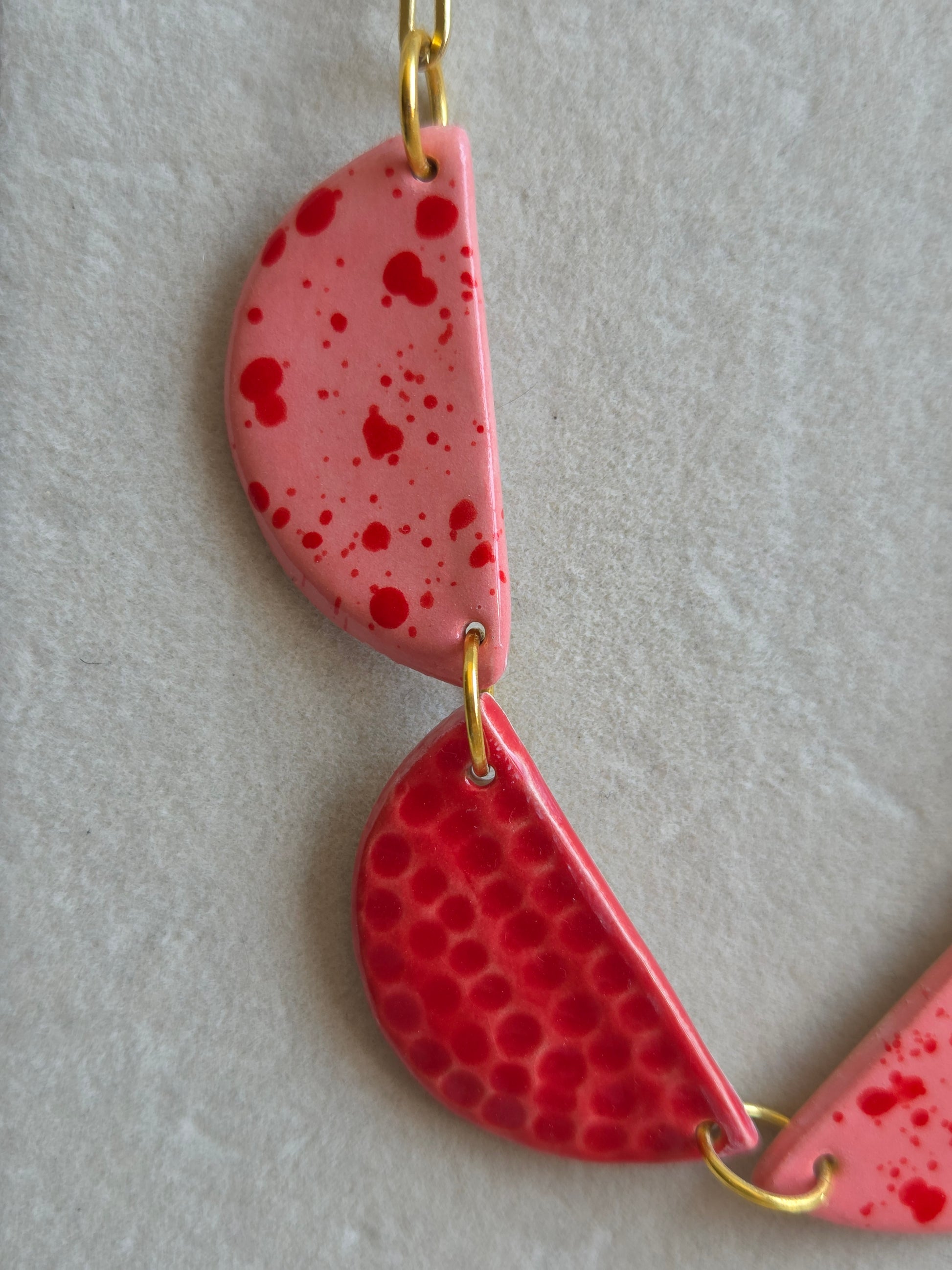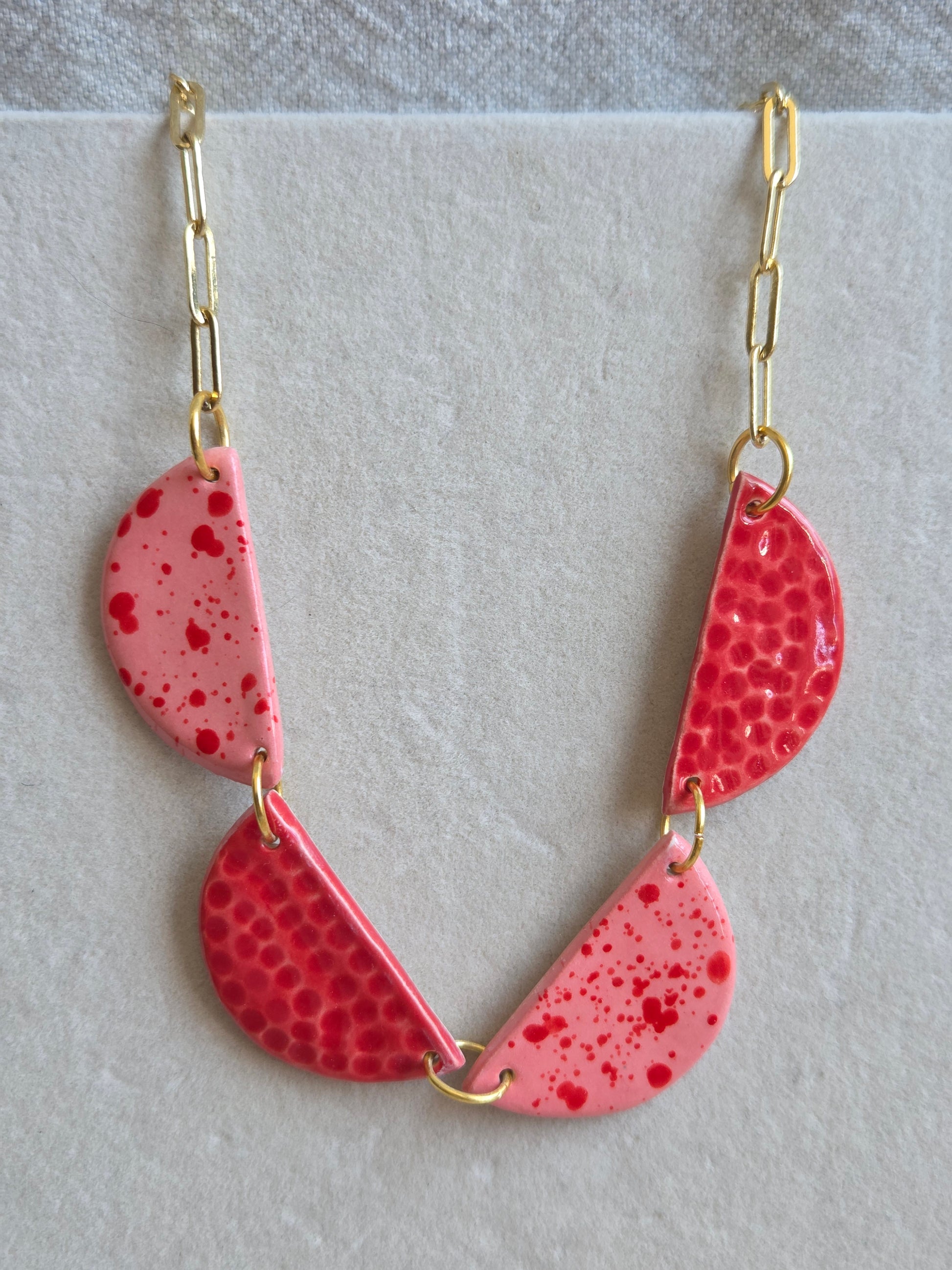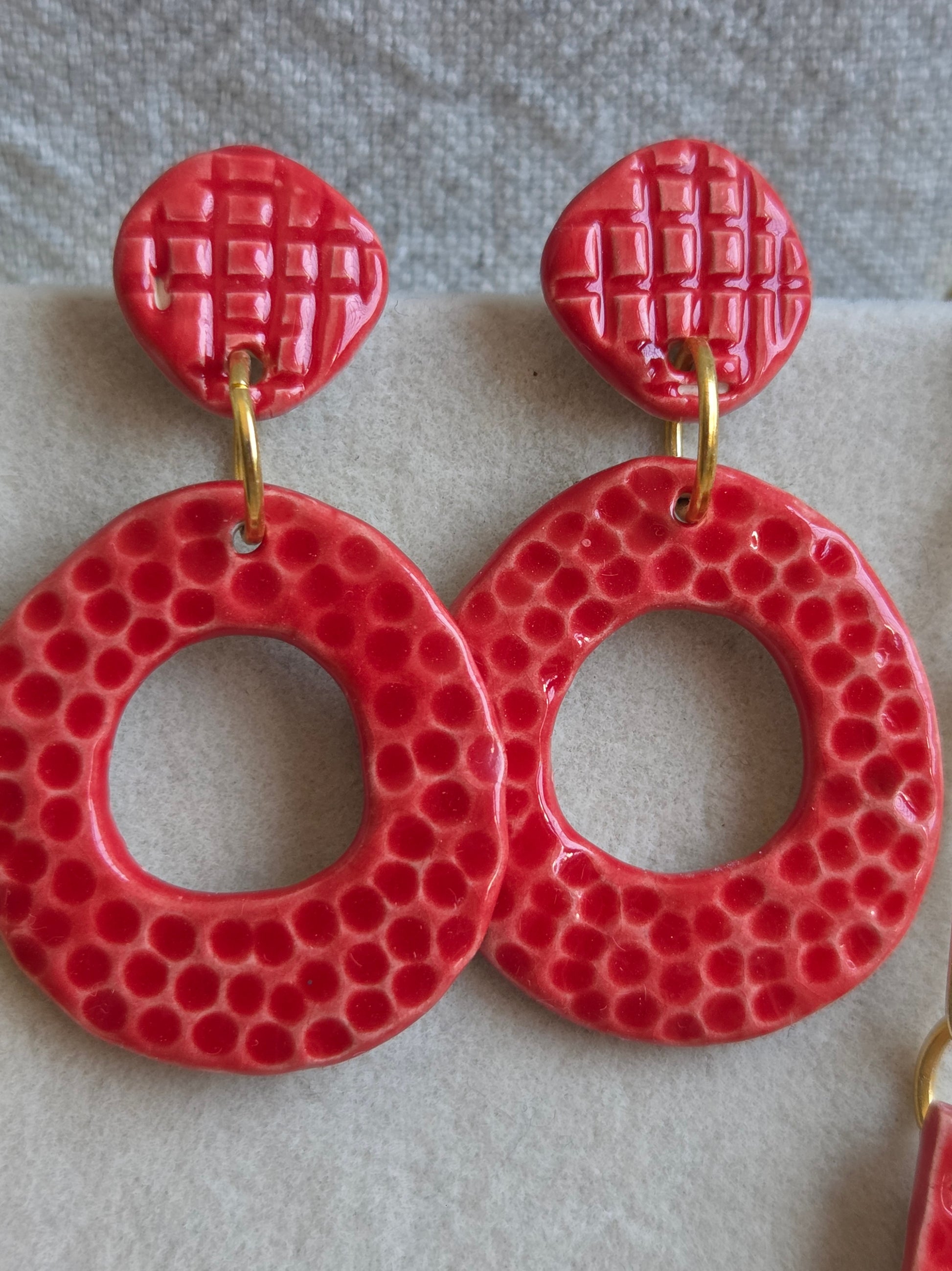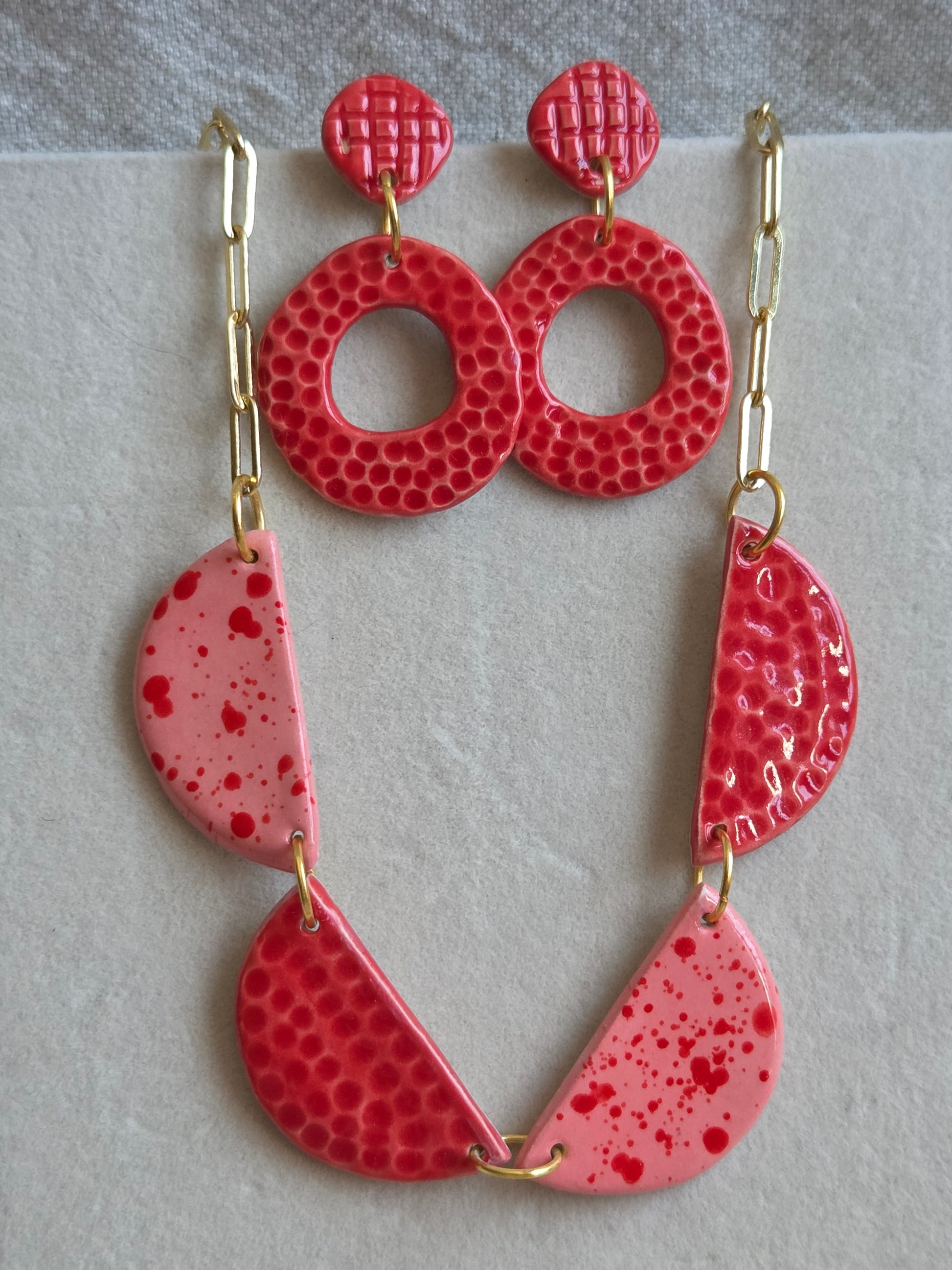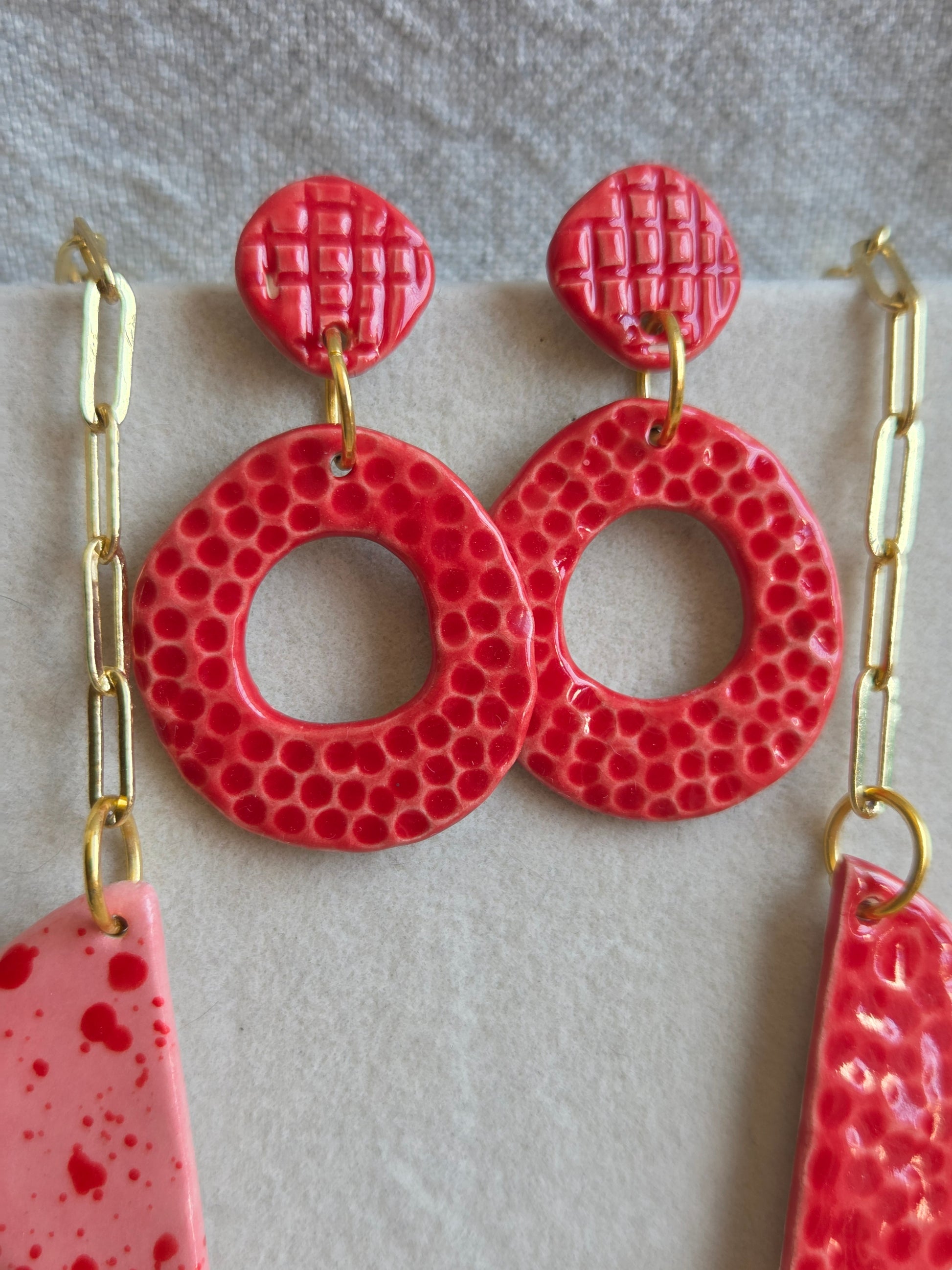 Aros/ Collar rojo y rosado panal con cadena de oro, juntos o separados.