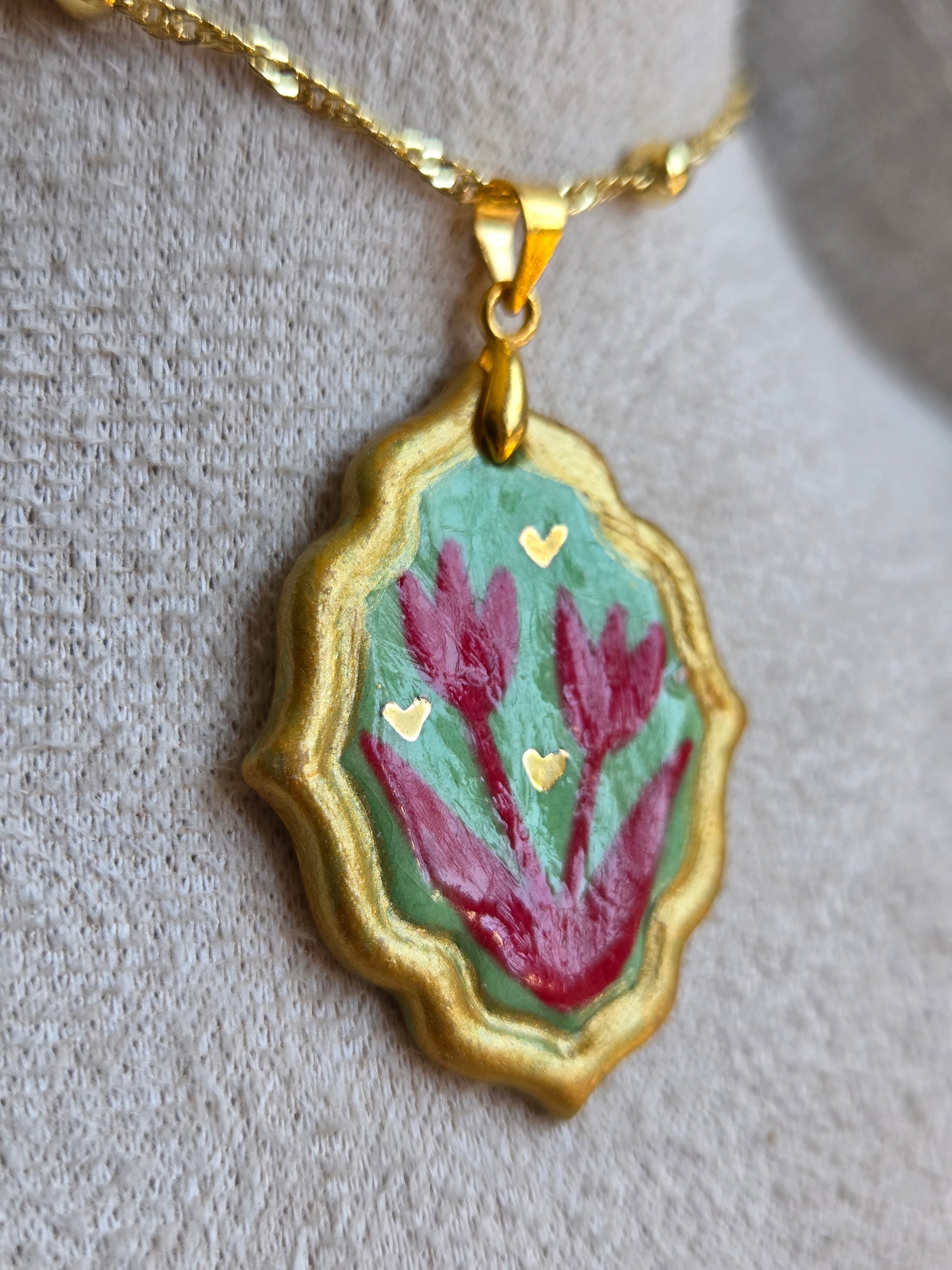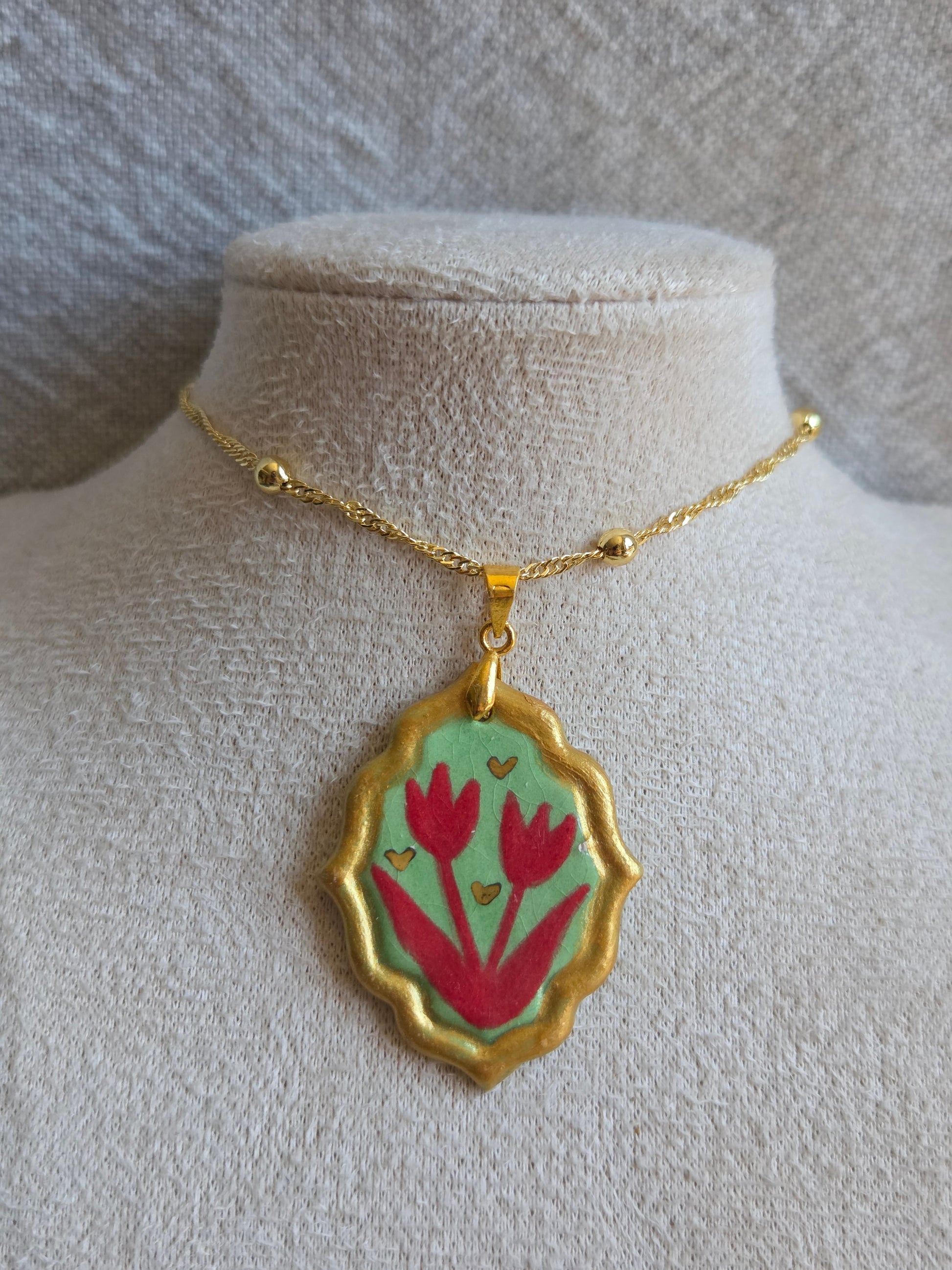 Medalla verde y rojo con pátina dorada, detalles en oro y cadena con baño de oro