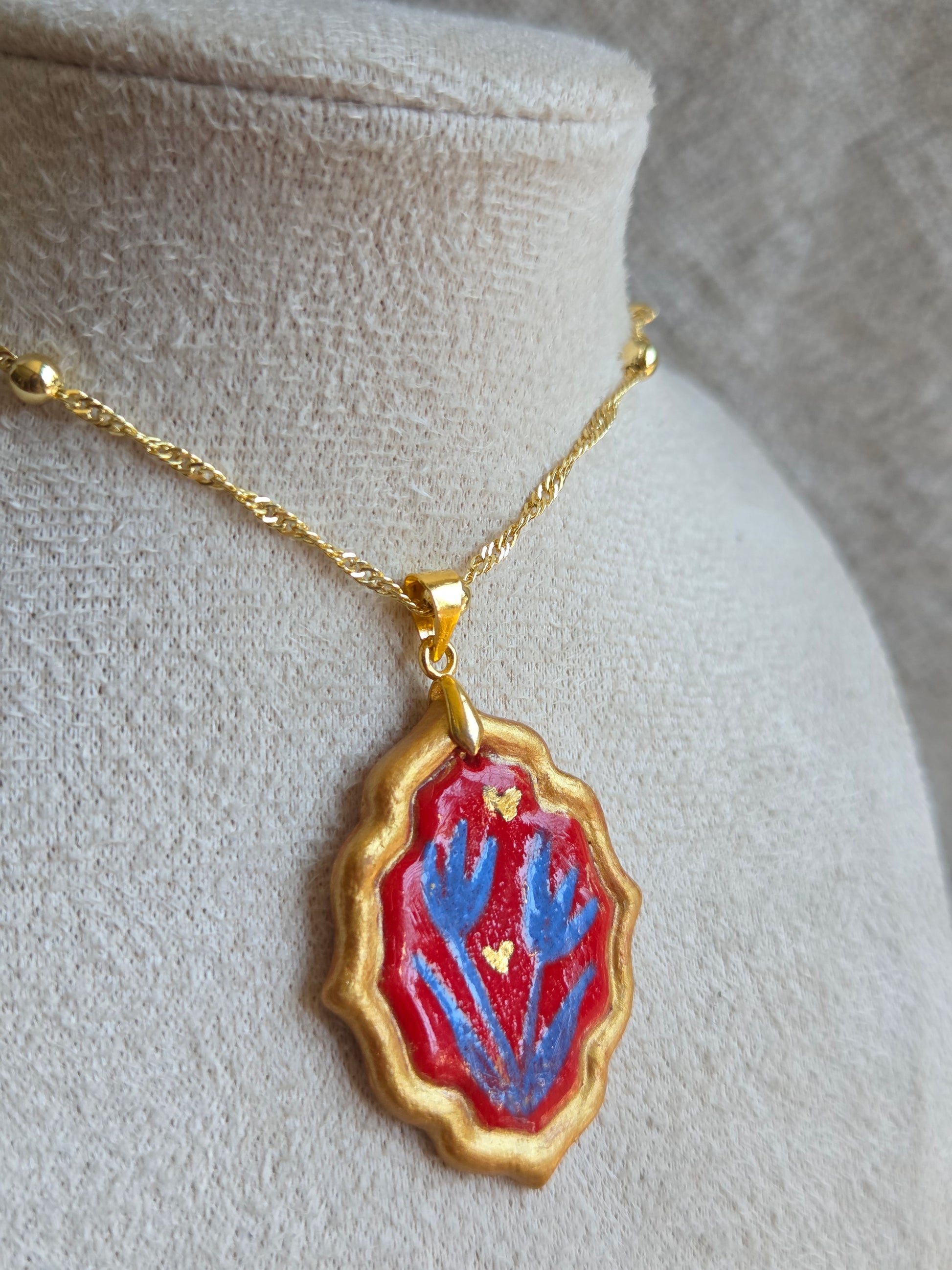 Medalla rojo y azul marino con pátina dorada, detalles en oro y cadena con baño de oro