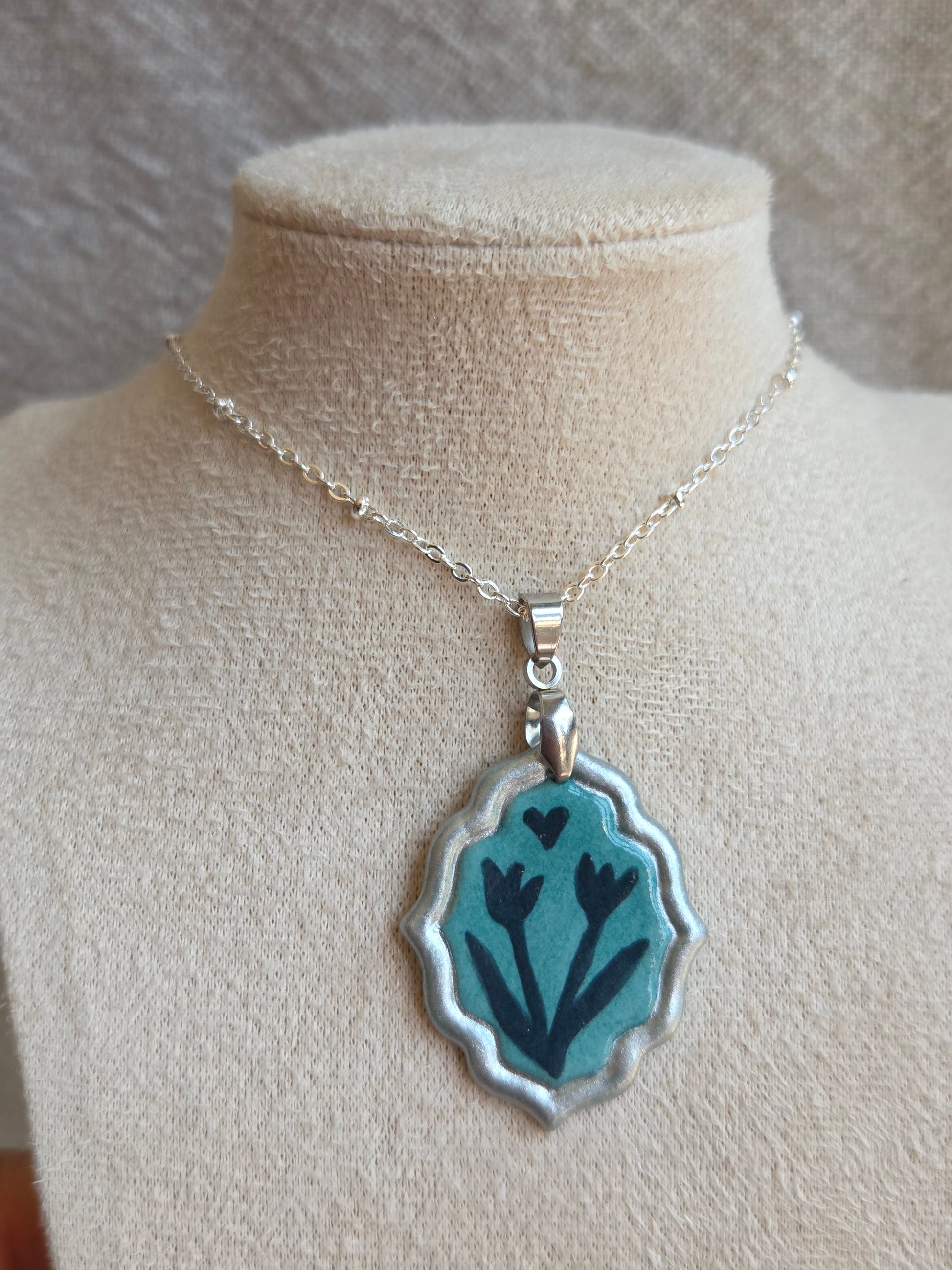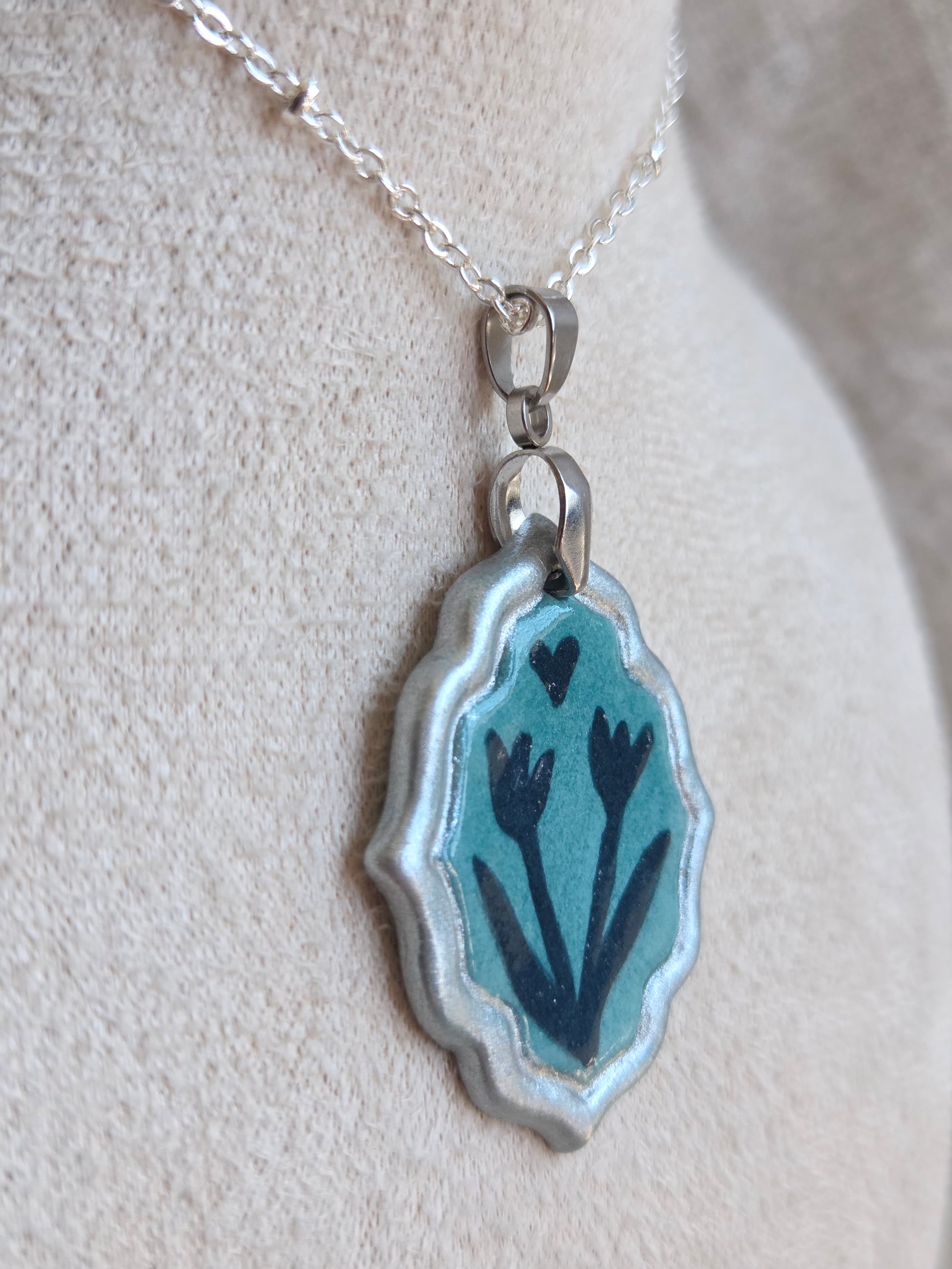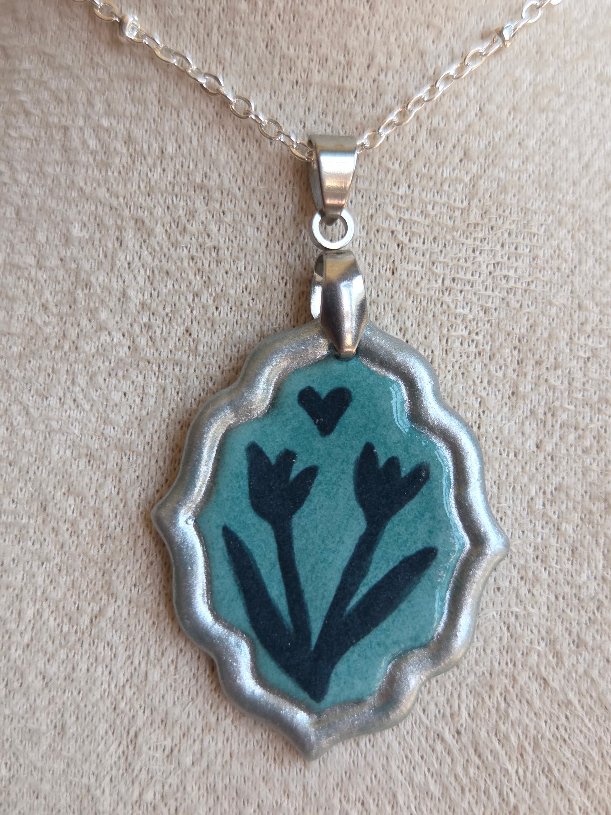 Medalla petróleo y azul marino con pátina plateada y cadena con baño de plata