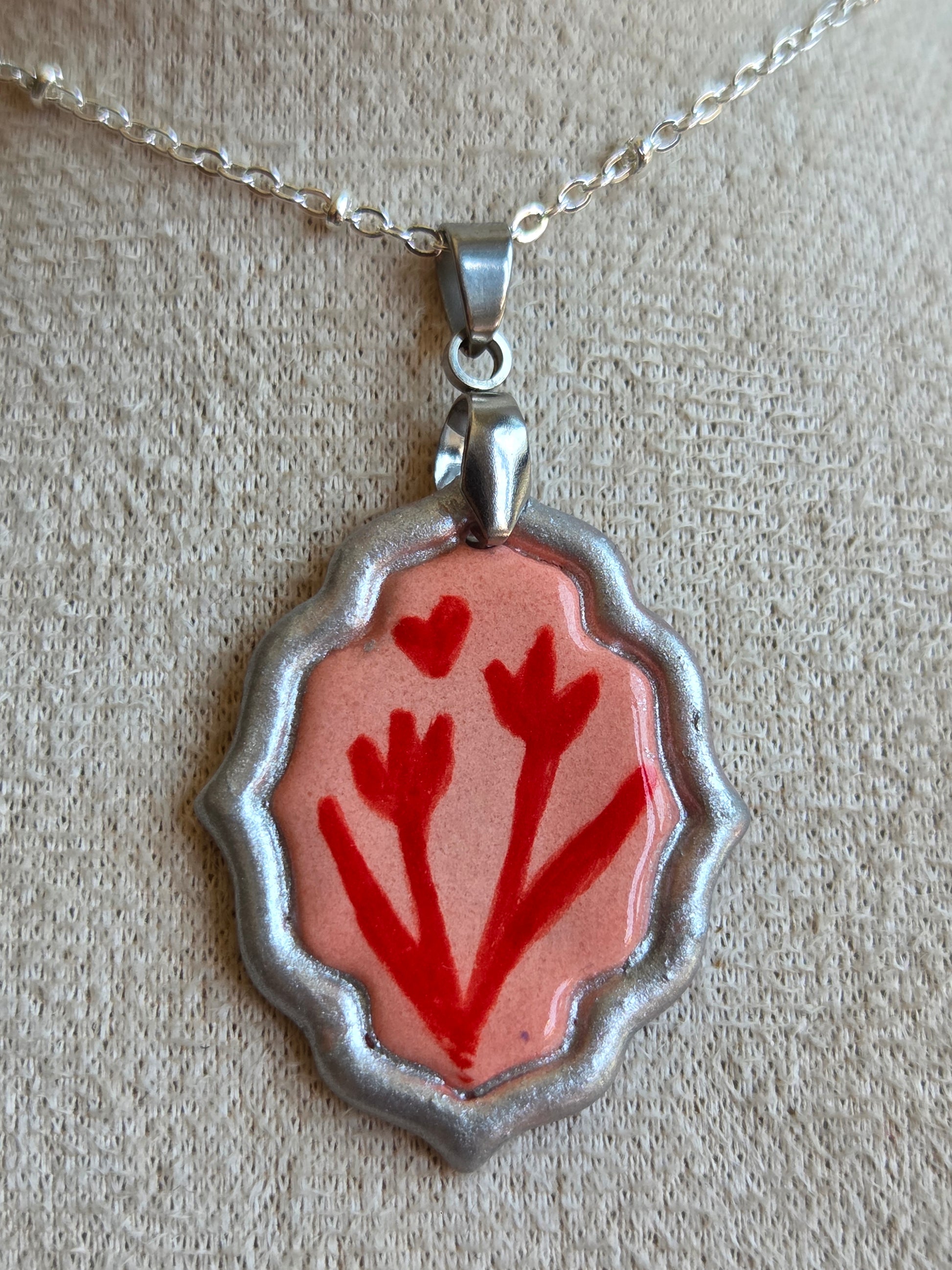 Medalla rosada y rojo con pátina plateada y cadena con baño de plata